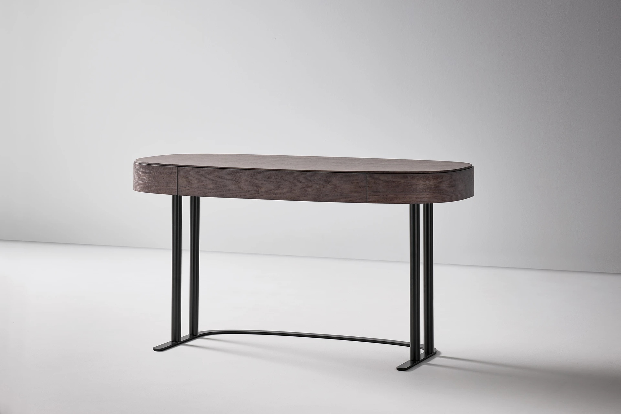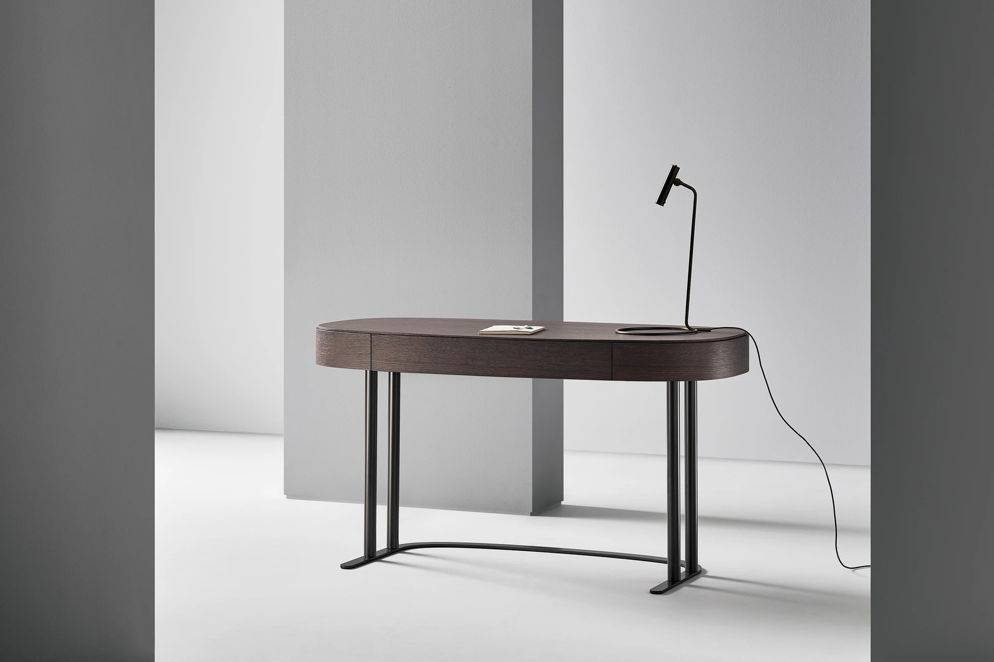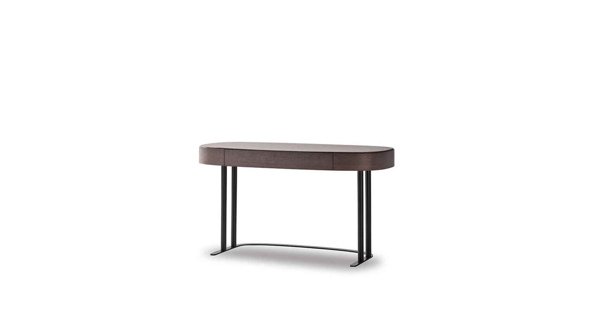 Письменный стол Isabey от Bonaldo отличается трубчатой структурой основания, напоминающей парные колонны — узнаваемый архитектурный элемент классической традиции. Игра между массивными объёмами столешницы и более лёгким основанием создаёт баланс тяжести и воздушности, устойчивости и парения. Прямоугольная столешница со смягчёнными углами доступна в нескольких породах дерева.