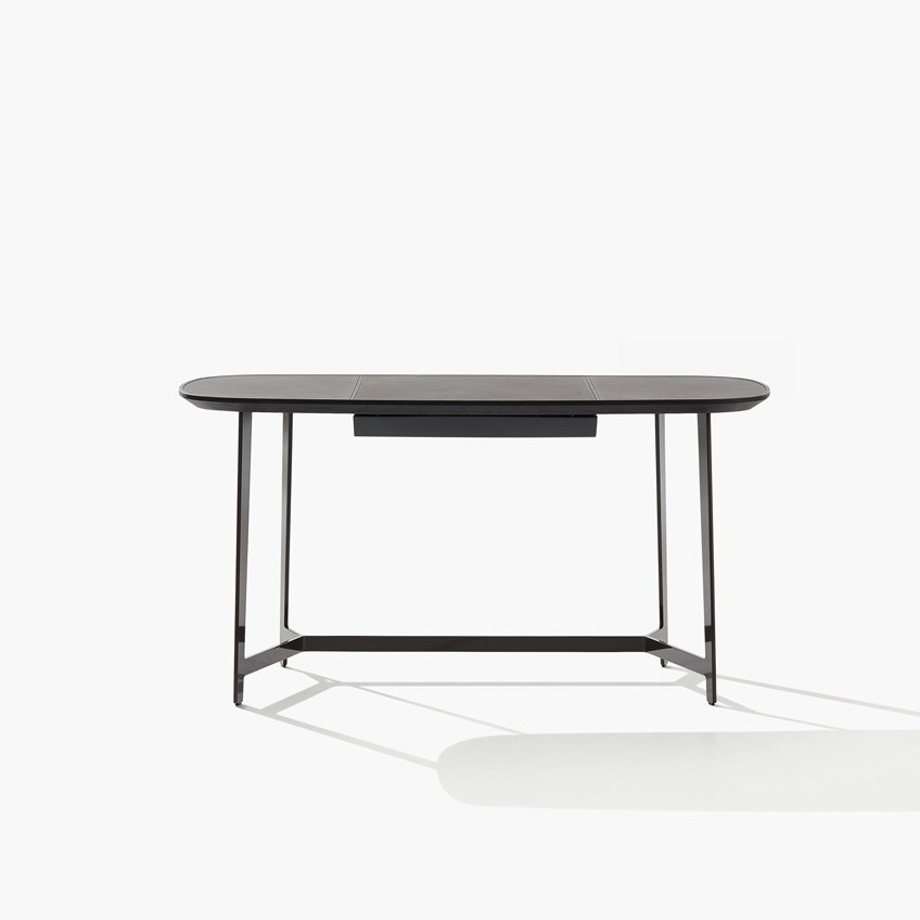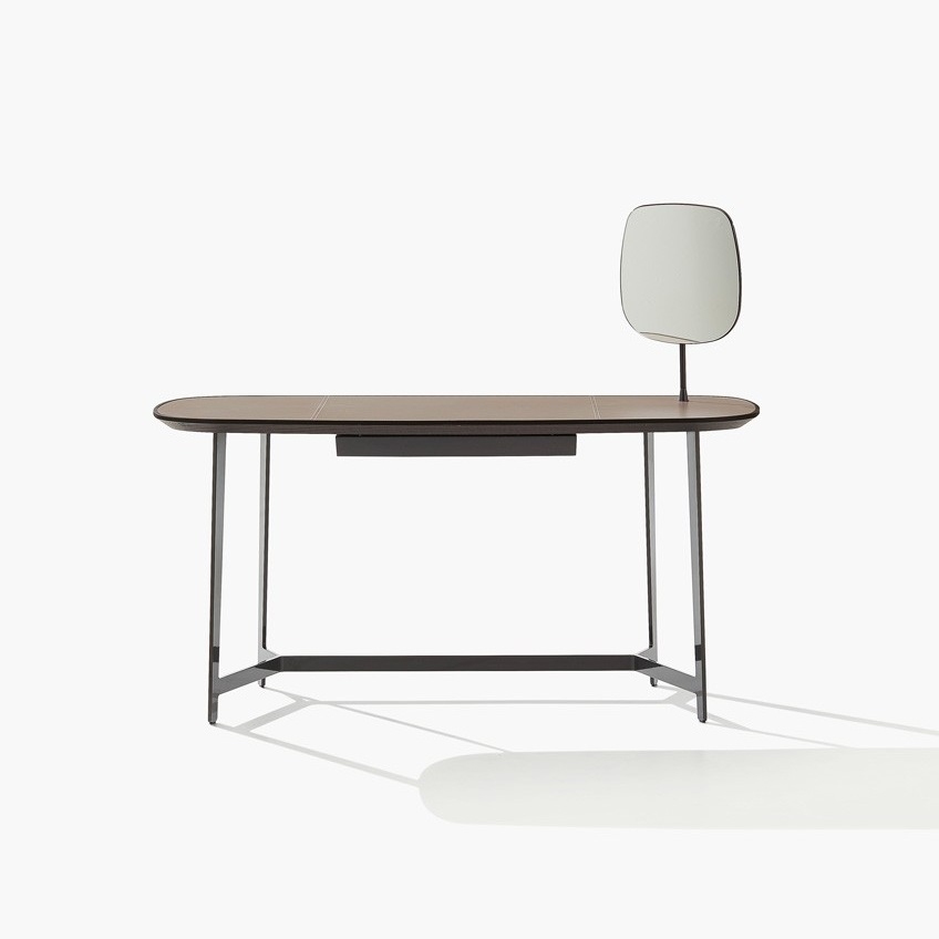 Стол Mathieu PoliformMathieu, разработанный для Эммануэля Галлина для Poliform, представляет собой письменный стол с окрашенной металлической конструкцией, столешницей с рамой из массива дерева и кожаной вставкой. Дополнительный ящик под столешницей и зеркало.