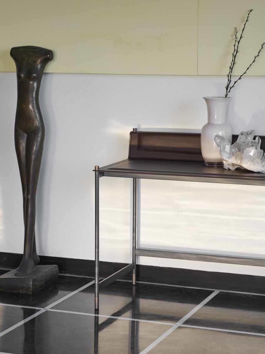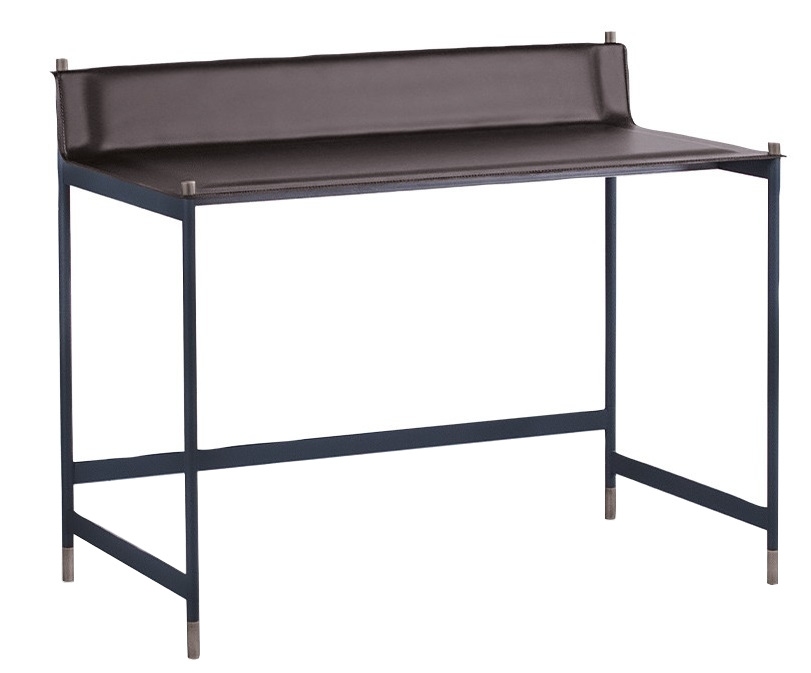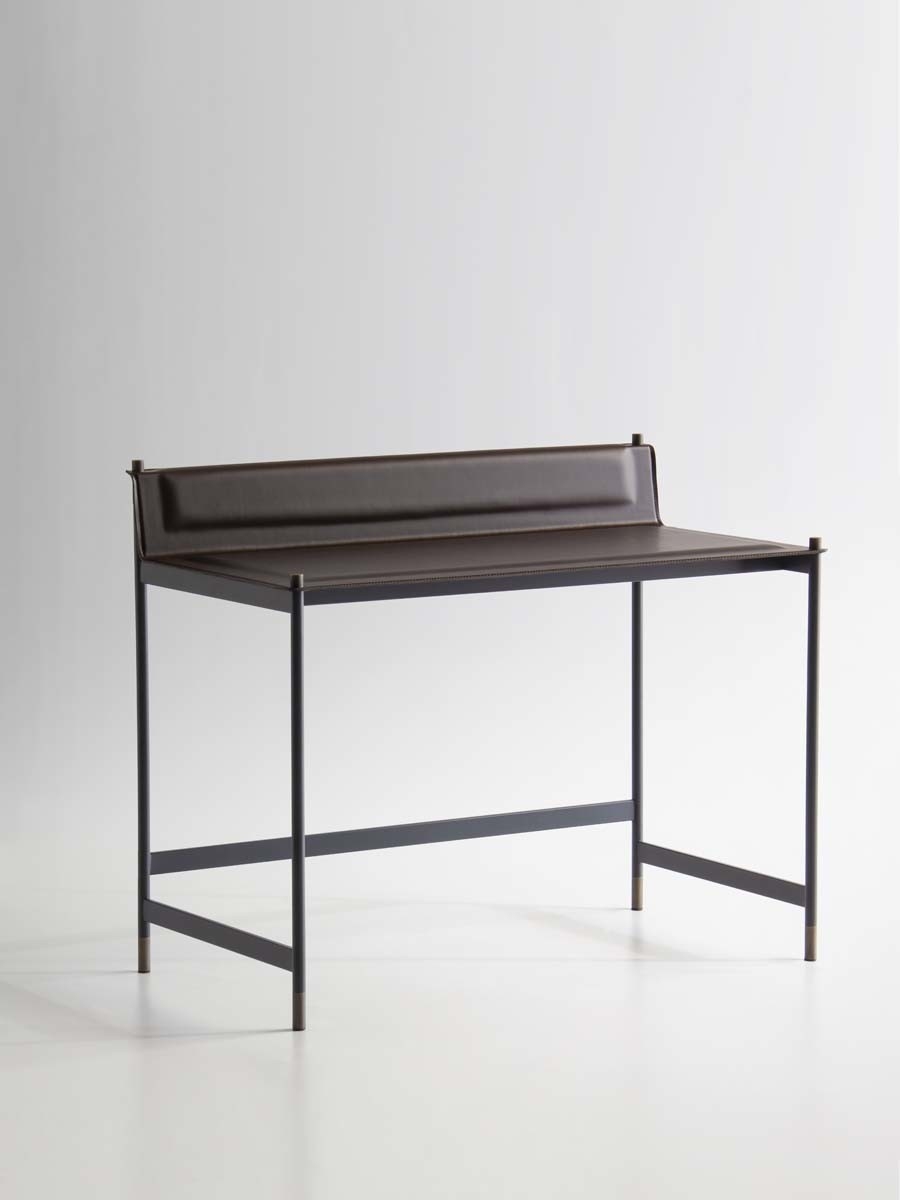 Письменный стол Terrazzo Potocco Terrazzo, разработанный Николой Бонрипози для Potocco, представляет собой письменный стол со структурой из трубчатой стали с порошковым покрытием с тисненой антрацитовой отделкой, с деталями для ног и цилиндрическими крепежными деталями для столешницы с отделкой из полированной латуни. Верх с мягкой вставкой из вспененного полиуретана, обтянутый кожей и отделанный видимой строчкой по периметру.