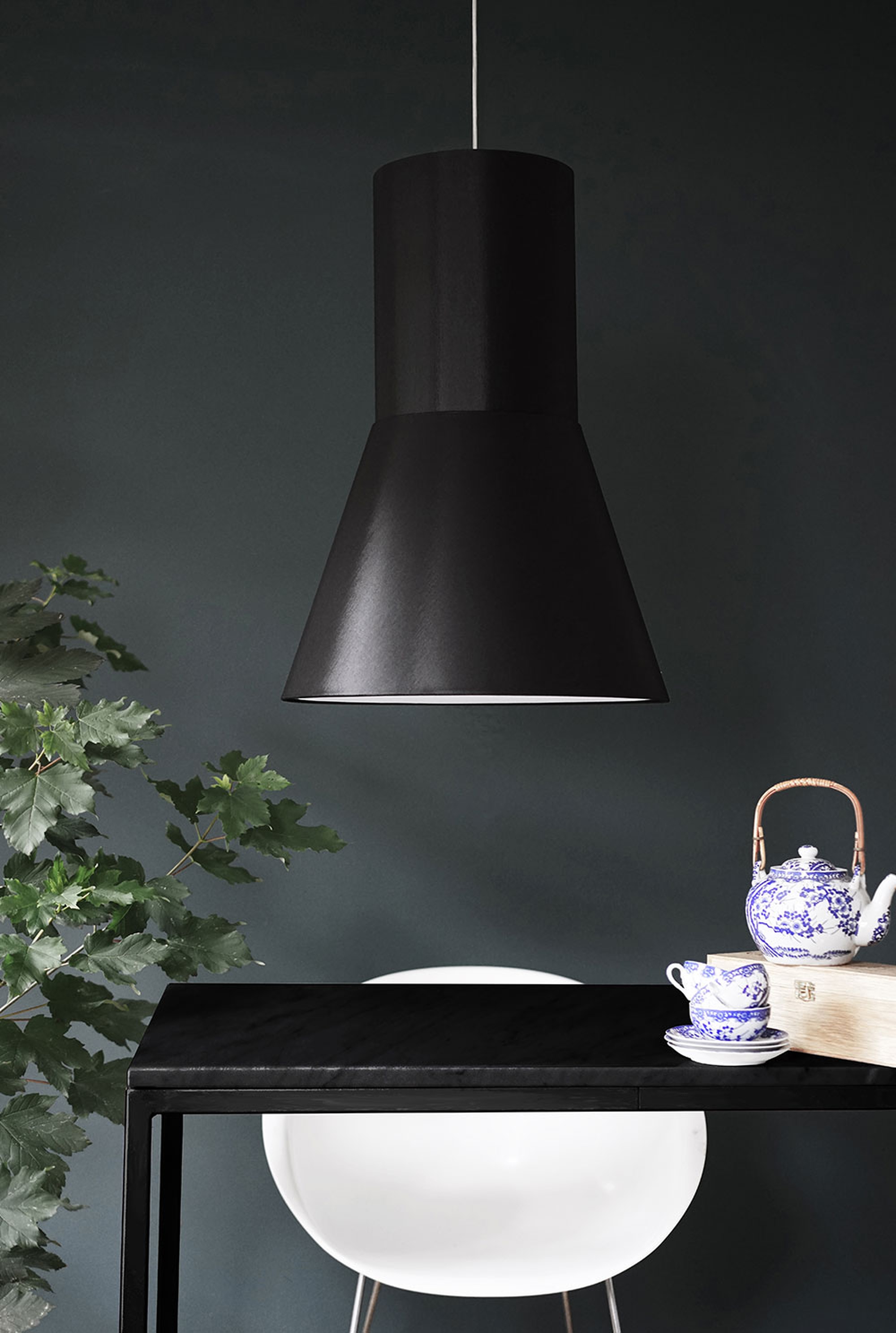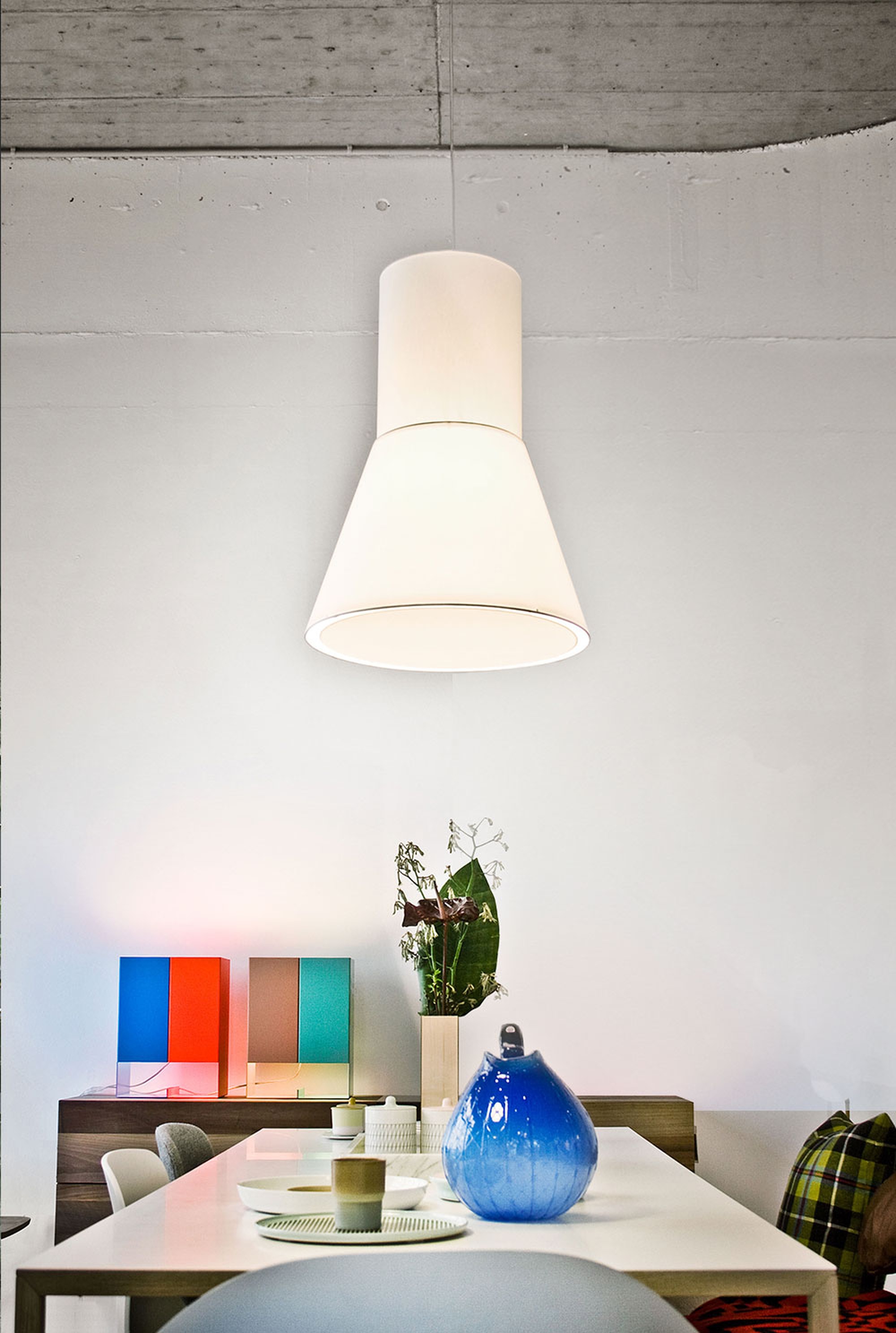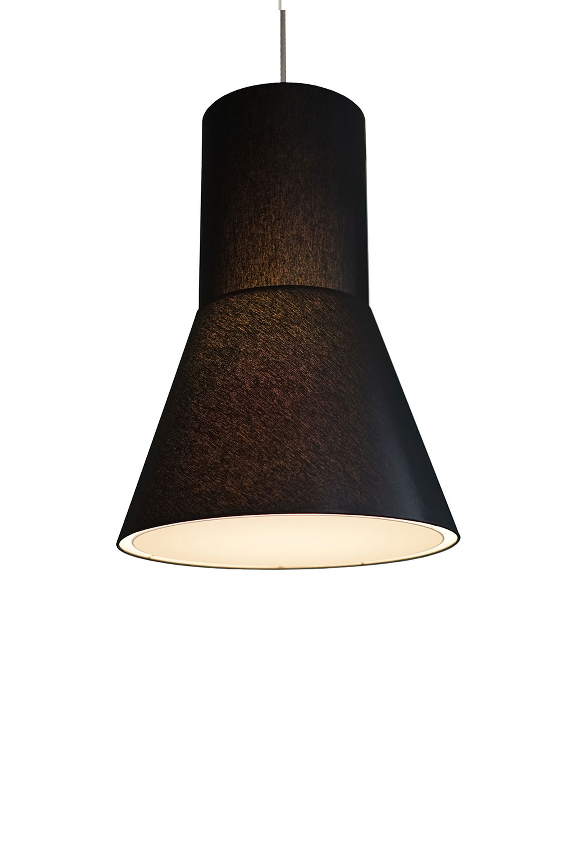 Конструкция объединяет большой конический и меньший цилиндрический абажуры из ситца — они доступны в широкой палитре оттенков: от светлых акцентов до гармоничных землистых тонов. Съёмные плафоны завершают облик светильника и скрывают лампочку.