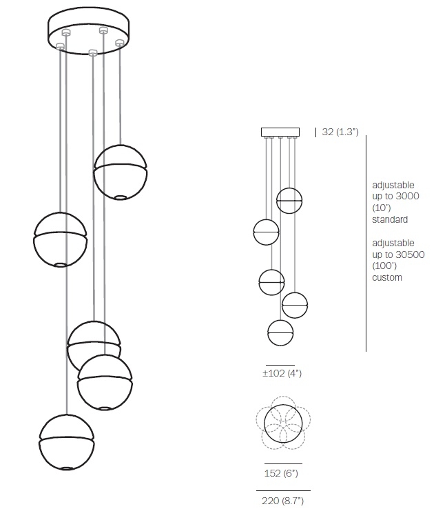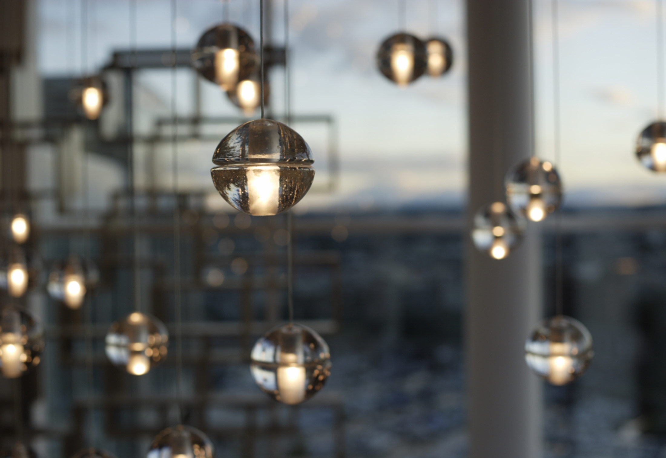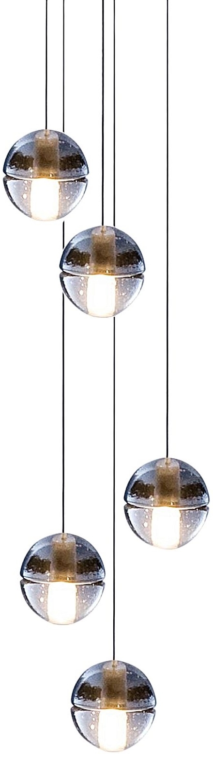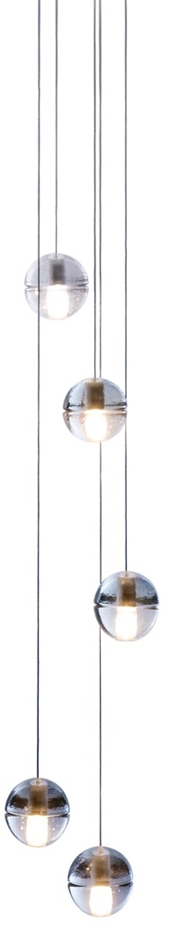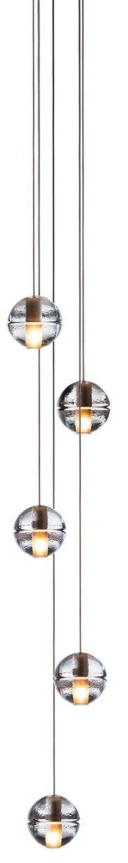 Подвесной светильник 14.5 Bocci 14.5 из серии 14, разработанный Омером Арбелем для Bocci, представляет собой подвесной светильник с 5 стеклянными сферами. Каждая сфера изготовлена из выдувного боросиликатного стекла. Внутри имеется полость, в которой находится низковольтная светодиодная или ксеноновая лампа. Стекло доступно в прозрачном, сером или янтарном цвете.