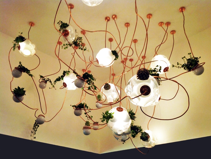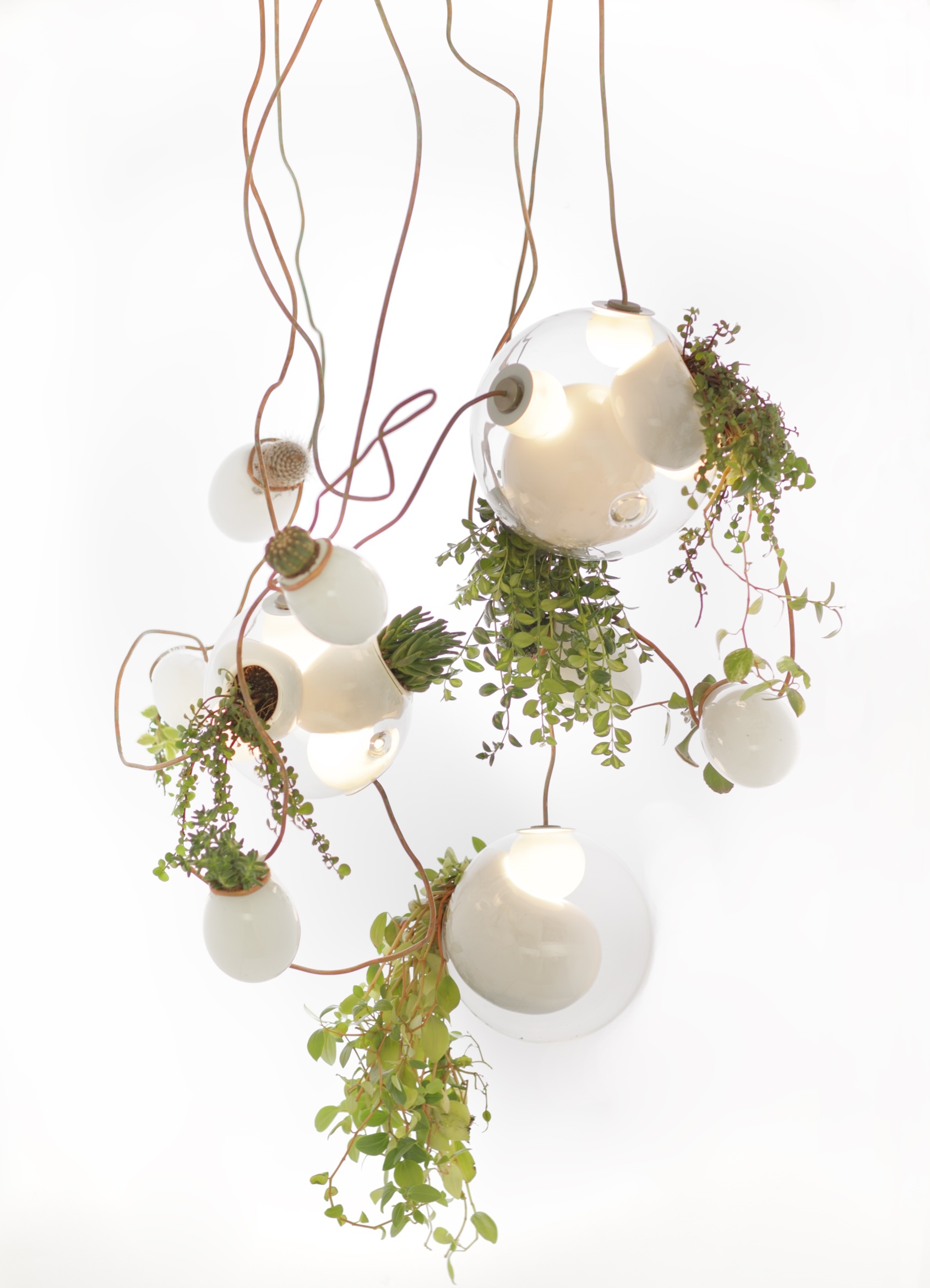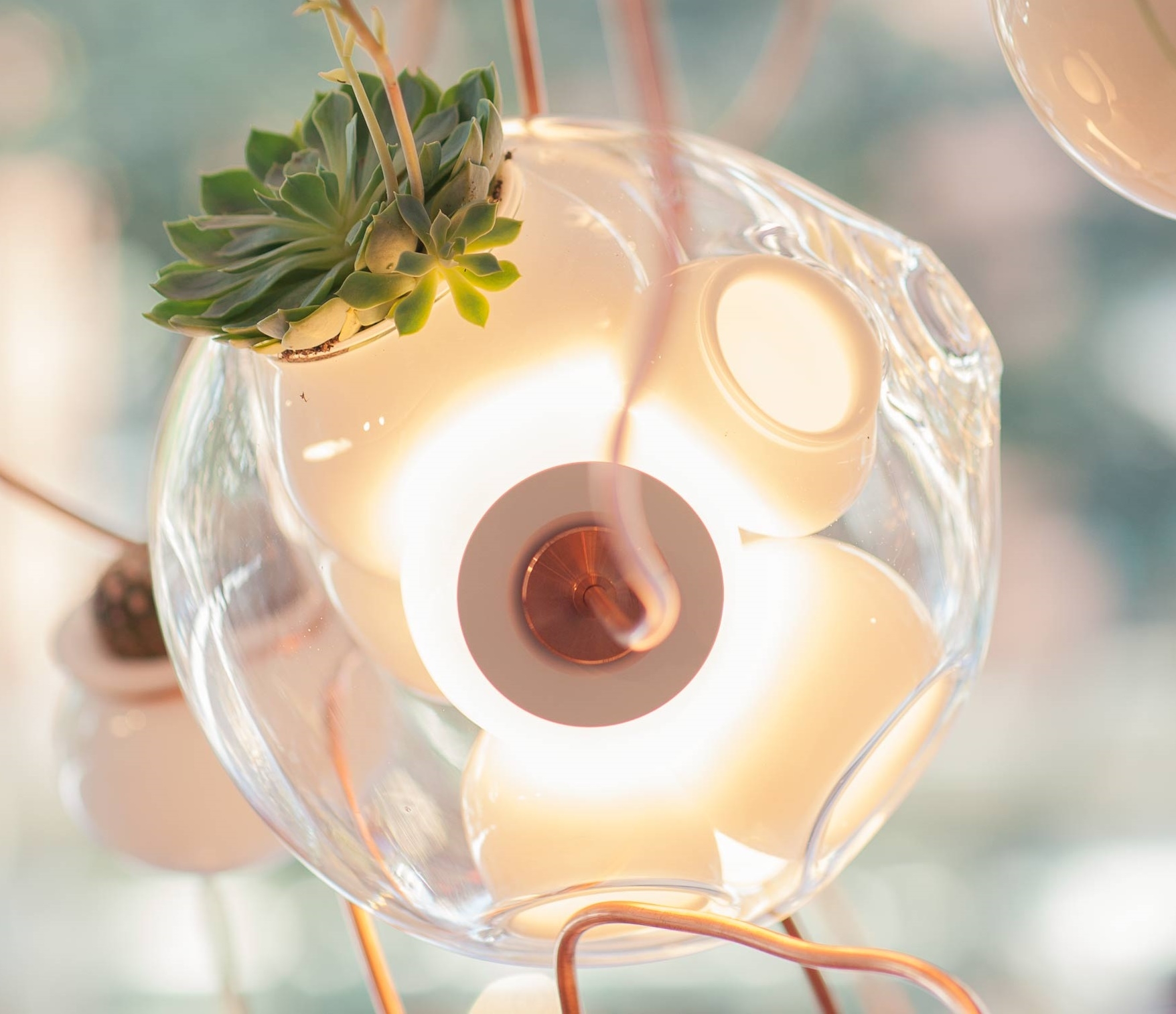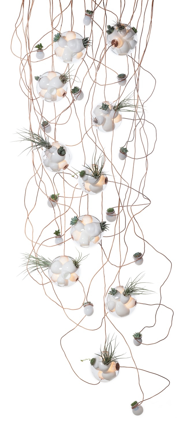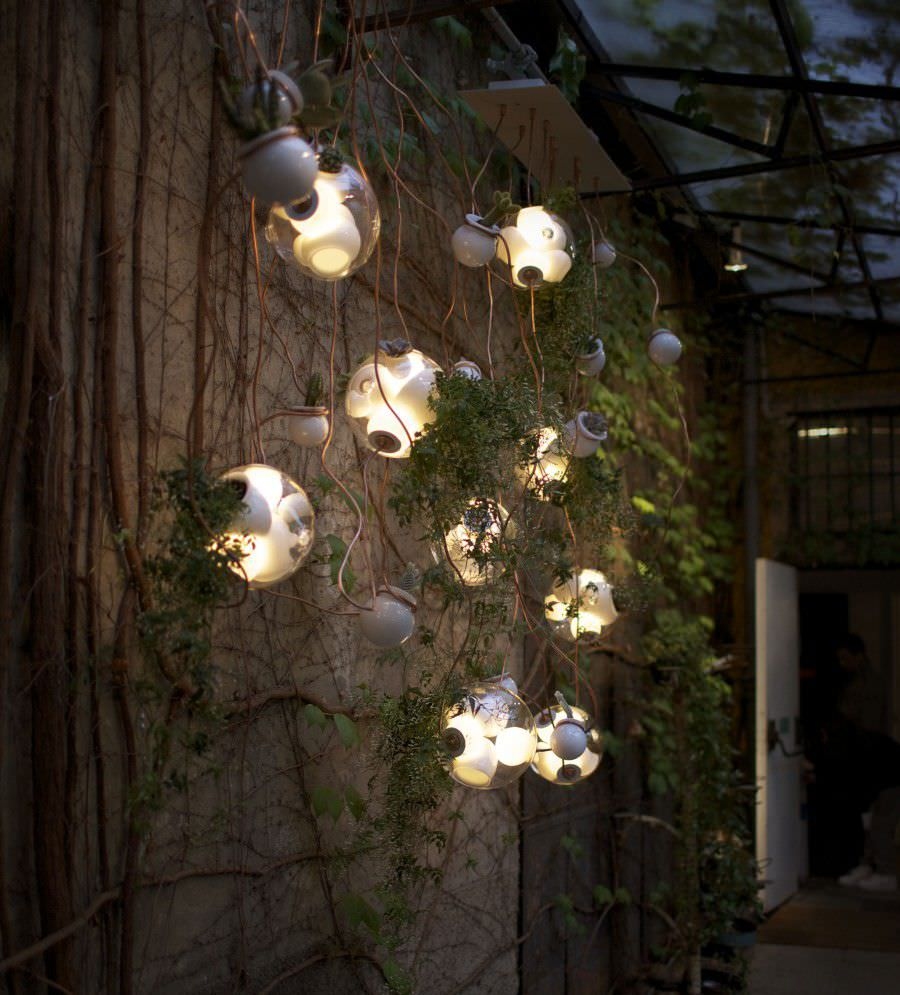 38 Подвесной светильник Bocci38 — серия подвесных светильников, разработанная Омером Арбелем для Bocci. Серия 38 выводит на высший уровень ремесленную технику, разработанную для серии 28. Большая стеклянная сфера создается путем выдувания в ней различных полостей в произвольном порядке. Некоторые из этих спутниковых полостей достаточно глубоки, чтобы содержать почву и растения, а другие служат элементами освещения. В каждой сфере находятся два-три светильника и одно-два растения. В зависимости от мастерства диаметр, размер и количество сателлитных полостей могут варьироваться. Доступен в разных версиях.