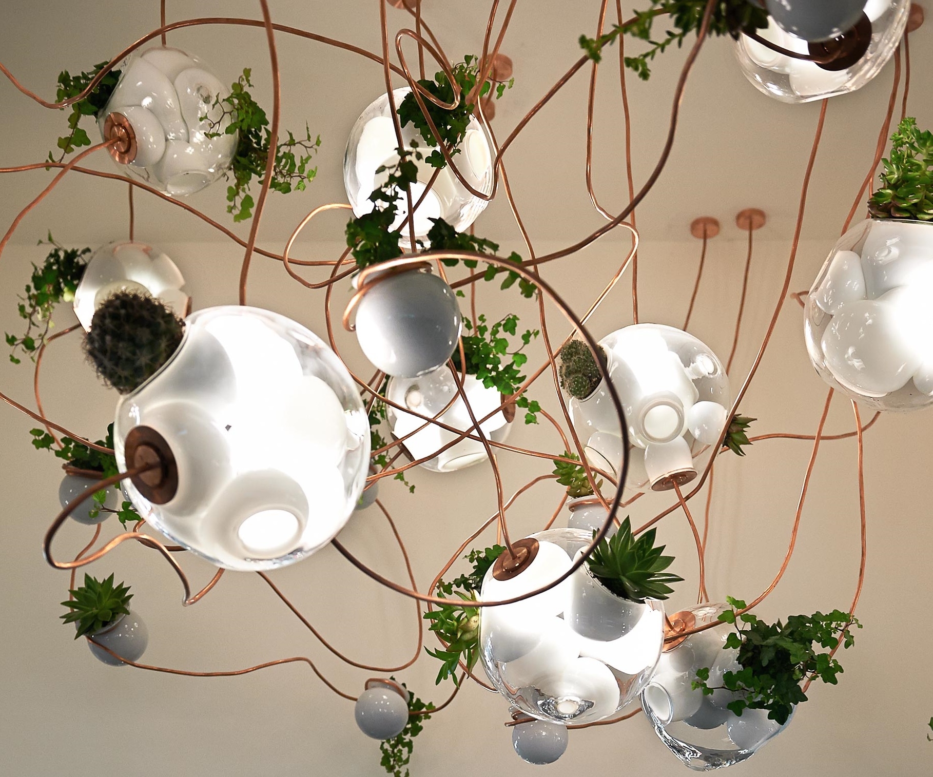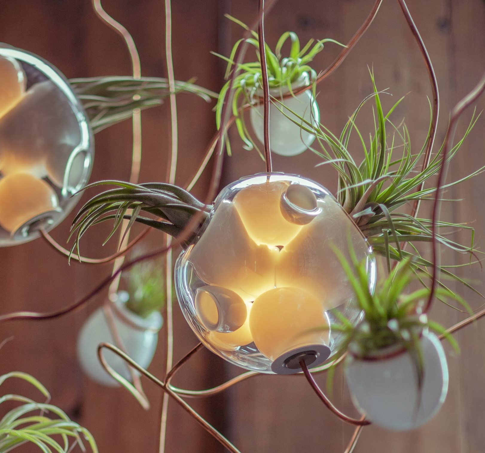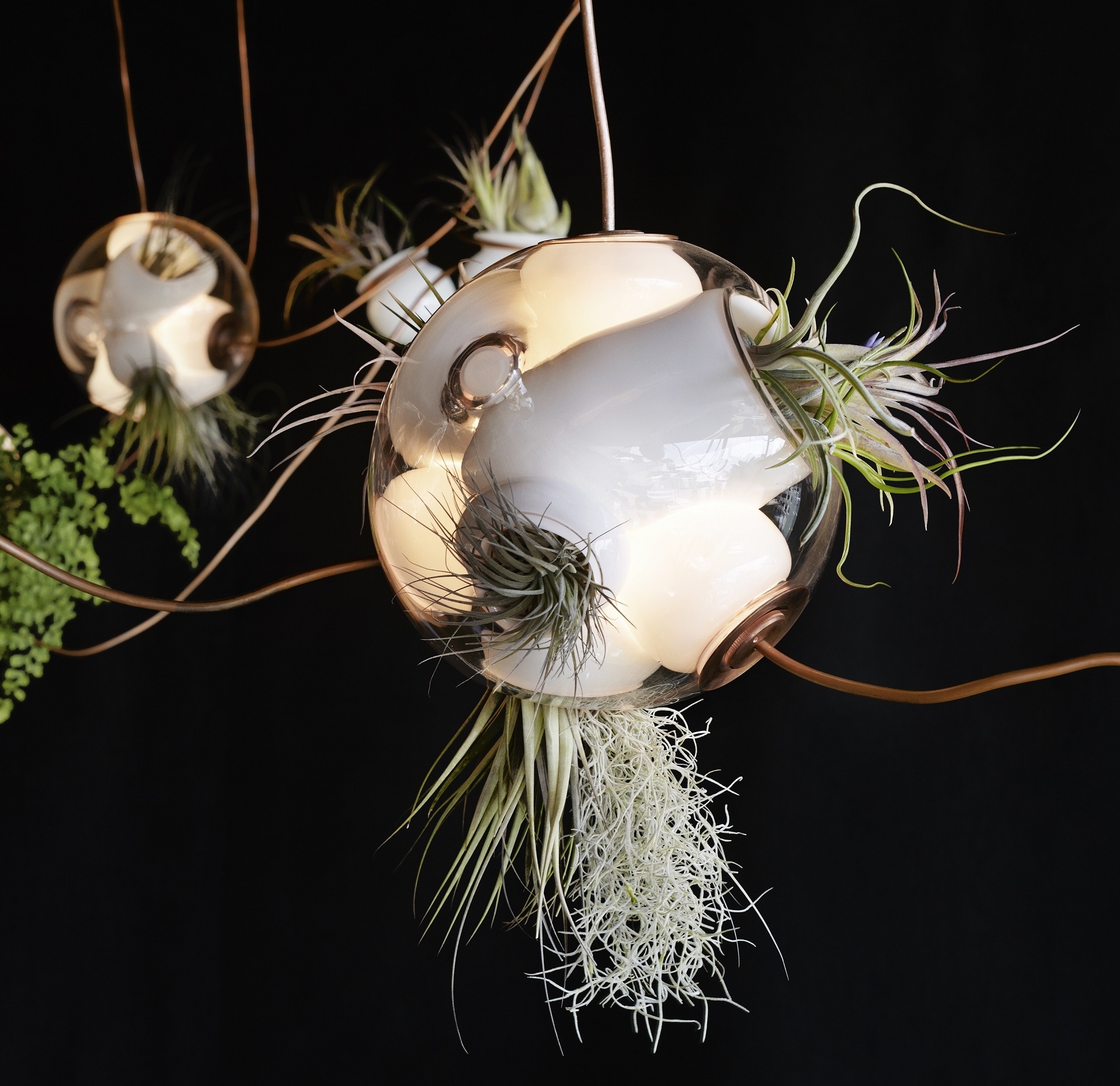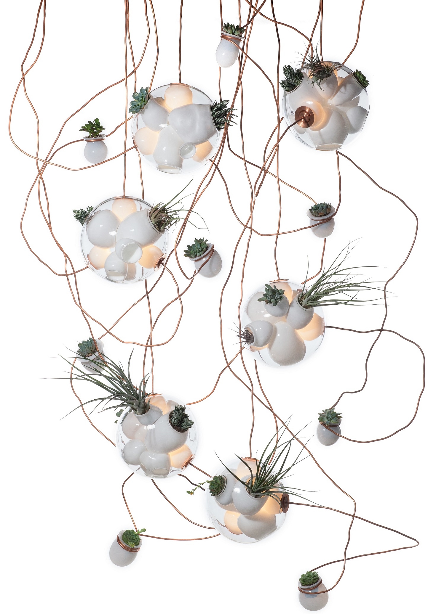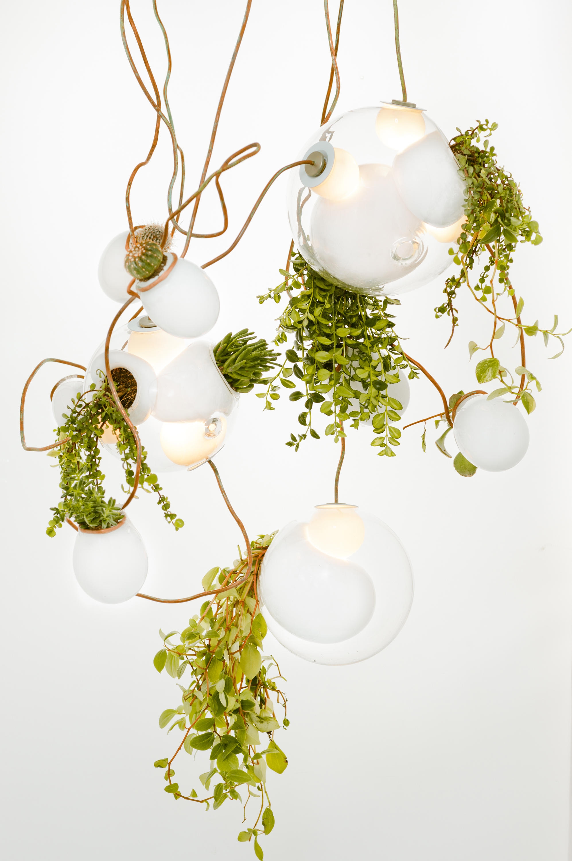 38 Подвесной светильник Bocci38 — серия подвесных светильников, разработанная Омером Арбелем для Bocci. Серия 38 выводит на высший уровень ремесленную технику, разработанную для серии 28. Большая стеклянная сфера создается путем выдувания в ней различных полостей в произвольном порядке. Некоторые из этих спутниковых полостей достаточно глубоки, чтобы содержать почву и растения, а другие служат элементами освещения. В каждой сфере находятся два-три светильника и одно-два растения. В зависимости от мастерства диаметр, размер и количество сателлитных полостей могут варьироваться. Доступен в разных версиях.