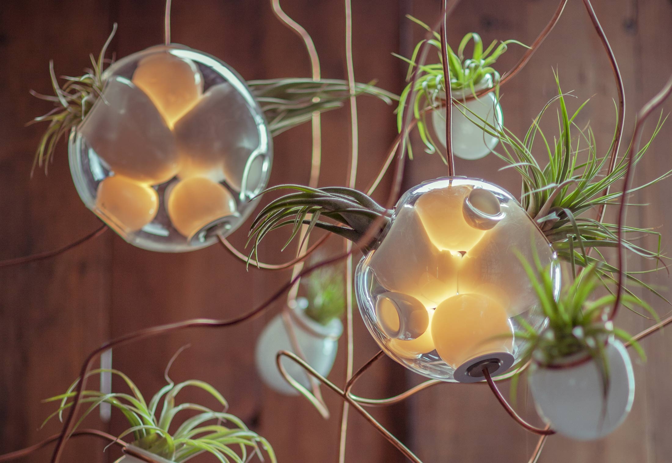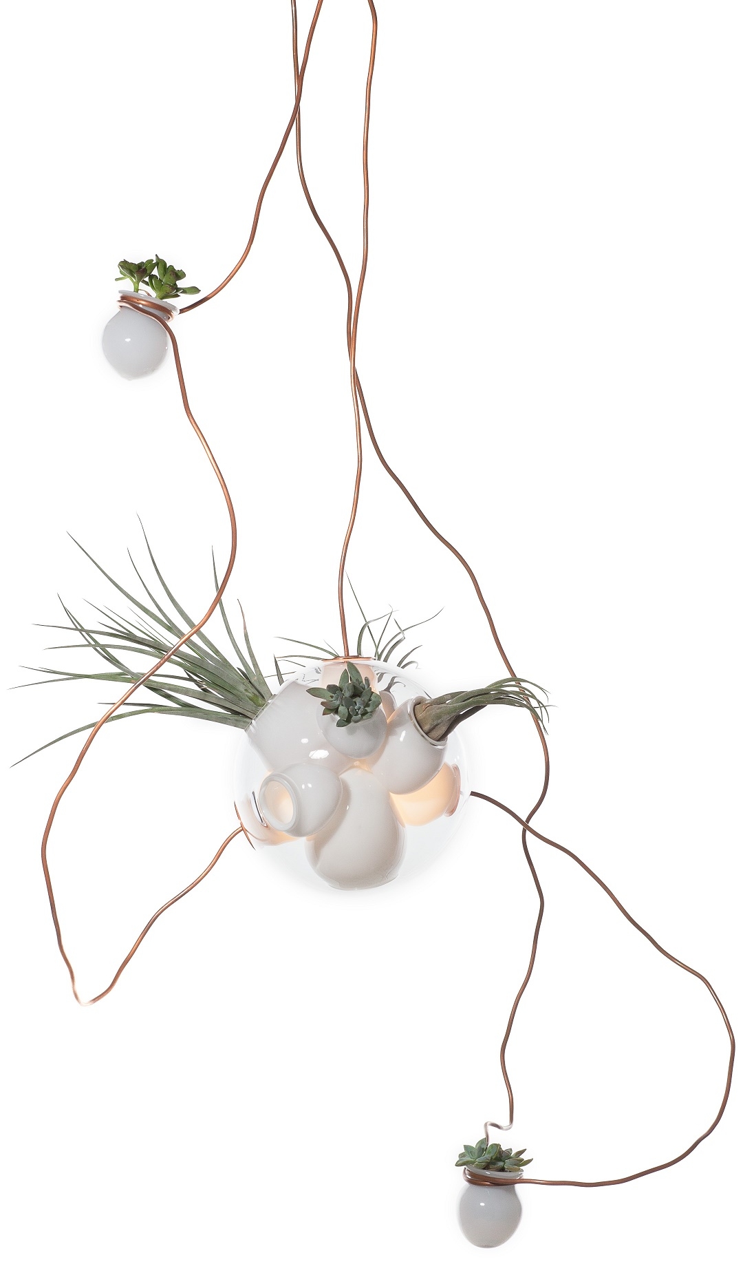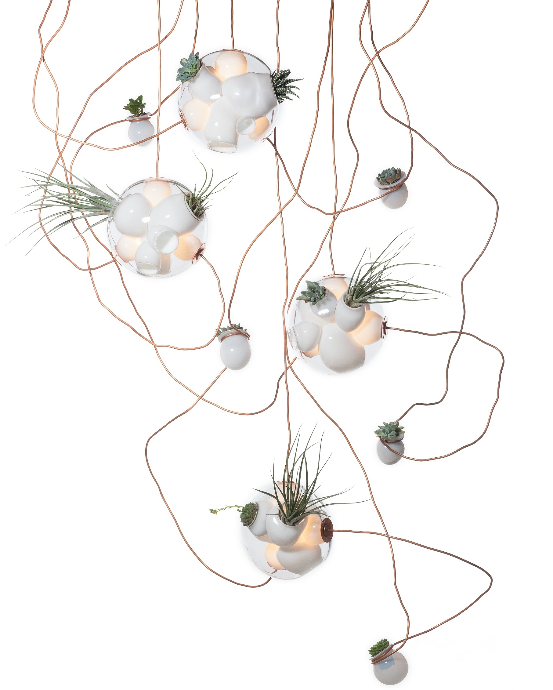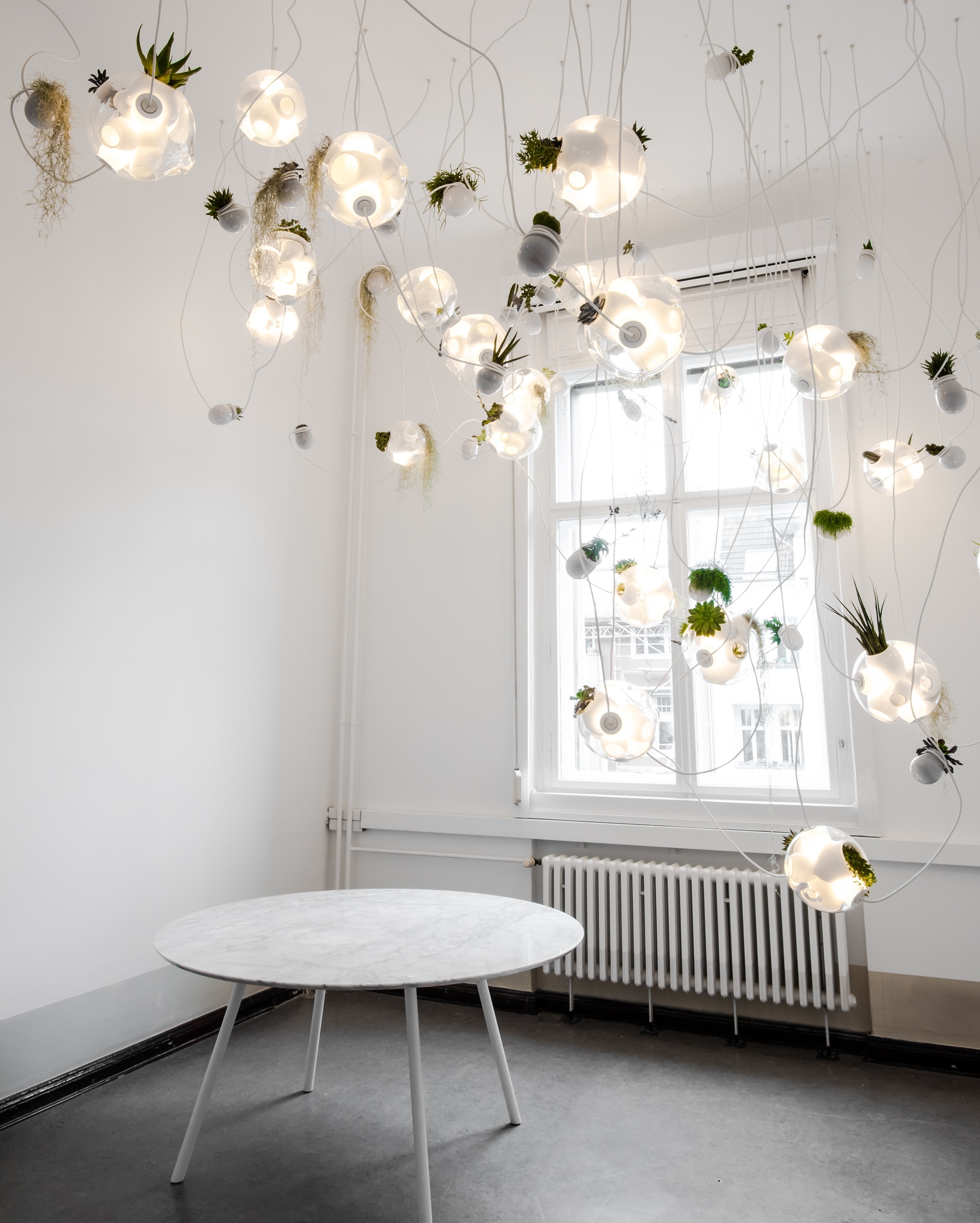 38 Подвесной светильник Bocci38 — серия подвесных светильников, разработанная Омером Арбелем для Bocci. Серия 38 выводит на высший уровень ремесленную технику, разработанную для серии 28. Большая стеклянная сфера создается путем выдувания в ней различных полостей в произвольном порядке. Некоторые из этих спутниковых полостей достаточно глубоки, чтобы содержать почву и растения, а другие служат элементами освещения. В каждой сфере находятся два-три светильника и одно-два растения. В зависимости от мастерства диаметр, размер и количество сателлитных полостей могут варьироваться. Доступен в разных версиях.