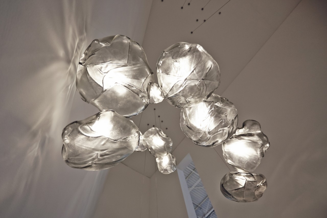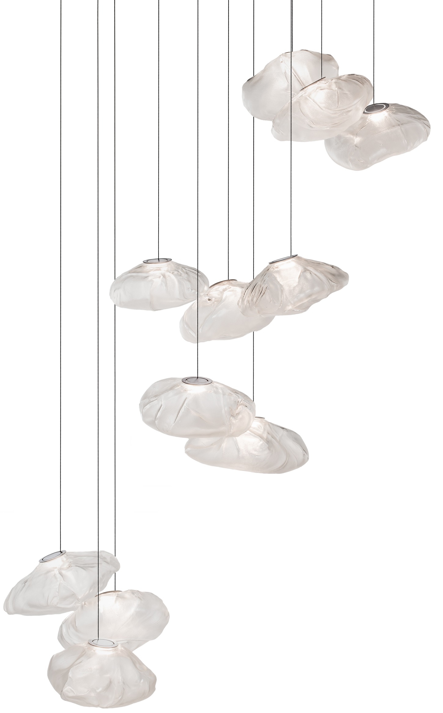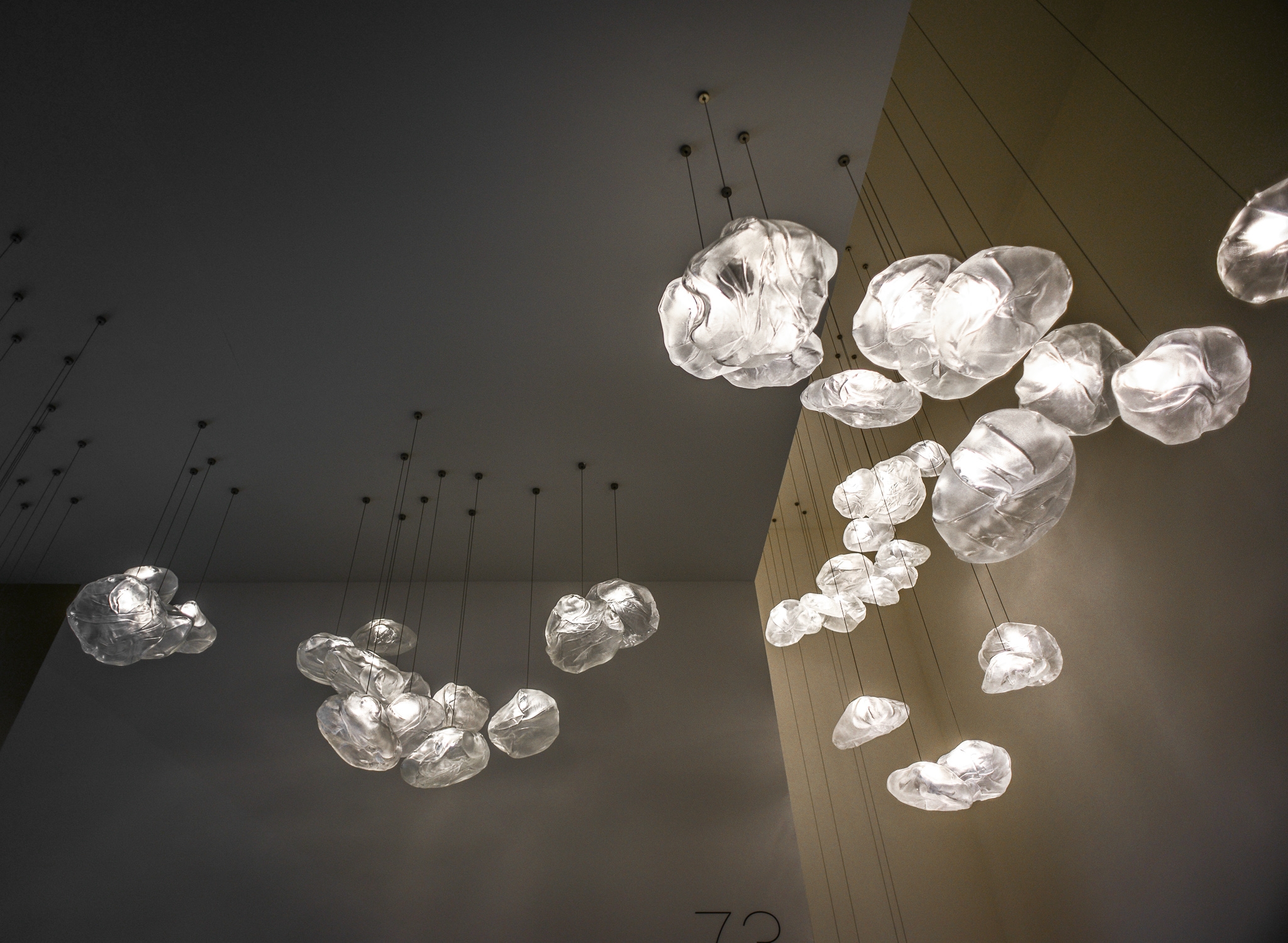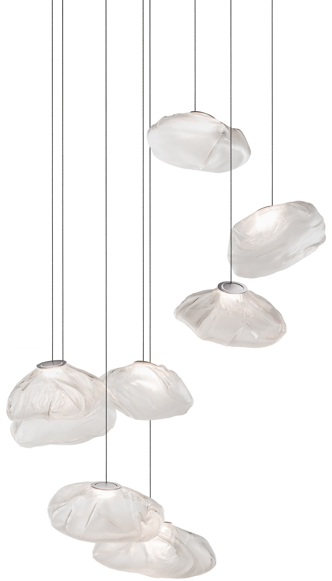 73 Подвесной светильник Bocci73 — серия подвесных светильников, разработанная Омером Арбелем для Bocci. Его получают путем выдувания жидкого стекла внутри вазы из керамического волокна неправильной формы, устойчивой к высоким температурам. Полученная форма время от времени структурно напоминает текстуру ткани, которая становится окончательной при остывании. Тонкий светодиод расположен так, чтобы заполнить весь объем рассеянным светом, чтобы подчеркнуть объемное восприятие произведения. В силу особенностей производства каждый светильник уникален в своей специфике. Серия 73 была создана для создания утонченных композиций, напоминающих облака. Доступен в разных версиях.