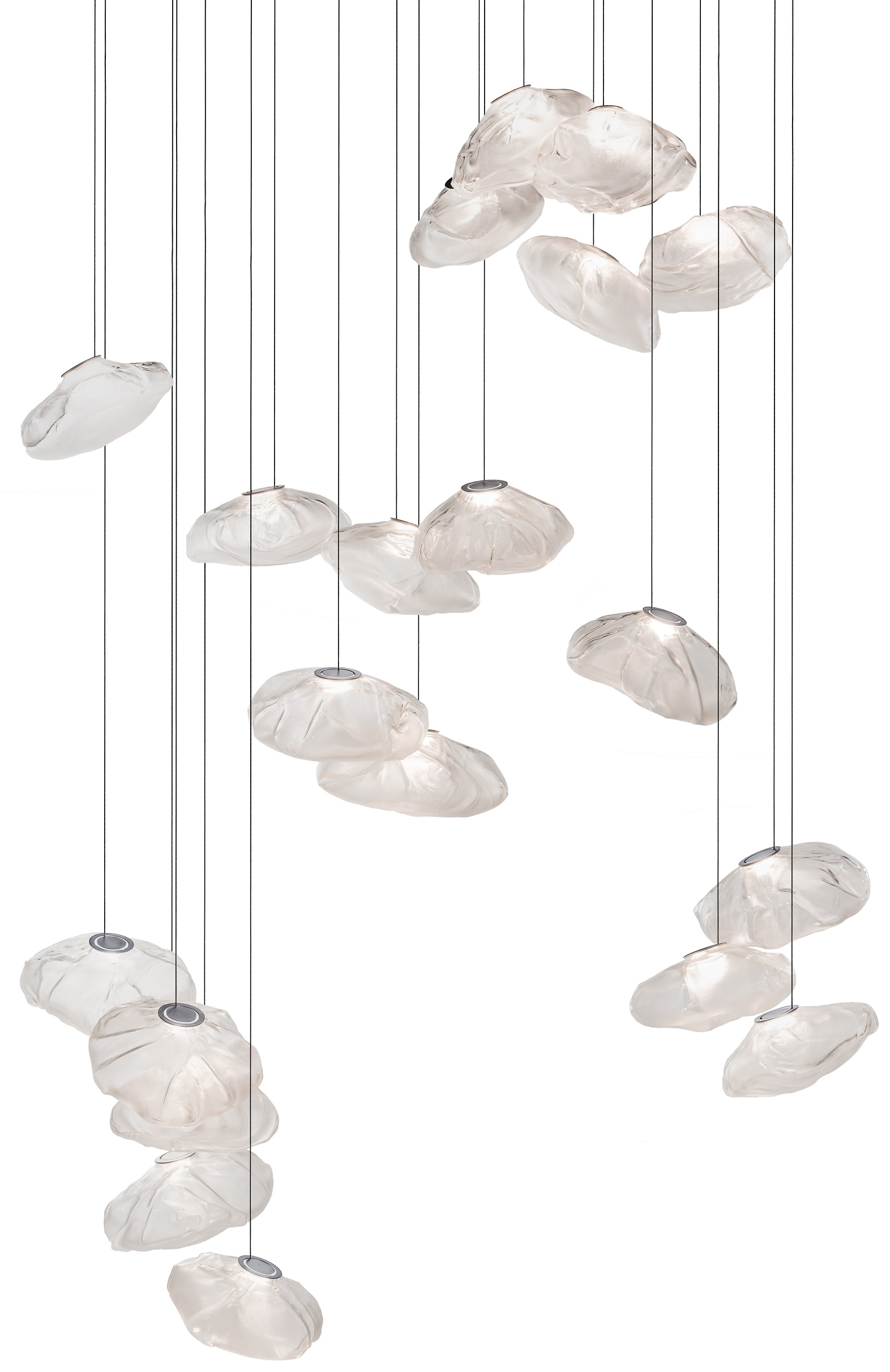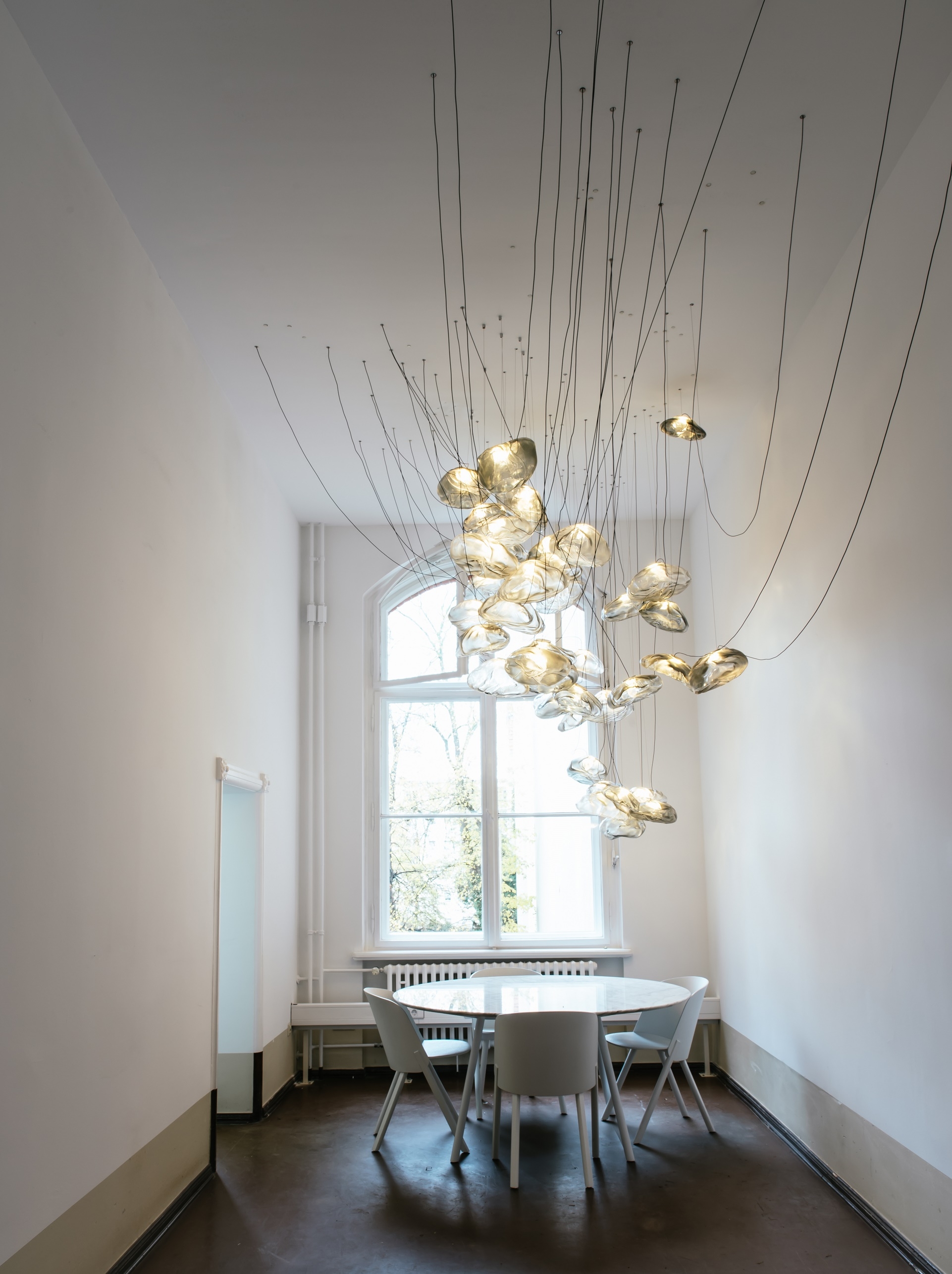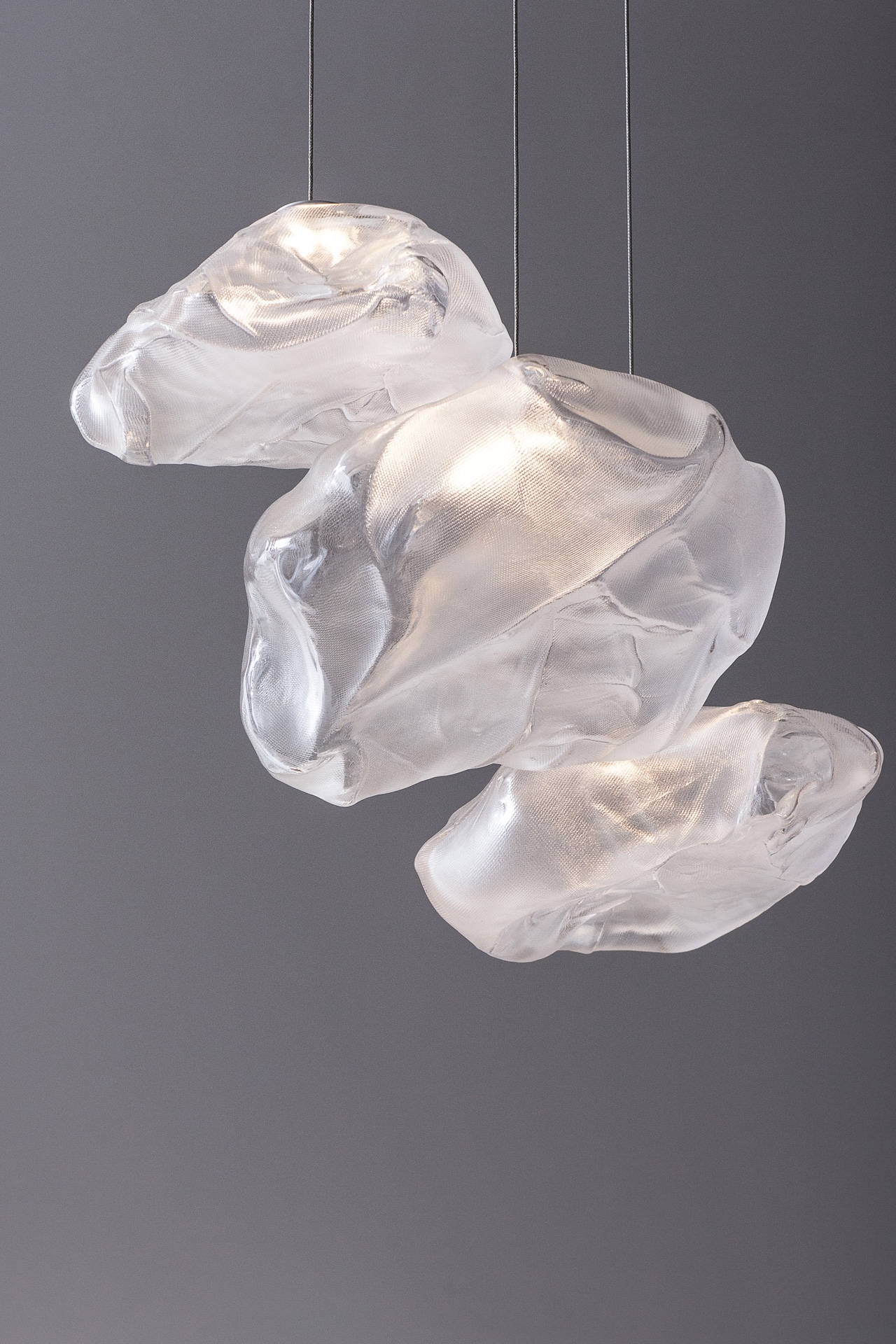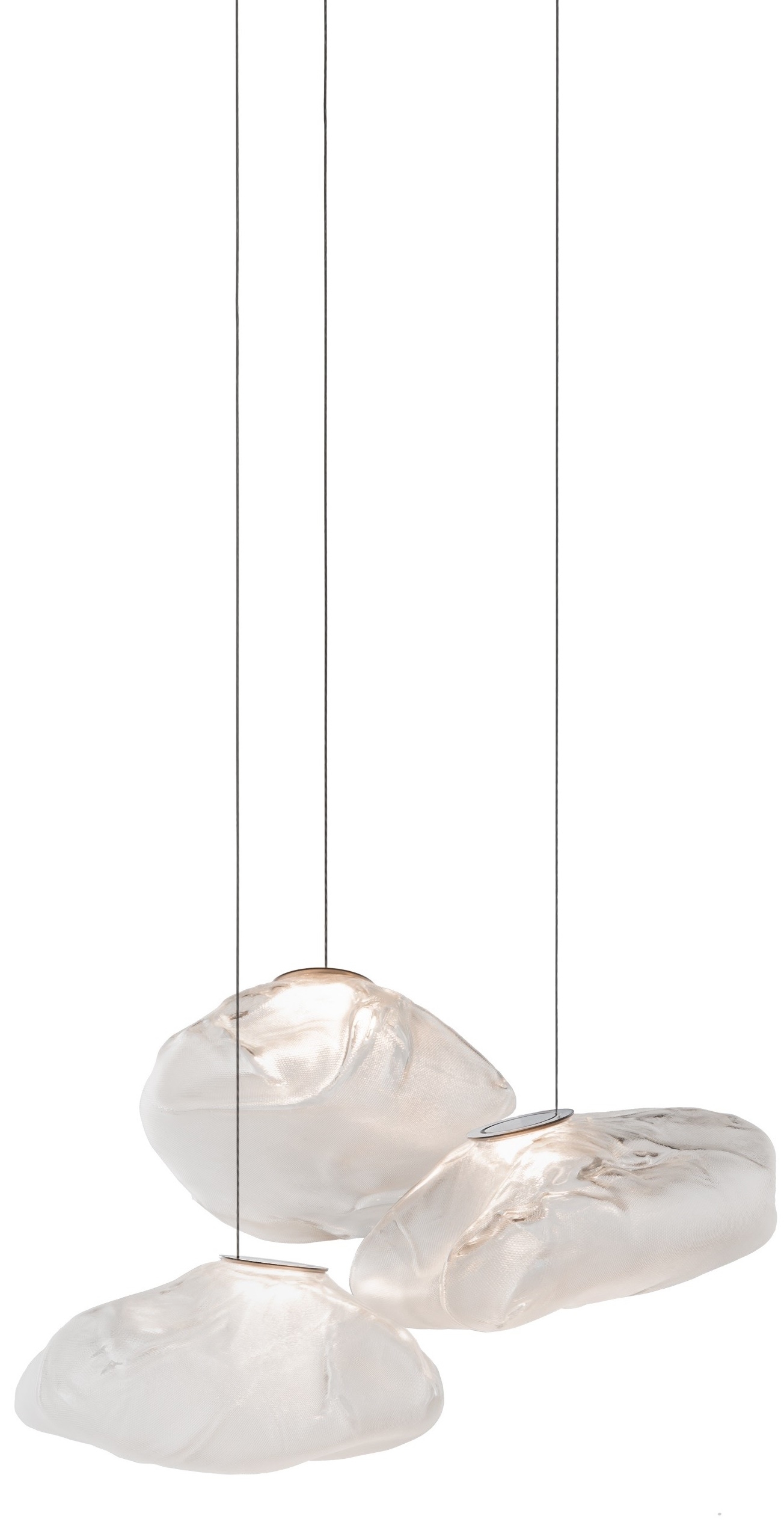 73 Подвесной светильник Bocci73 — серия подвесных светильников, разработанная Омером Арбелем для Bocci. Его получают путем выдувания жидкого стекла внутри вазы из керамического волокна неправильной формы, устойчивой к высоким температурам. Полученная форма время от времени структурно напоминает текстуру ткани, которая становится окончательной при остывании. Тонкий светодиод расположен так, чтобы заполнить весь объем рассеянным светом, чтобы подчеркнуть объемное восприятие произведения. В силу особенностей производства каждый светильник уникален в своей специфике. Серия 73 была создана для создания утонченных композиций, напоминающих облака. Доступен в разных версиях.