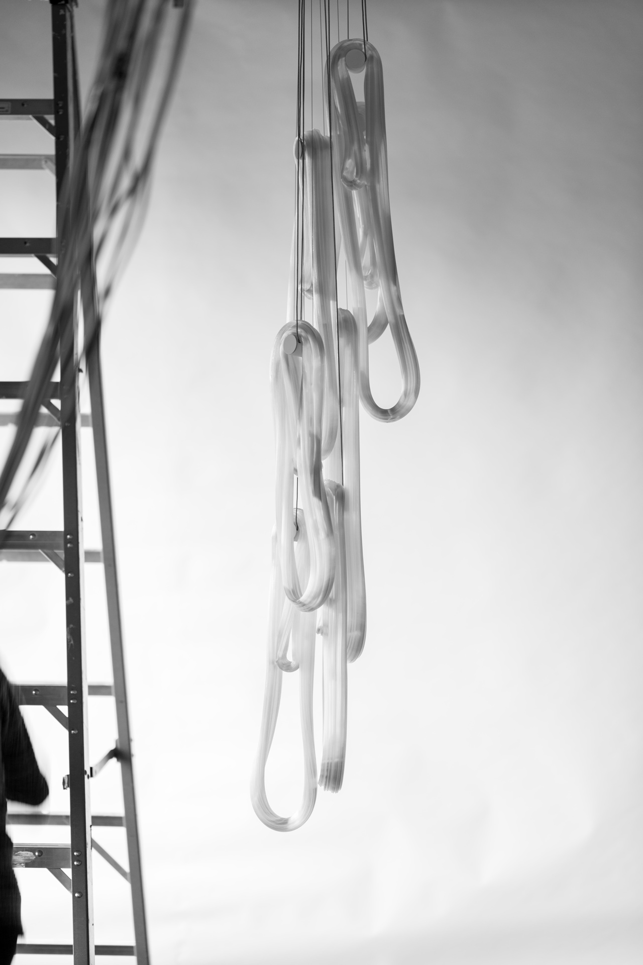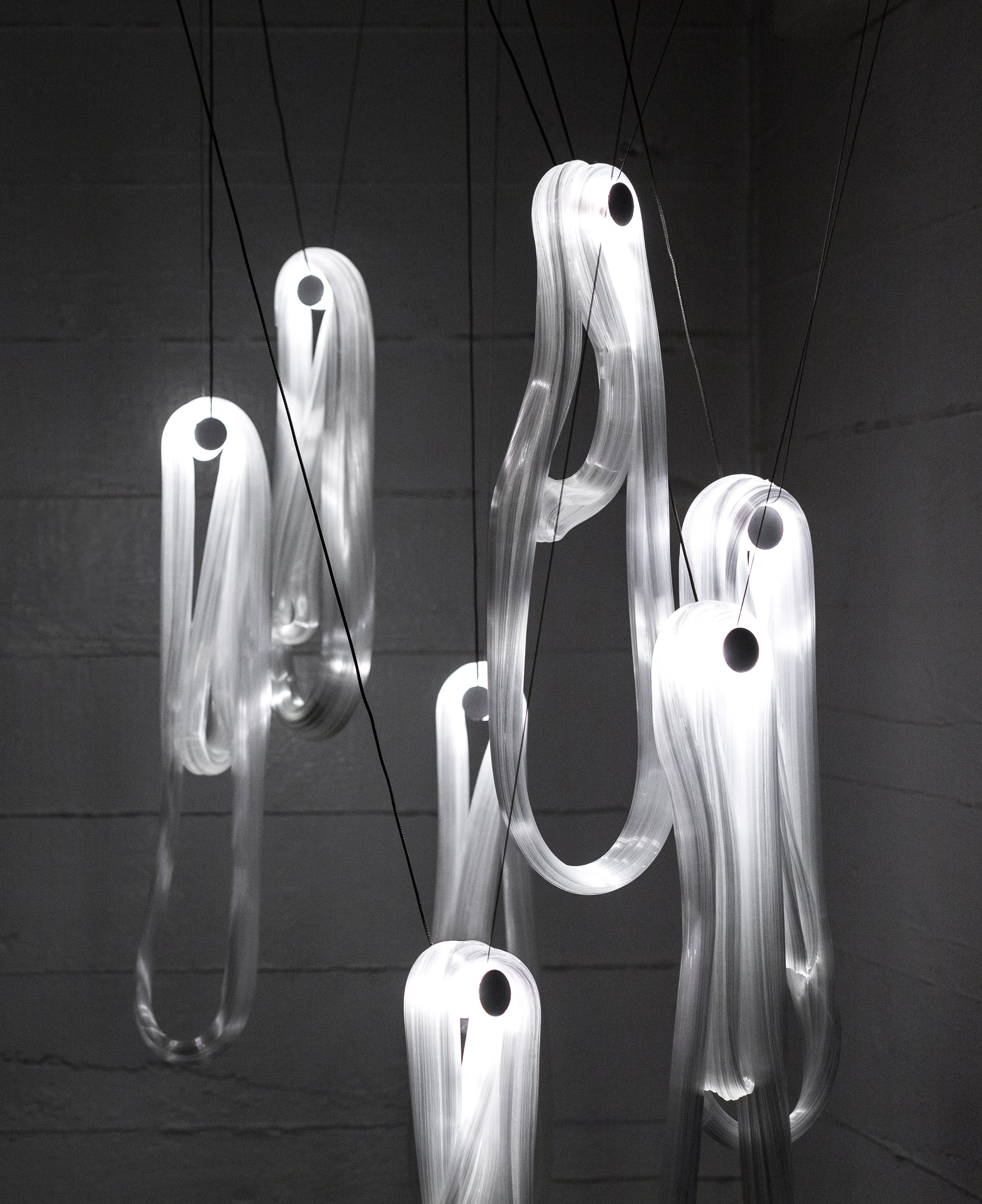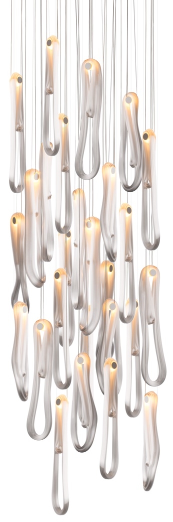 Подвесной светильник 87 BocciСерия 87, разработанная Омером Арбелем для Bocci, представляет собой подвесной светильник, доступный в различных конфигурациях. Инновационная технология обработки предполагает использование газированной воды для улавливания воздуха внутри перегретой стеклянной матрицы, которая впоследствии растягивается вертикально и многократно оборачивается вокруг себя. После охлаждения изгибающее движение превращает захваченный воздух в микроволокна, которые придают изделию жемчужный эффект. Доступен в разных версиях.