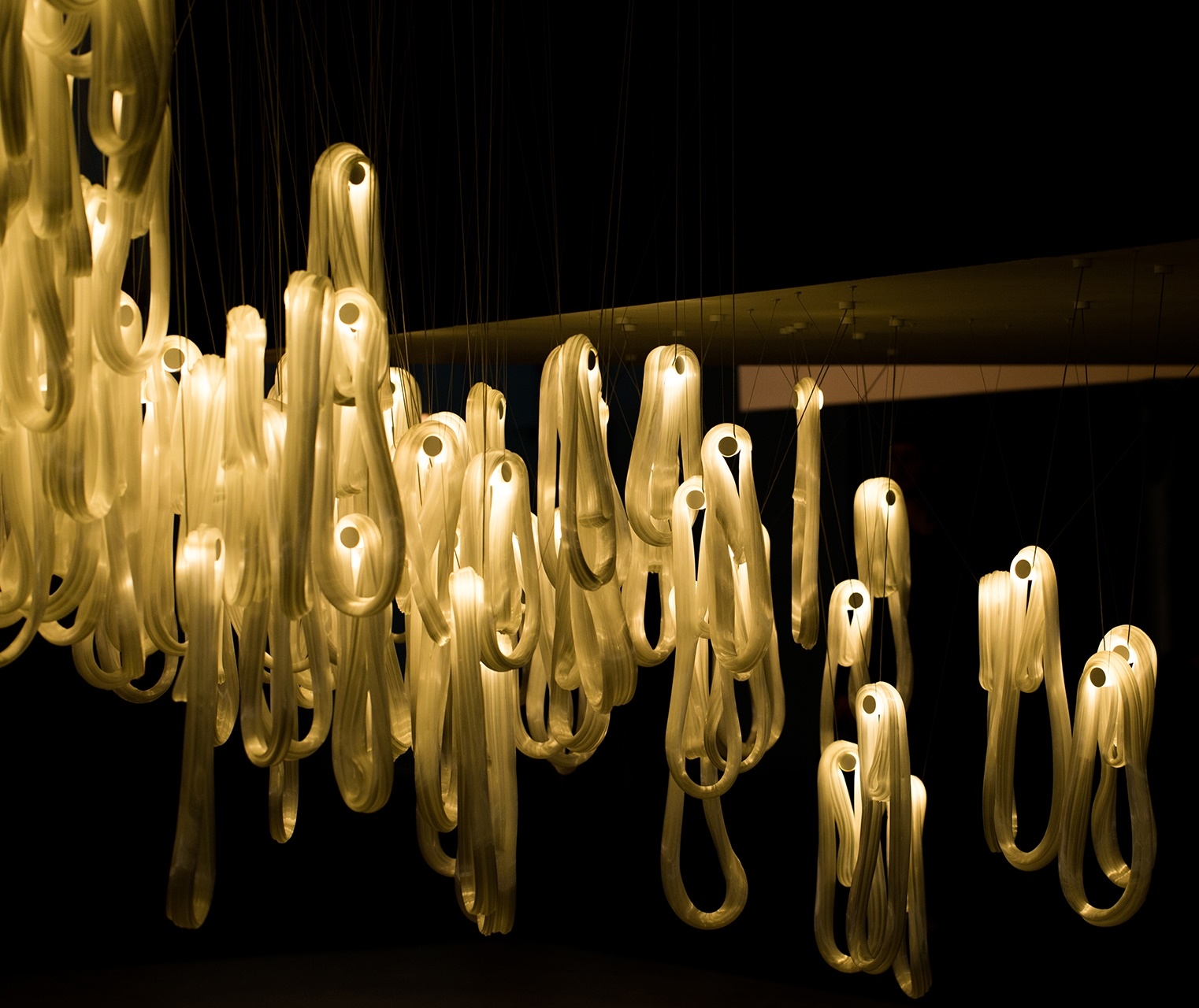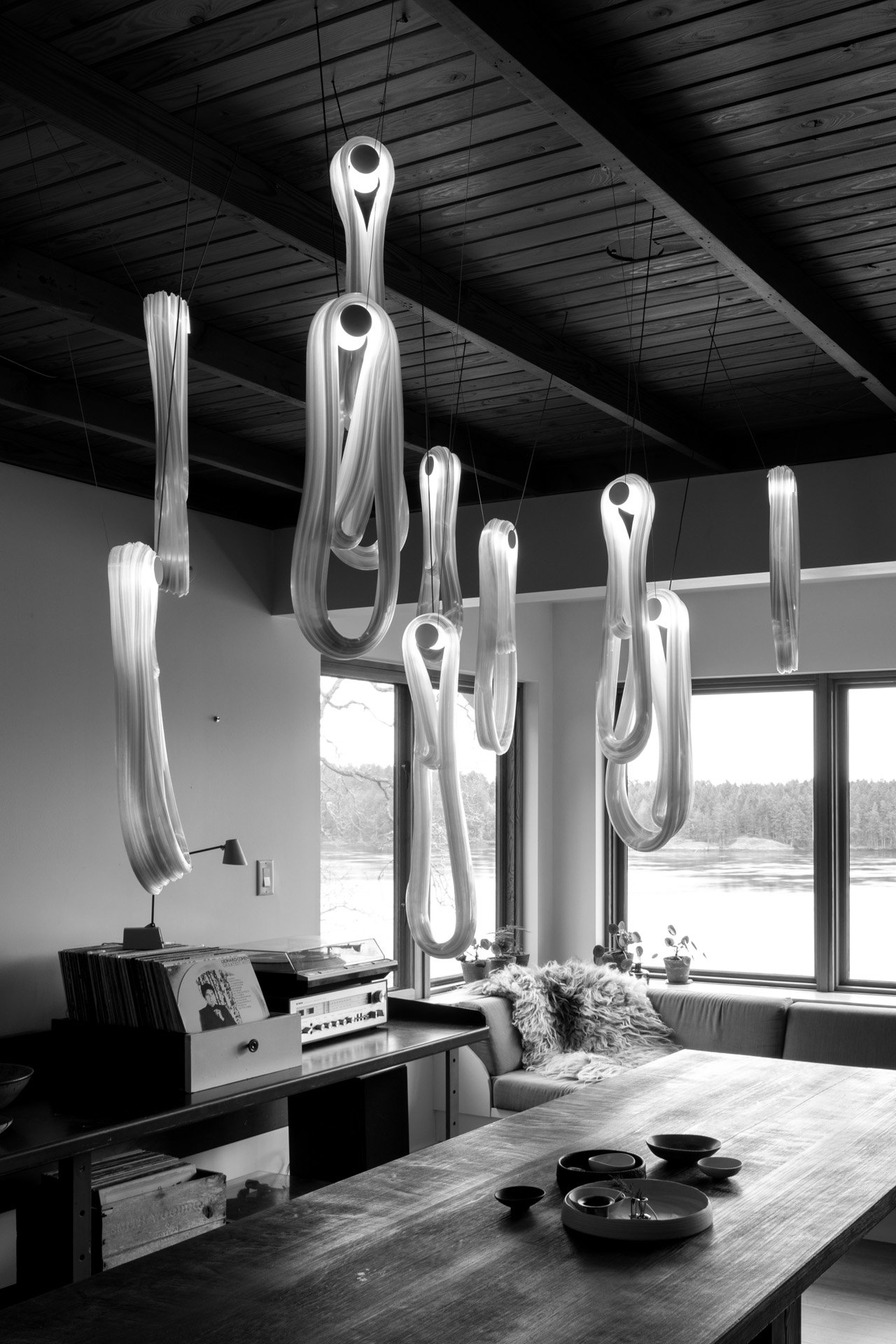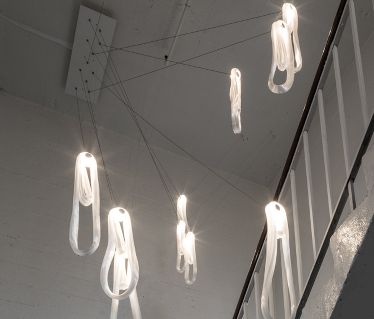 Подвесной светильник 87 BocciСерия 87, разработанная Омером Арбелем для Bocci, представляет собой подвесной светильник, доступный в различных конфигурациях. Инновационная технология обработки предполагает использование газированной воды для улавливания воздуха внутри перегретой стеклянной матрицы, которая впоследствии растягивается вертикально и многократно оборачивается вокруг себя. После охлаждения изгибающее движение превращает захваченный воздух в микроволокна, которые придают изделию жемчужный эффект. Доступен в разных версиях.