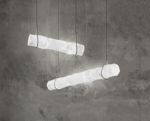 Подвесной светильник Baggy Horizontal ContardiBaggy Horizontal, разработанный Паолой Навоне для Contardi, представляет собой подвесной светильник неправильной формы с цилиндрическим корпусом из бисатинового поликарбоната и подвесным шнуром из бело-серой ткани. Источник света представляет собой светодиодную ленту с системой регулировки яркости. Baggy Horizontal доступен в различных моделях, с разной длиной подвесного шнура и версиями с регулируемой яркостью.