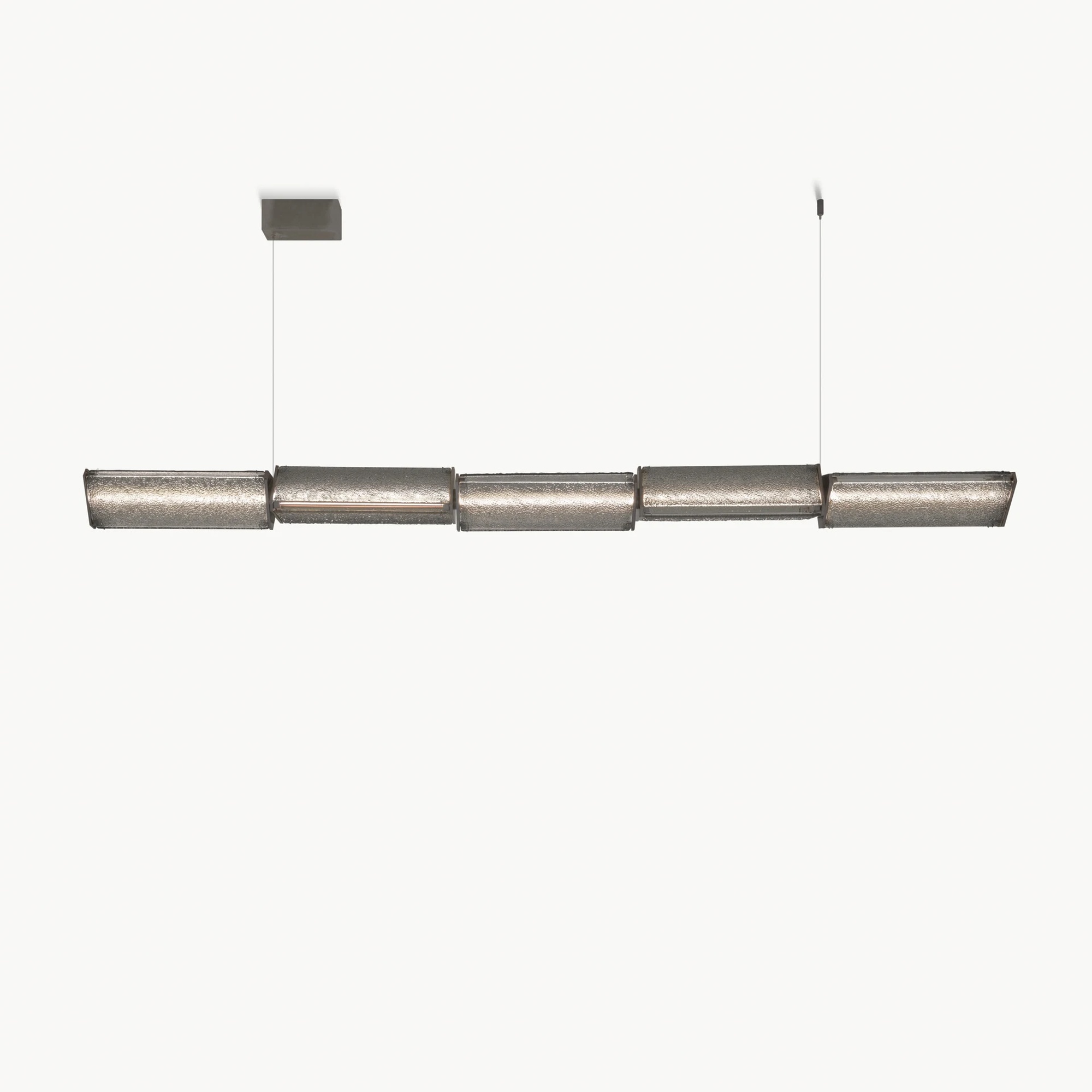 Подвесной светильник Core от Ipe Cavalli Visionnaire — это архитектурная композиция от Марко Пива. Модель объединяет пять горизонтальных призматических фонарей из дымчатого художественного стекла с неровной поверхностью, расположенных в шахматной угловой последовательности. Центральная планка интегрирует линейный LED-источник с опаловым метакрилатным рассеивателем для мягкого равномерного света.