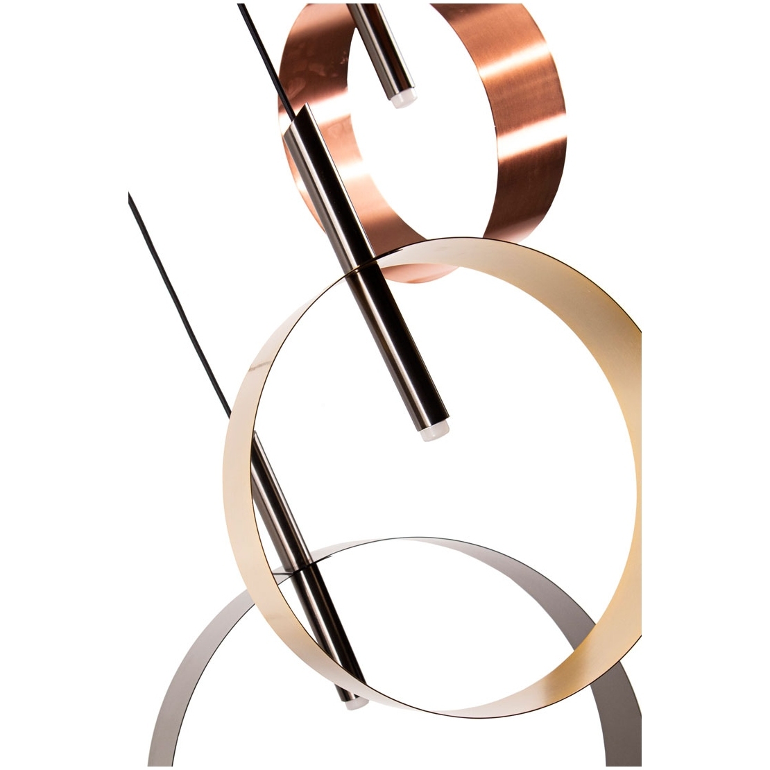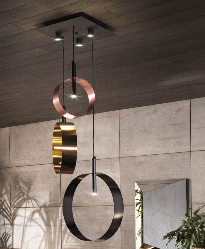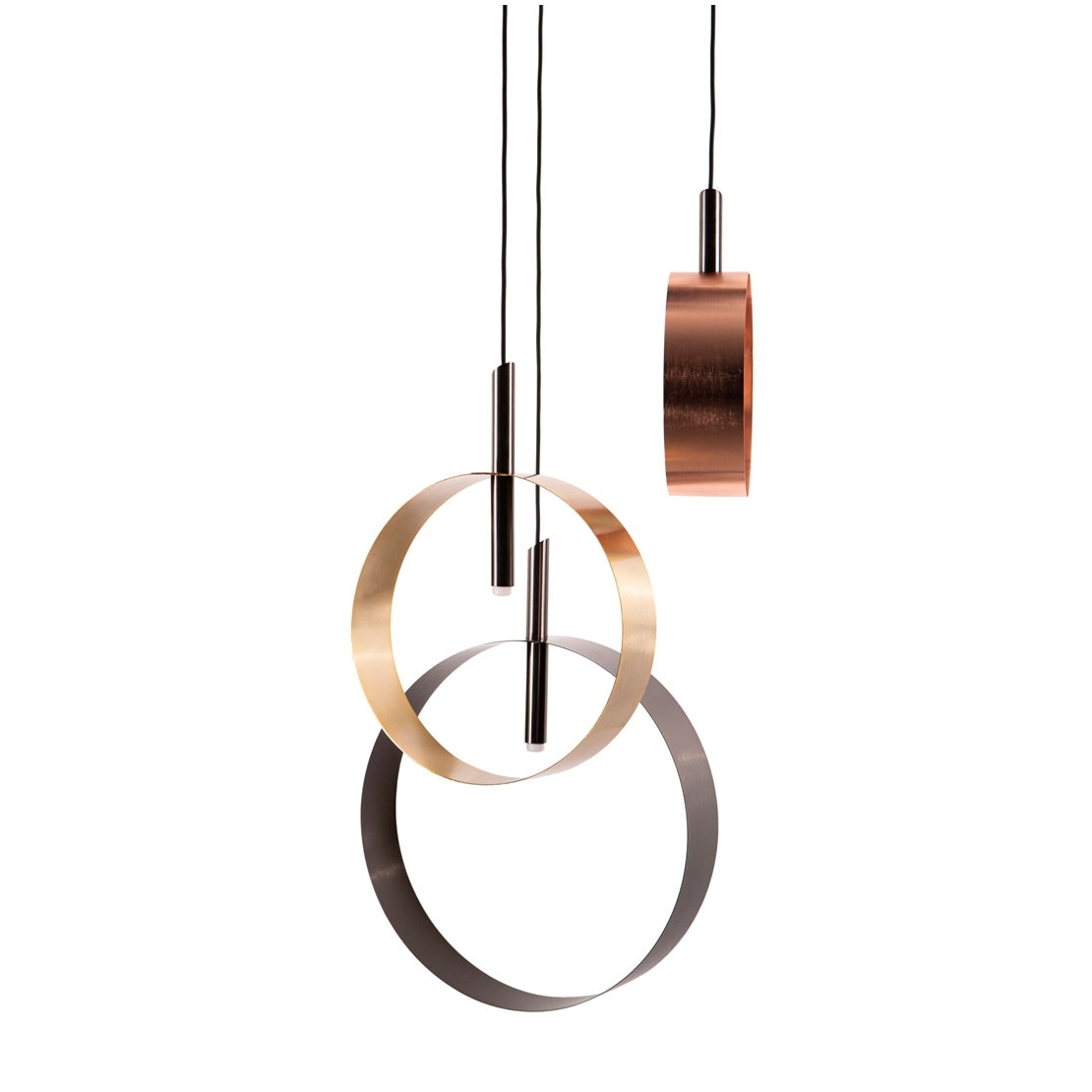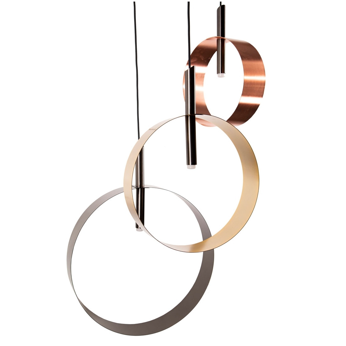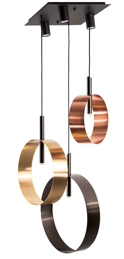 Подвесной светильник Led Loop S3 Riflessi Led Loop S3, разработанный Riflessi, представляет собой подвесной светильник, состоящий из трех колец трех разных размеров. Три фиксированных светящихся прожектора спускаются с основания тремя окрашенными кольцами (1 медь, 1 золото, 1 черный хром) с гальванически-сатиновой обработкой, соединенными с электрическими кабелями из черной ткани, регулируемой по высоте мин. 60 макс. 120см. По запросу возможно исполнение динамиков в такой же отделке.