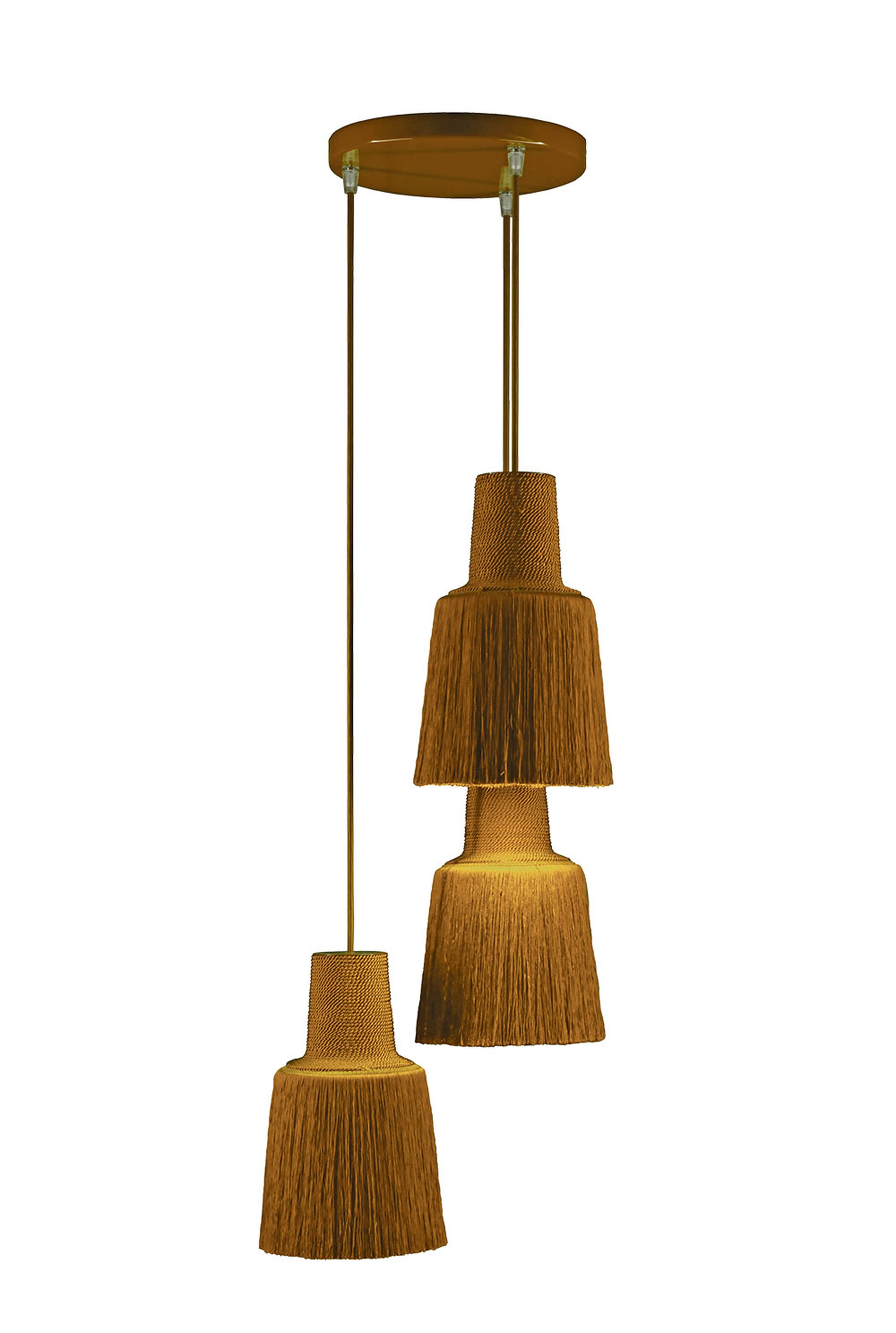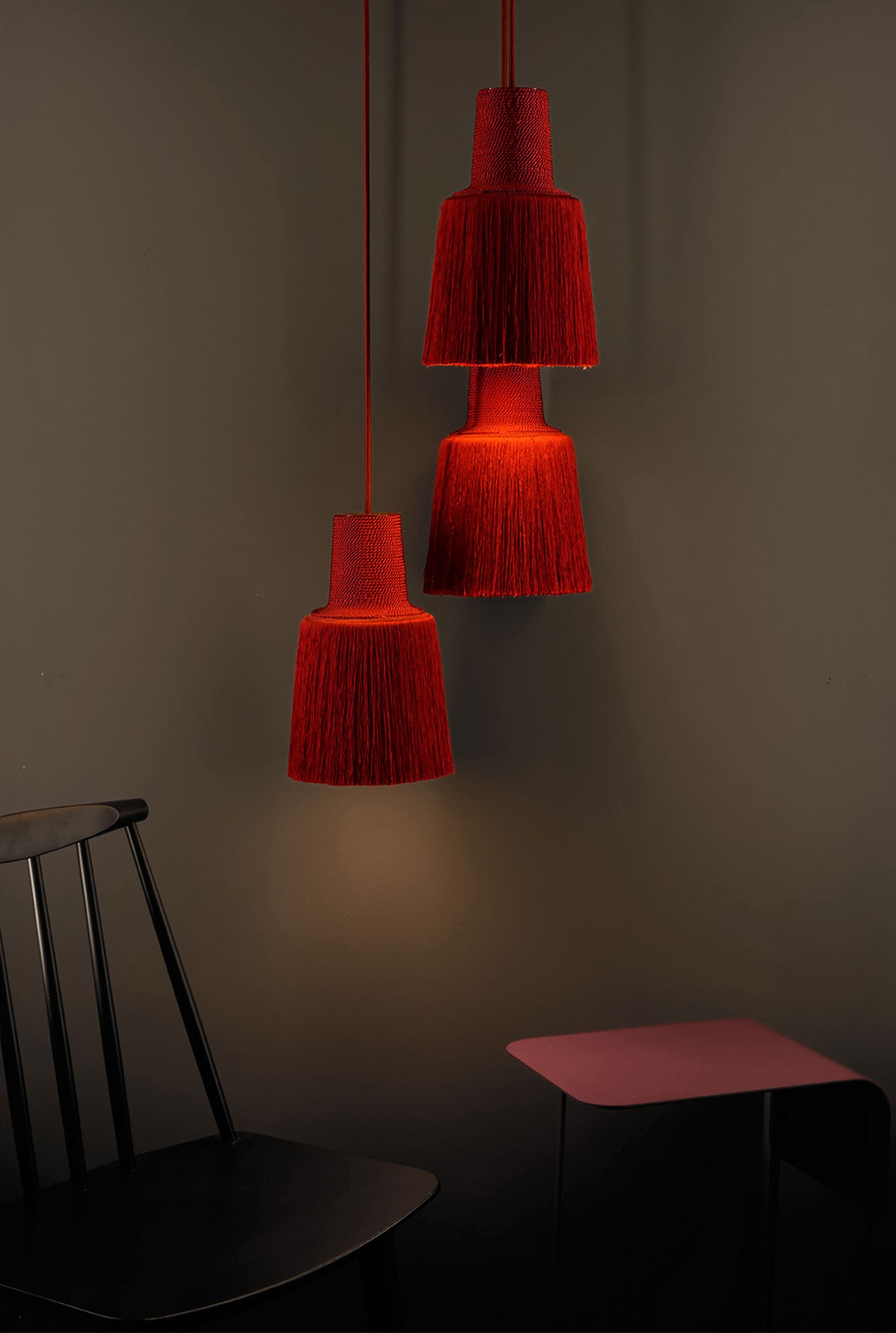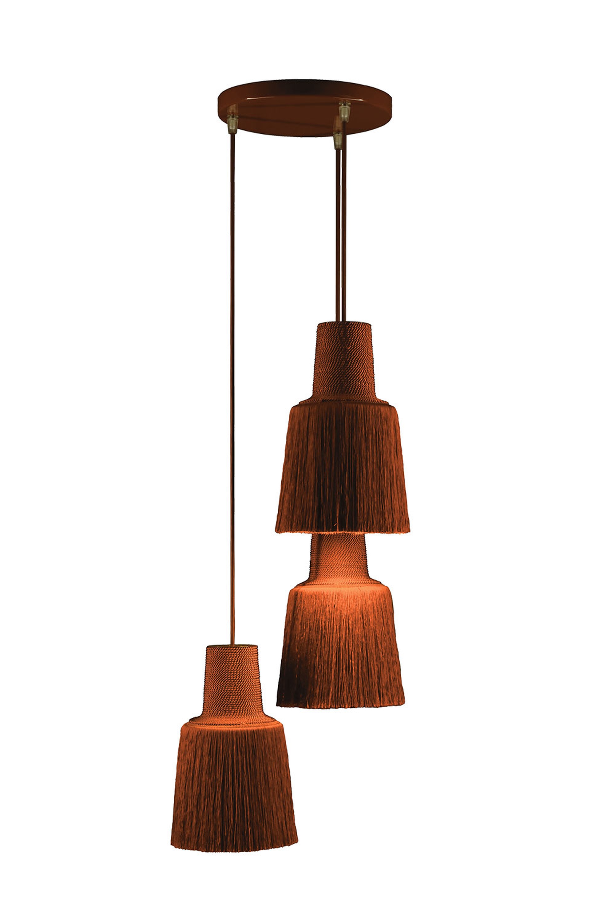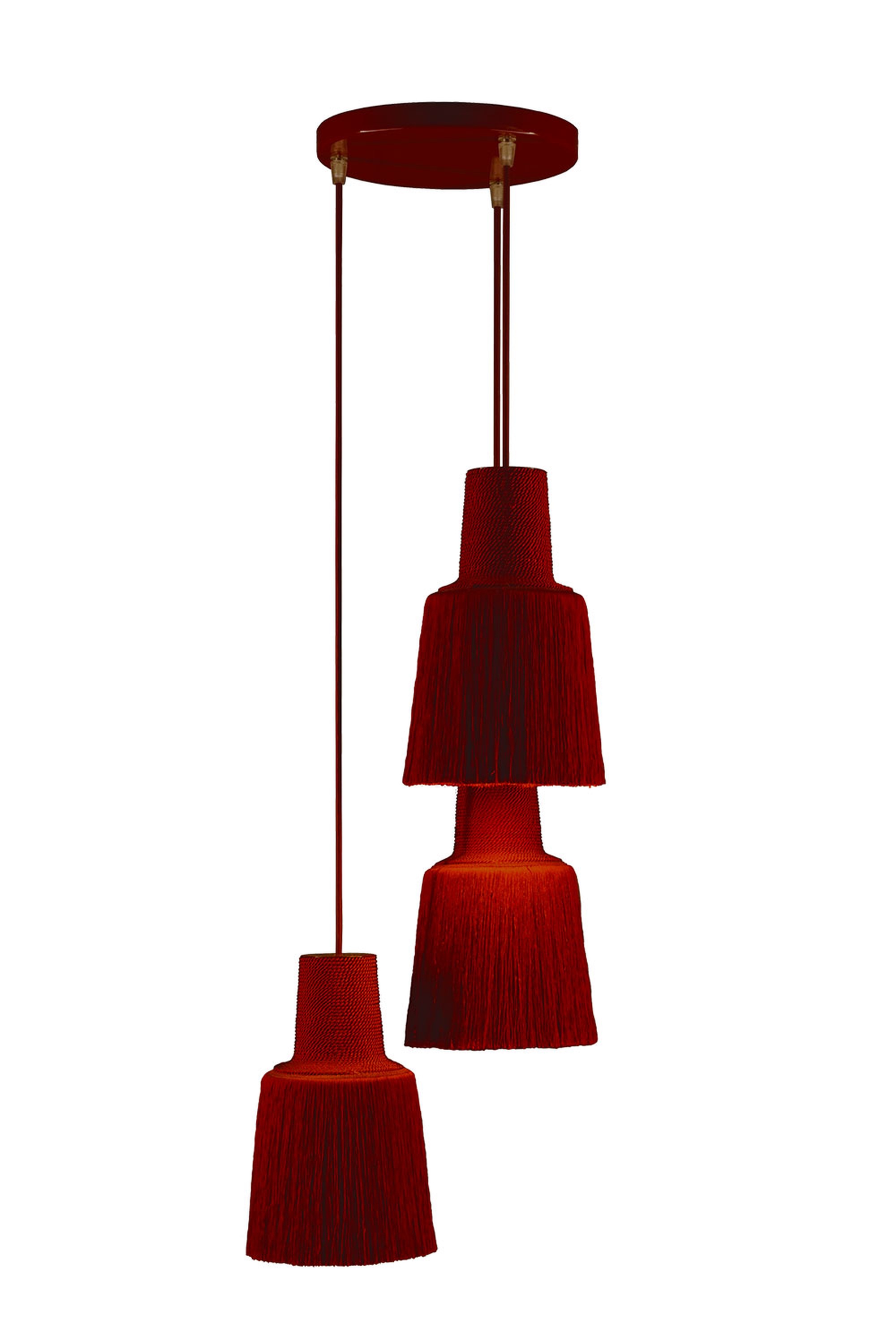 Литой алюминиевый элемент направляет свет строго вниз, а слои шелковистой пряжи с матовым блеском создают изысканное свечение и уютную атмосферу. Модель представлена в разнообразных оттенках: от ярких (жёлтый, красный) до металлических (медный, серебряный, золотой). Кабели и потолочная чашка подобраны в тон — это подчёркивает премиальный облик светильника.