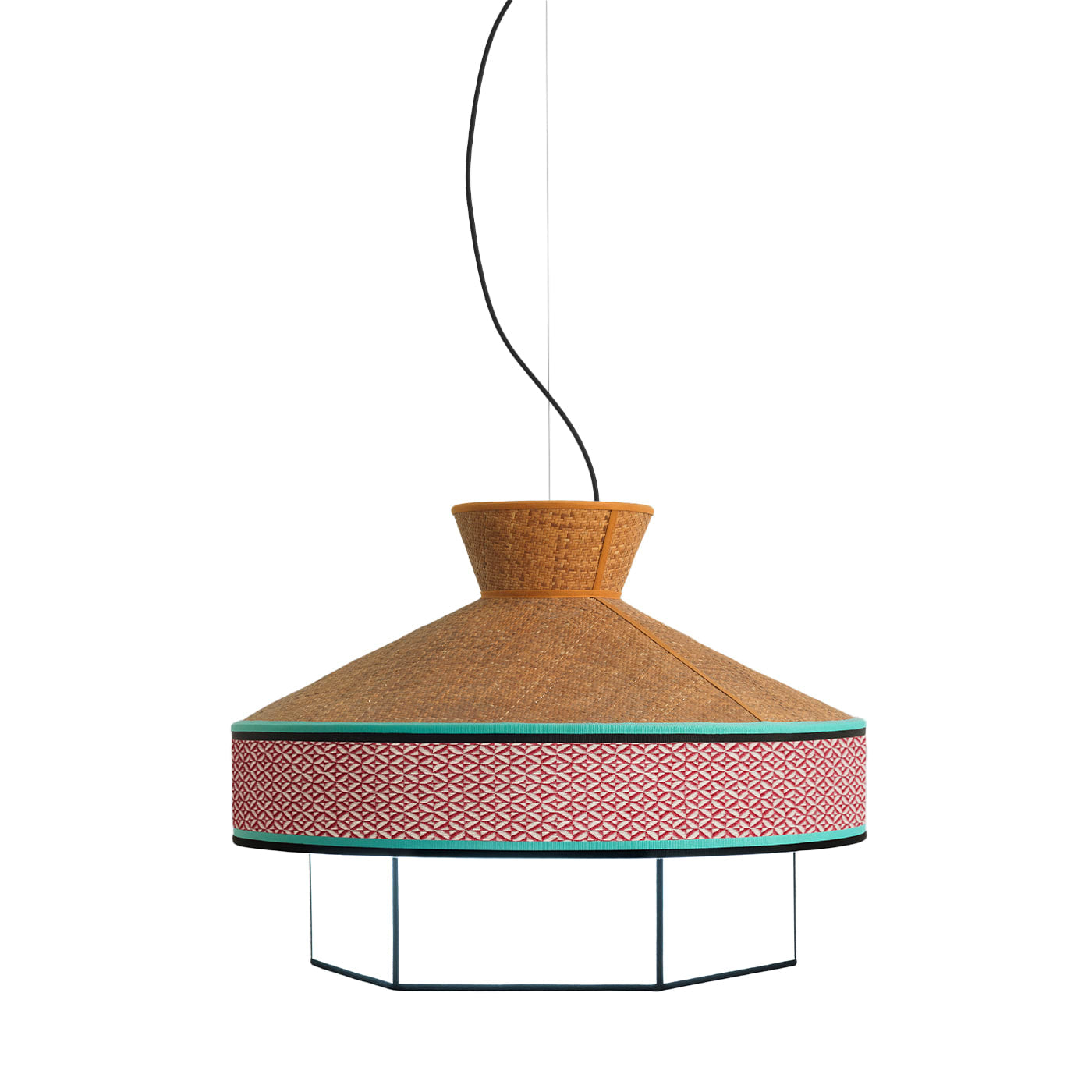 Эта люстра входит в коллекцию Giardino из 12 люстр, вдохновлённую стилем миланских ресторанов 50-х годов. Форма люстр напоминает старинные дома с соломенными крышами. Многоугольная гранёная форма ротангового корпуса гармонично рассеивает свет. Верхняя часть люстр декорирована тканью с геометрическим узором.