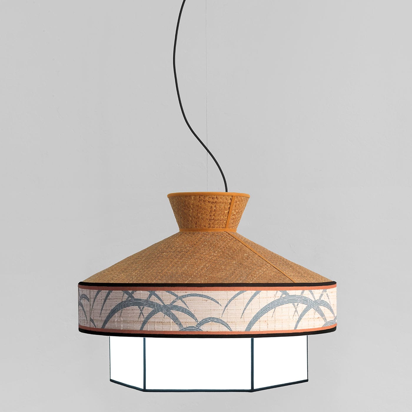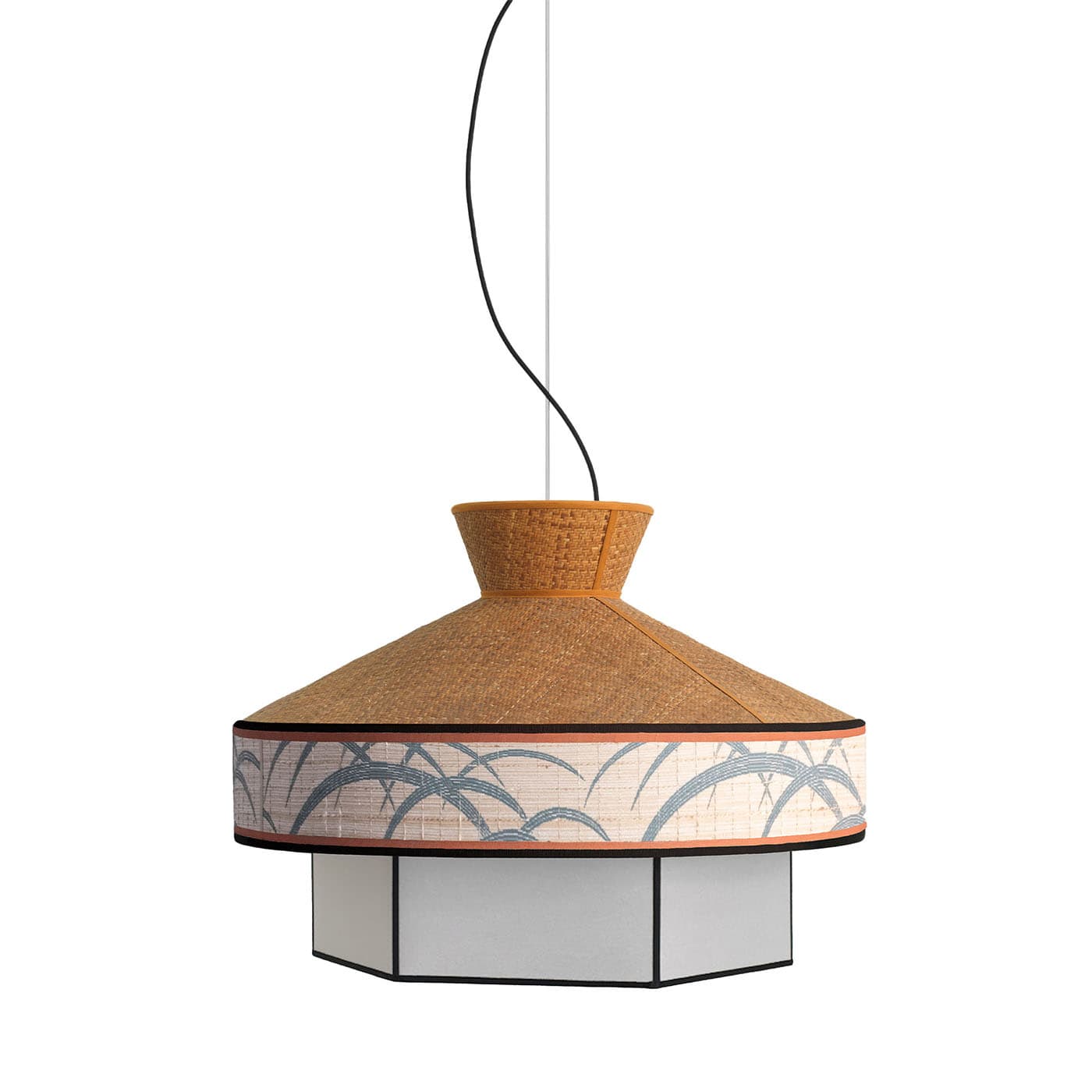 Лампа Giardino воплощает эклектичный стиль 1950-х годов, отражая процветание миланской буржуазии. Изготовленная из ротанга и жаккарда, она отличается контрастной отделкой белого пергаментного плафона, вдохновленного Дальним Востоком и жизнью на открытом воздухе, и дополненного узором Misia с листьями. Лампа оснащена белой железной потолочной чашей и лампочкой E27/E26 (не входит в комплект) с чёрным шёлковым кабелем. Совместима с системами диммирования.
