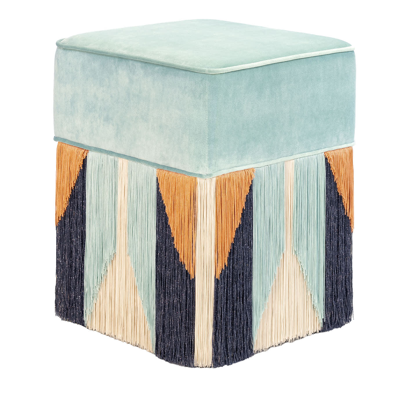 Этот квадратный пуф станет универсальным дополнением к шикарным гостиным и изысканным залам. Изготовленный из мягкого светло-голубого бархата с бахромой в тон, он дополнен акцентами серого люрекса, нежно-оранжевого и бежевого цветов для эффектного контраста. Яркие оттенки изумрудно-зеленого, сапфирово-синего и темно-фиолетового, смягченные светло-розовым, синим и зеленым, дополняют роскошные металлические акценты золота, серебра и бронзы. Вдохновленный стилем ар-деко, геометрический и симметричный узор бахромы придает пуфу изысканный штрих. Каждый изготовленный на заказ предмет украшен штампом на нижней части подкладки пуфа, а также личной подписью, номером и датой дизайнера.