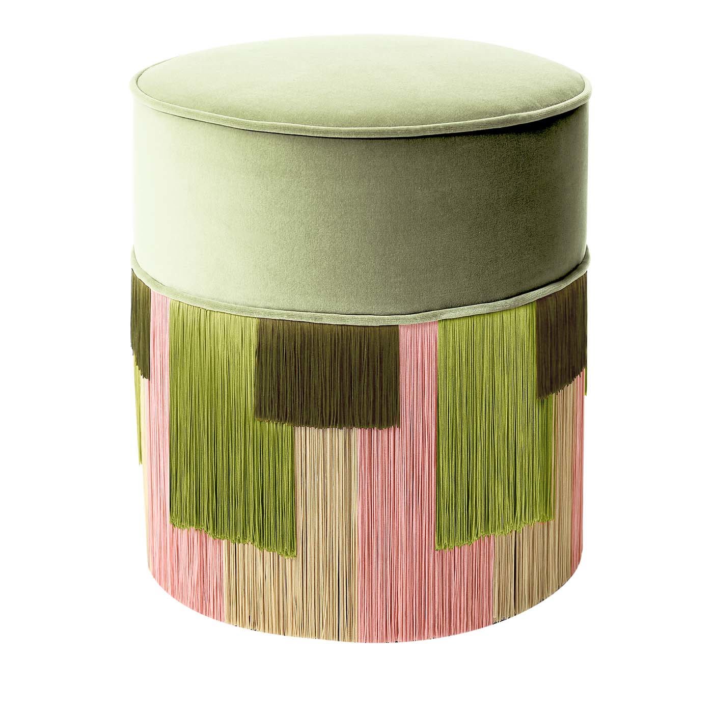 Этот изящный, но яркий пуф – великолепное изделие, характеризующееся светло-зелёной бархатной обивкой и основанием из окрашенного бука. Основание украшено несколькими рядами разноцветной бахромы, создающей фантастический, аккуратный визуальный эффект. Изделие полностью изготовлено в Италии с использованием материалов высочайшего качества. Каждый изготовленный на заказ предмет имеет тиснение на нижней части подкладки пуфа, а также личную подпись, номер и дату дизайнера.