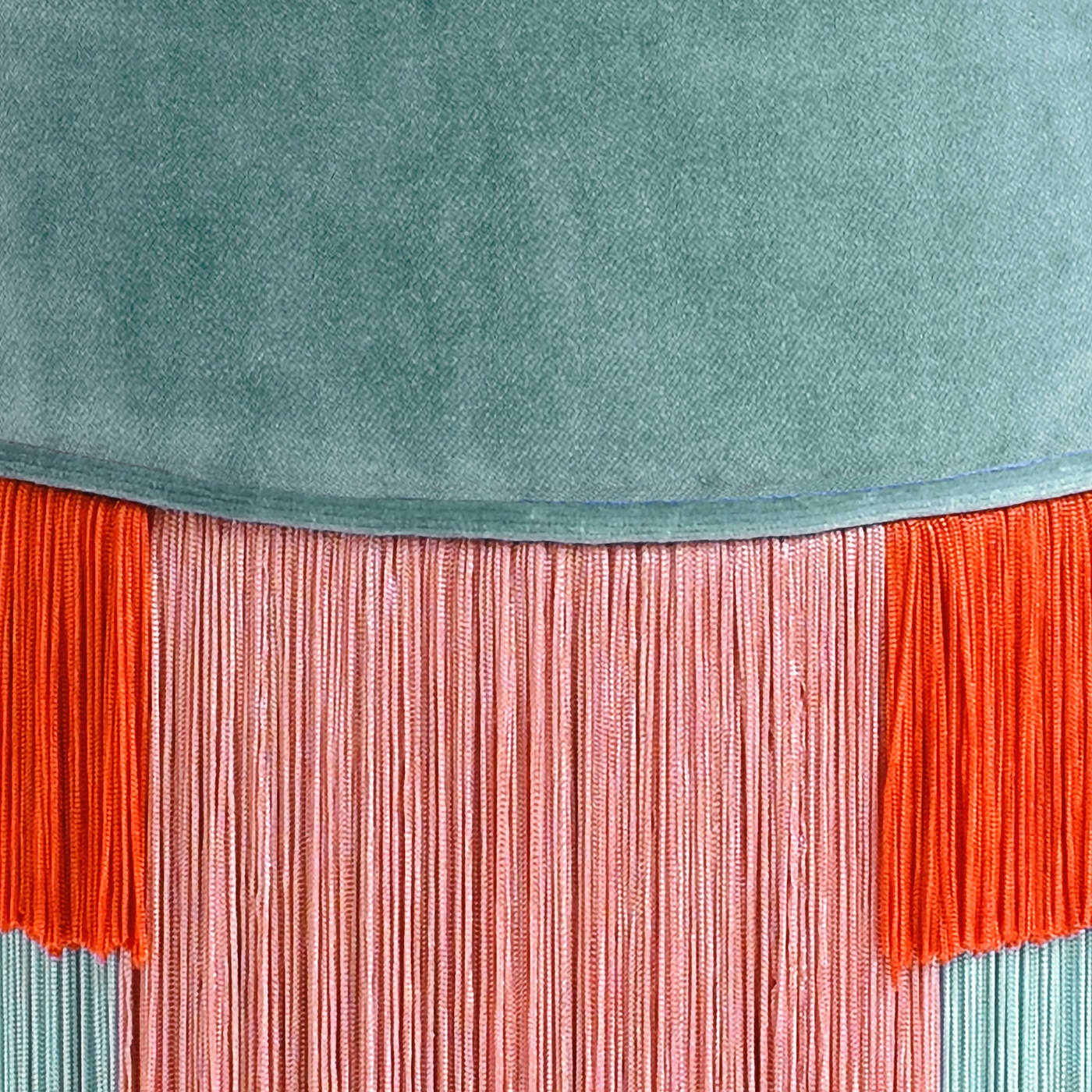 Этот пуф отличается оригинальным дизайном и яркими цветами. Высокий и стройный каркас из бука поддерживает подушку сиденья, наполненную синтепоном и обитую нежным светло-голубым бархатом, обеспечивающим долговечность и мягкость. Нижняя часть украшена геометрическим узором из цветных блоков, напоминающим племенные мотивы, состоящим из вытканной вручную и окрашенной бахромы. Слои длинной светло-голубой бахромы контрастируют с панелями из ярко-розовой бахромы в форме пятиугольников вершиной вниз, обрамленных оранжево-черной бахромой, что придает изделию динамичность и текстурный контраст. Каждый изготовленный на заказ предмет имеет тиснение на нижней части подкладки пуфа, а также личную подпись, номер и дату дизайнера Лоренци Боццоли. Подлинность каждого изделия подчеркивает качество ручной работы и искусство роскошного, эксклюзивного дизайна.