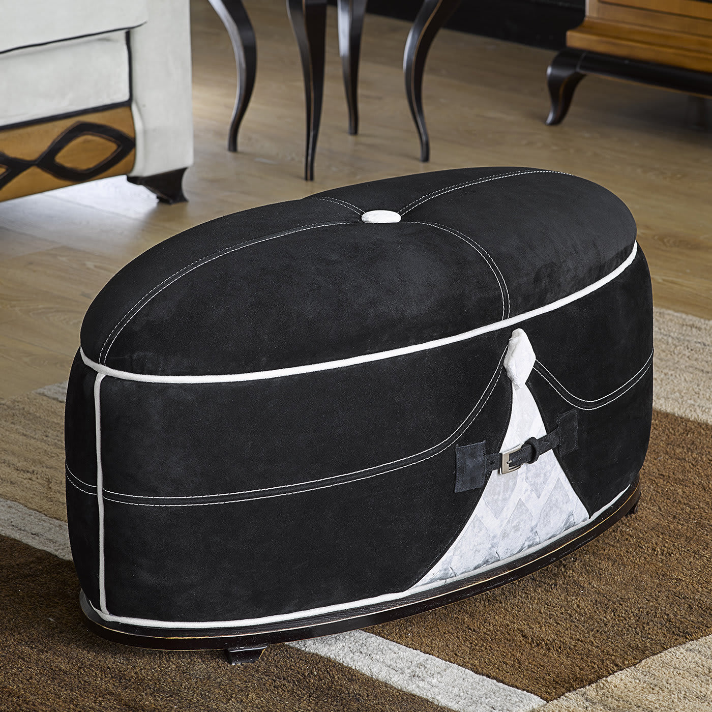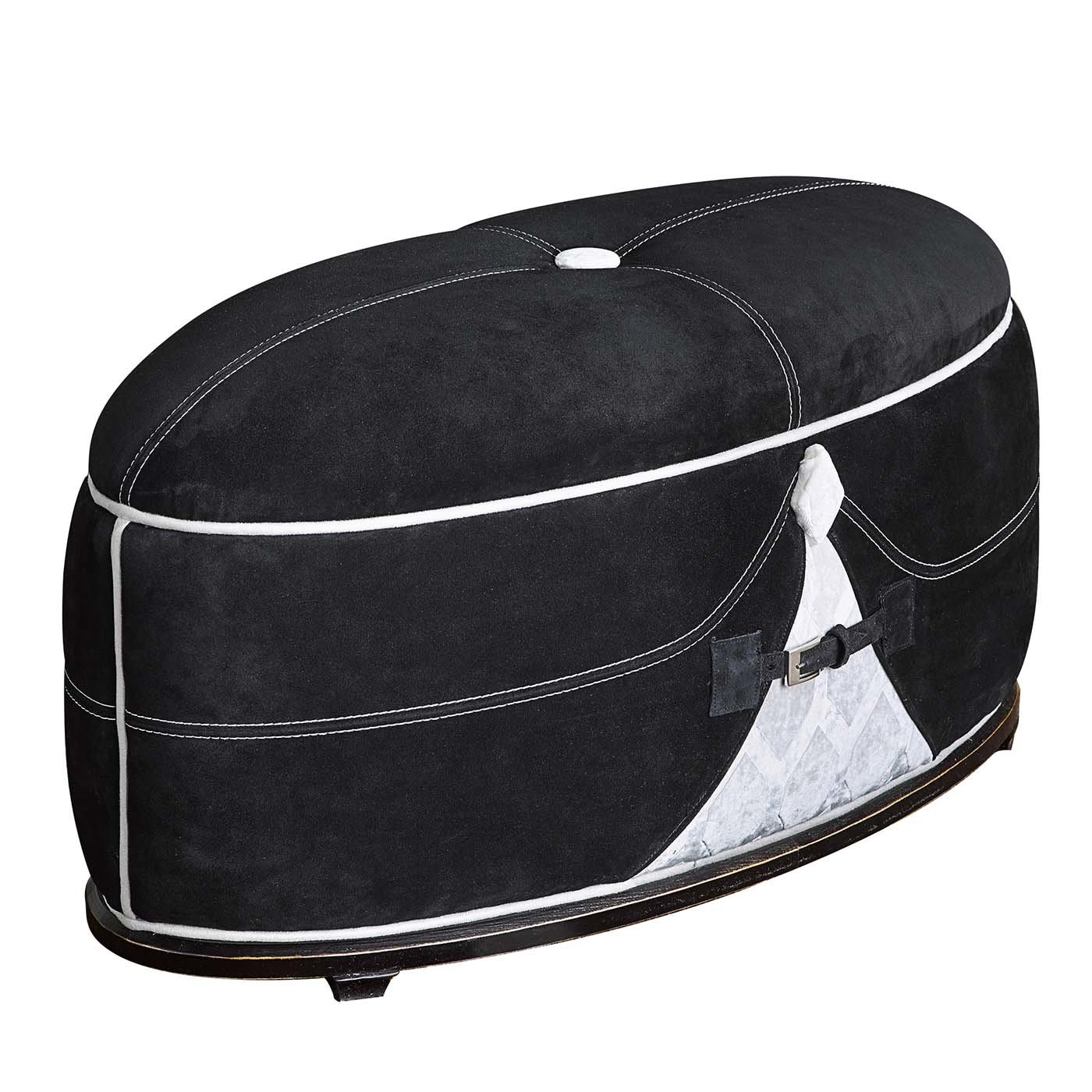 После долгого дня расположитесь на этом элегантном овальном пуфе. Изделие выполнено из чёрной кожи и дополнено контрастной белой окантовкой по бокам, белой пуговицей сверху и белым разрезом сбоку спереди, напоминающим галстук на смокинге, что придаст элегантности и изысканности любому интерьеру.