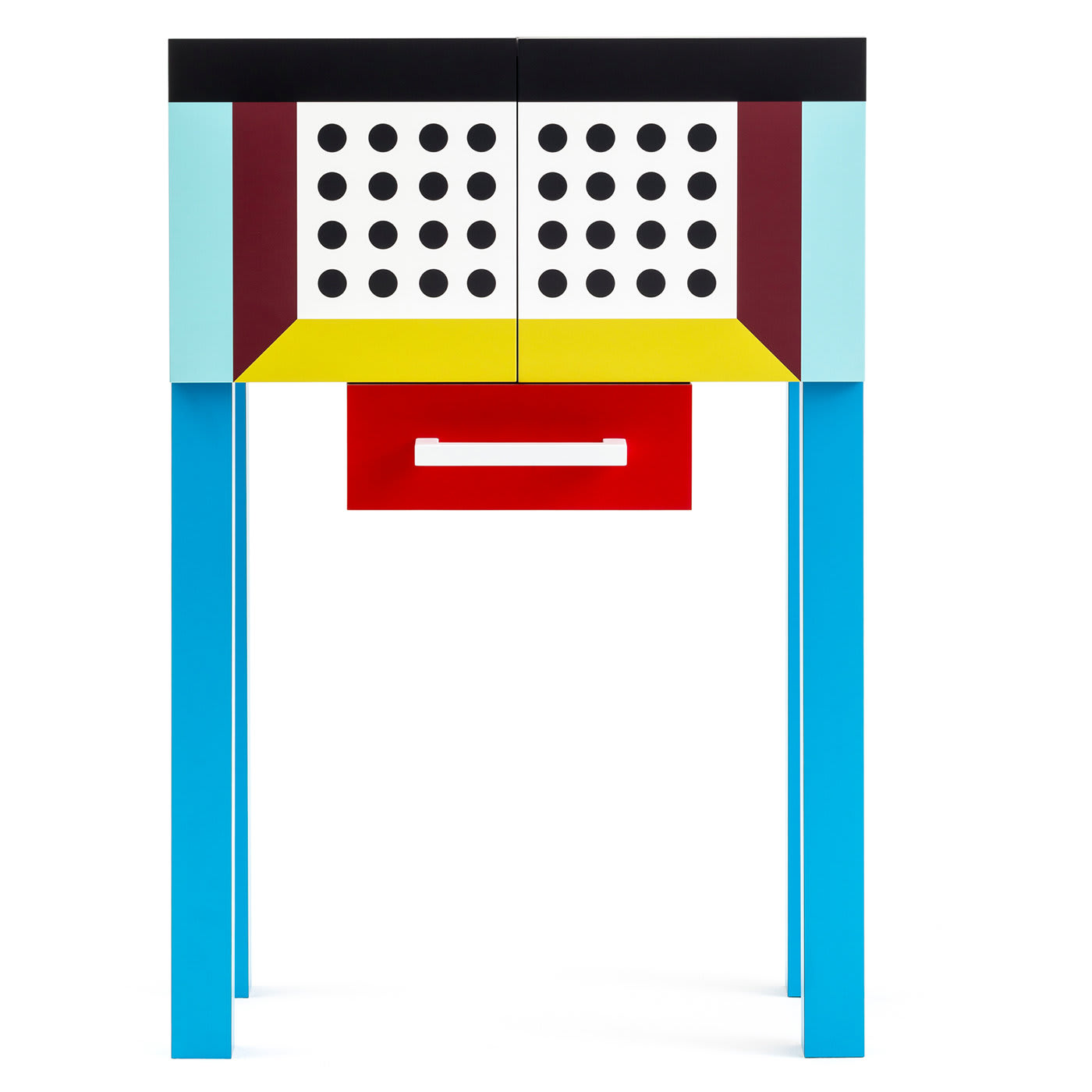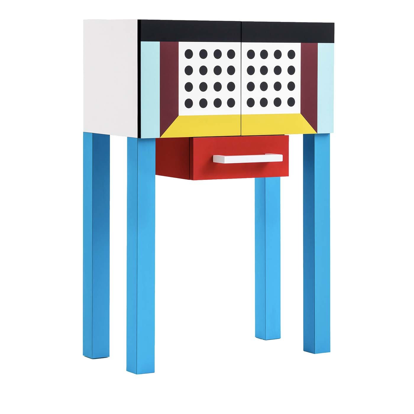 Этот смелый и яркий, многофункциональный двухдверный шкаф от дизайнера Натали Дю Паскье (2018) напоминает линии классического шкафа-витрины с современным оттенком. Этот шкаф, входящий в лимитированную серию из 25 экземпляров, имеет вертикальную конструкцию, установленную на высоких квадратных ножках из дерева бирюзового цвета, которые поддерживают гармоничную столешницу из пластикового ламината. Шкаф украшен ярким графическим узором из точек и линий, создающим трёхмерный эффект, и имеет один деревянный ящик красного цвета с U-образной белой ручкой. Коллекция Materialism.