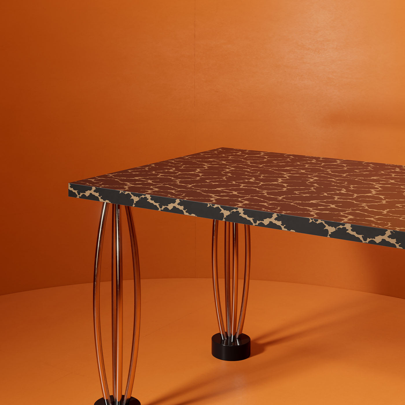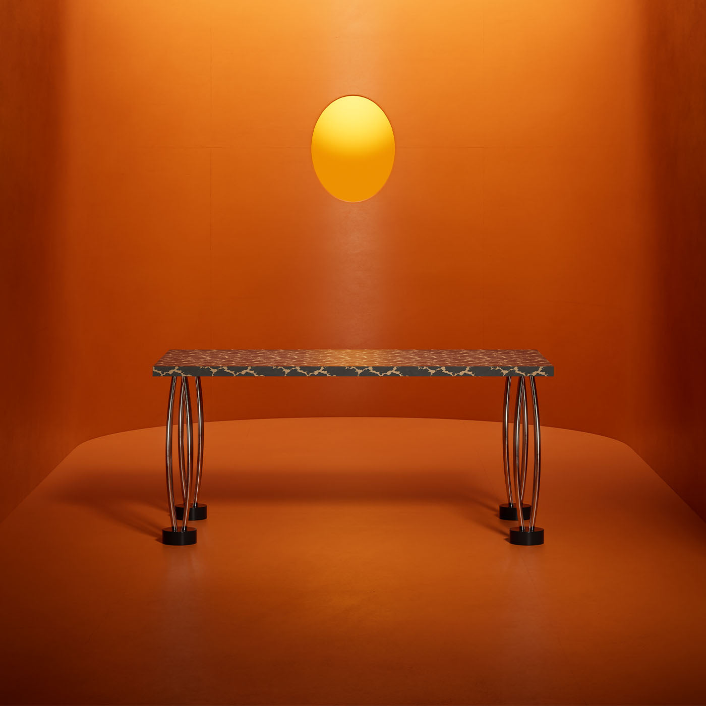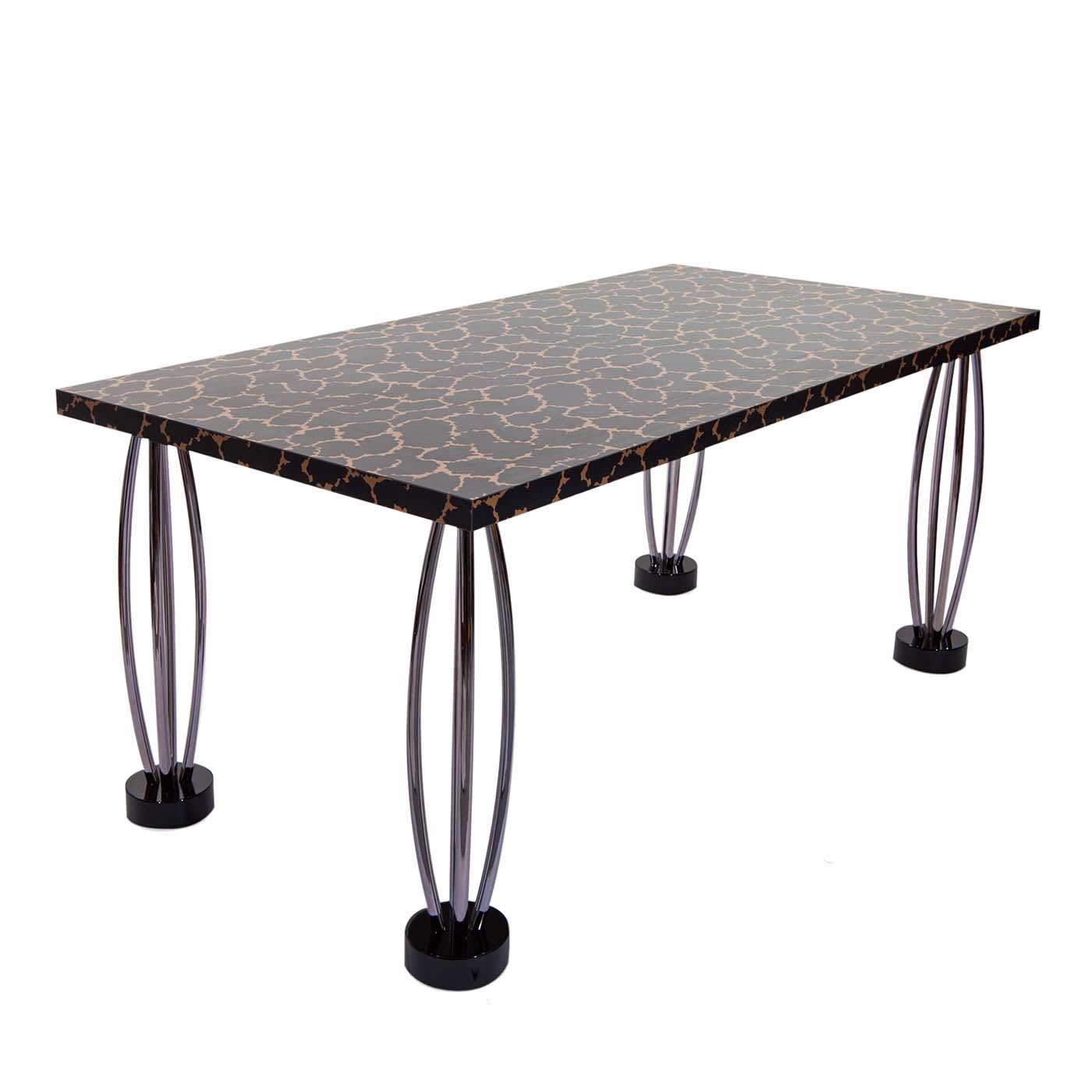Этот смелый и изысканный стол станет эффектным дополнением к изысканной столовой. Этот постмодернистский дизайн был создан Этторе Соттсассом в 1983 году и включает в себя столешницу из ламинированного композитного материала, четыре изогнутых хромированных стальных элемента на каждой ножке и эмалированные алюминиевые цилиндры на каждой из четырёх ножек. Стол воплощает элегантный и современный шарм города, а столешница, имитирующая джунгли, навевает экзотический дух дальних стран. Он станет прекрасным дополнением к современному дому.