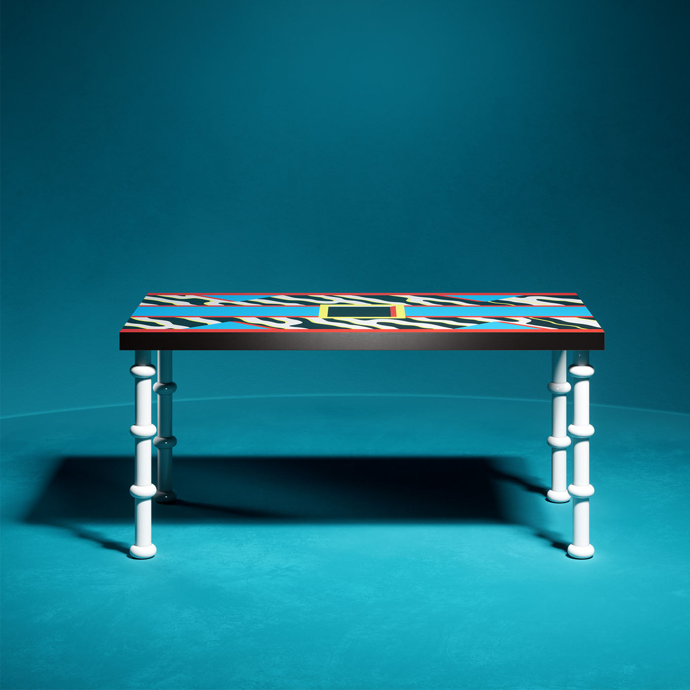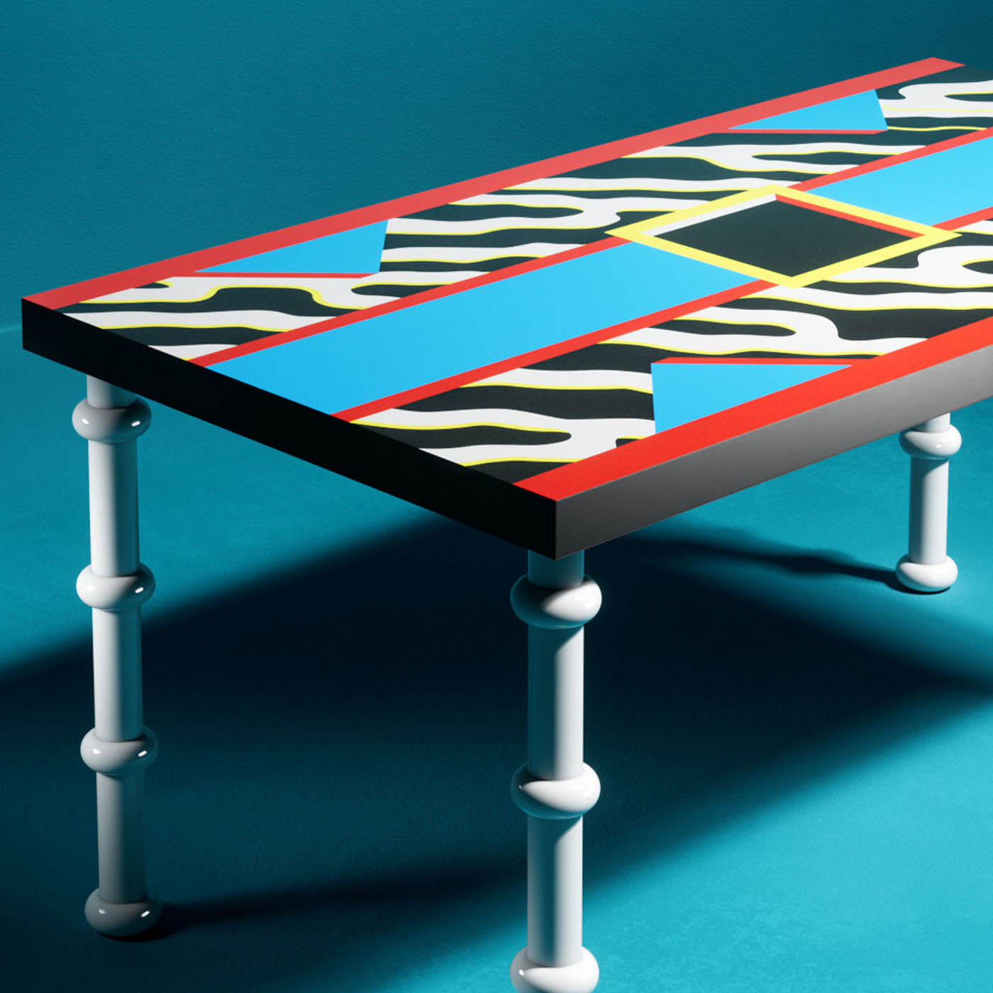 Потрясающее сочетание цветов, узоров и объёмов делает этот стол великолепным функциональным предметом декора, который станет центральным элементом современной столовой. Этот стол, разработанный Натали Дю Паскье в 1986 году, изготовлен из пластикового ламината. Основание состоит из четырёх цилиндрических белых ножек, каждая из которых украшена четырьмя кольцами. Столешница представляет собой великолепное сочетание узоров контрастных оттенков, создающих эффектный фон, даже когда стол пуст.