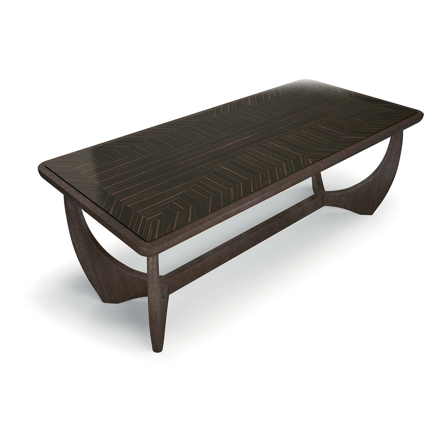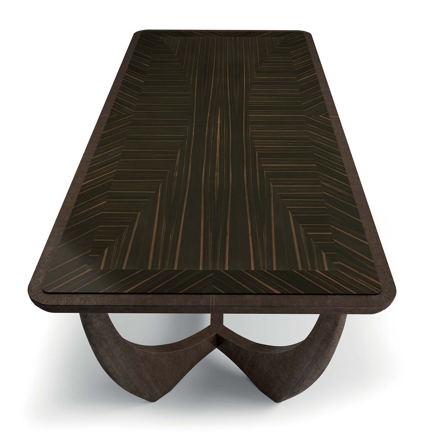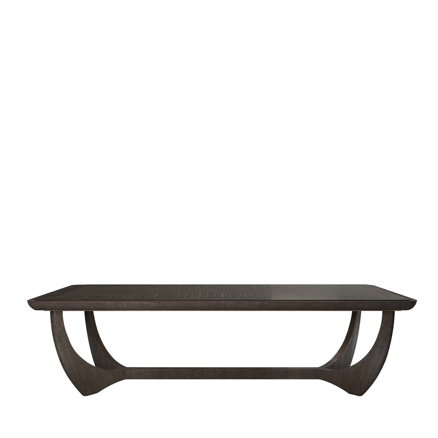 Этот обеденный стол, привлекающий внимание игрой форм и пропорций, сочетает в себе изысканное мастерство и инновационный дизайн, который украсит любую современную столовую. Основание стола, выполненное в смелой геометрической форме, обито коричневой кожей и состоит из четырёх ножек, которые изгибаются и сходятся в форме буквы Y, простирающейся по всей длине столешницы. Столешница из дерева с глянцевой лакированной отделкой украшена тёмным полосатым узором, который ненавязчиво напоминает о 70-х годах.