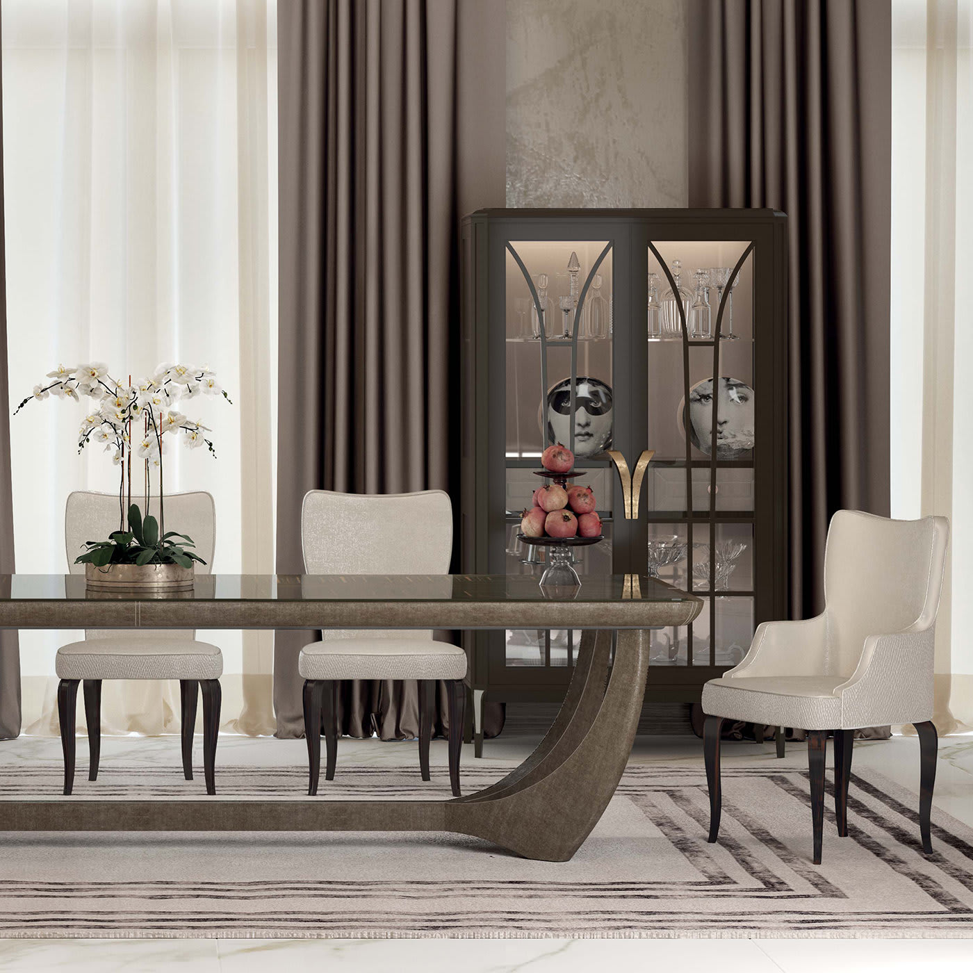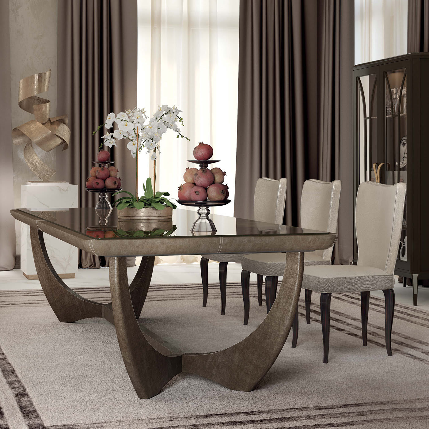 Этот стол из дерева с глянцевой столешницей и рельефным основанием, обтянутым высококачественной серой кожей, добавит изысканной элегантности в интерьер любой столовой. Отличительной чертой стола является его основание уникальной формы, образованное четырьмя изогнутыми ножками, которые сходятся в два зеркальных Y-образных элемента. Богатая столешница из насыщенного красного палисандра привносит современный шарм и изысканность в этот очаровательный стол, который украсит любой современный интерьер.