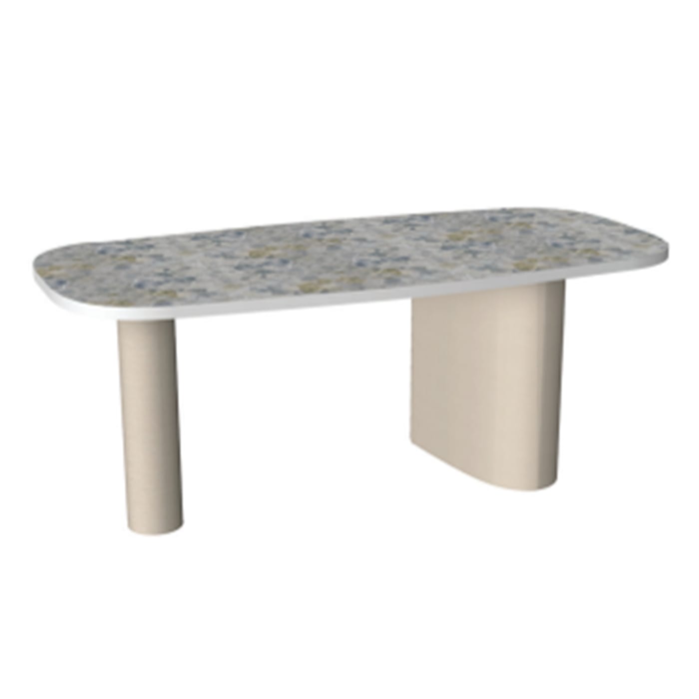 Письменный стол среднего размера, отличающийся уникальным сочетанием материалов: гладкое бежевое основание с одной цилиндрической и одной округлой опорной ножкой. Столешница украшена замысловатым узором «мадреперла», сочетающим нежные оттенки для создания утонченной эстетики. Этот стол, разработанный для того, чтобы органично вписаться в современный интерьер, сочетает в себе как функциональность, так и выразительную декоративную привлекательность.