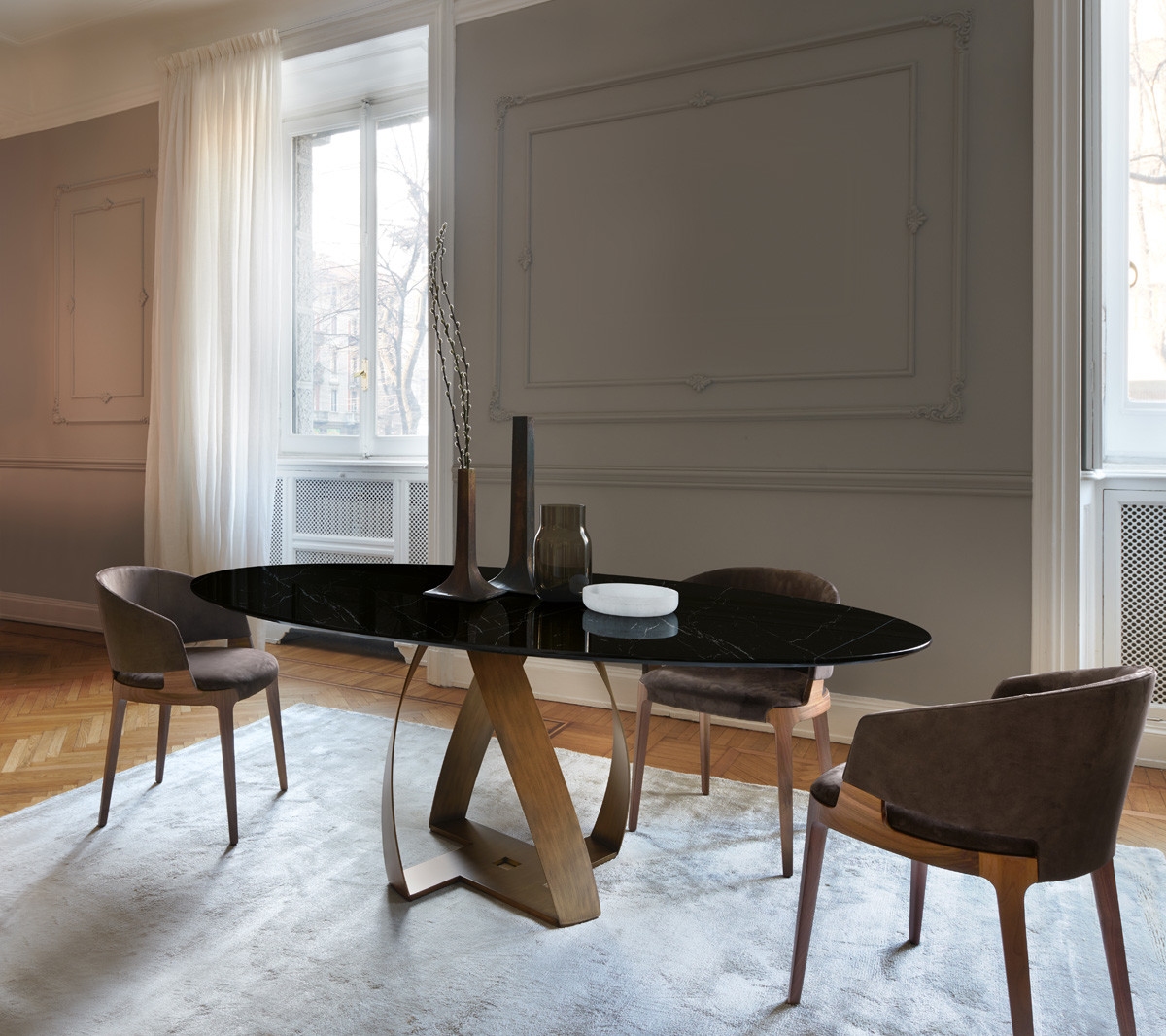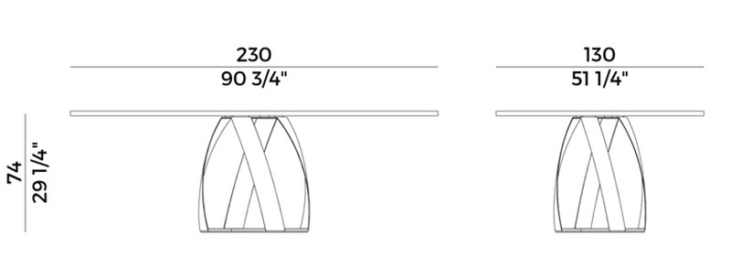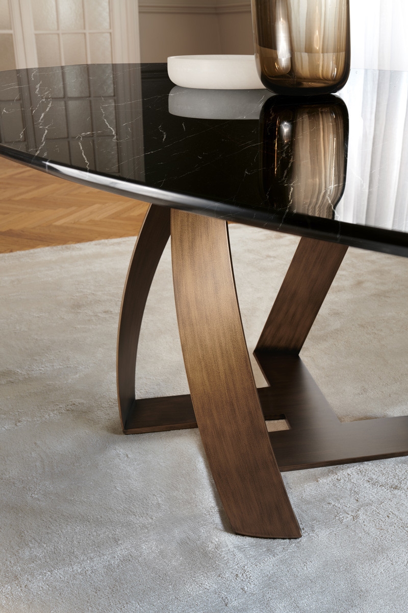Эллиптический стол Bon Bon PotoccoBon Bon, разработанный Александром Лоренцем для Potocco, представляет собой стол с металлическим основанием, окрашенным в различные цвета. Столешница имеет эллипсоидную форму и доступна из ореха каналетто, стекла или мрамора в различных вариантах отделки и размеров.