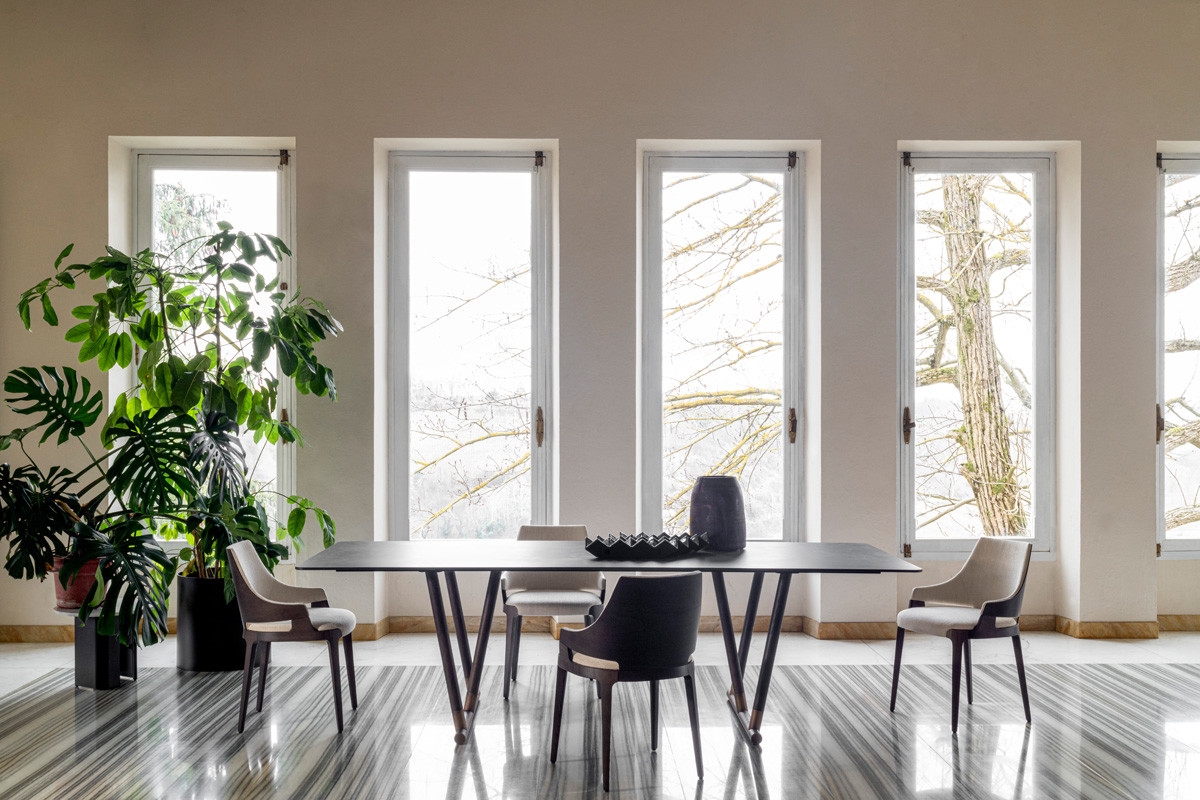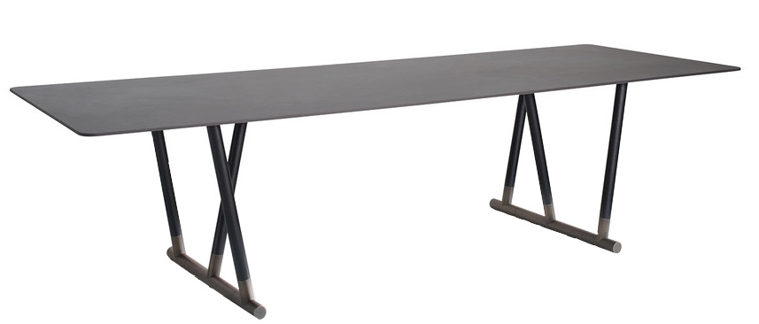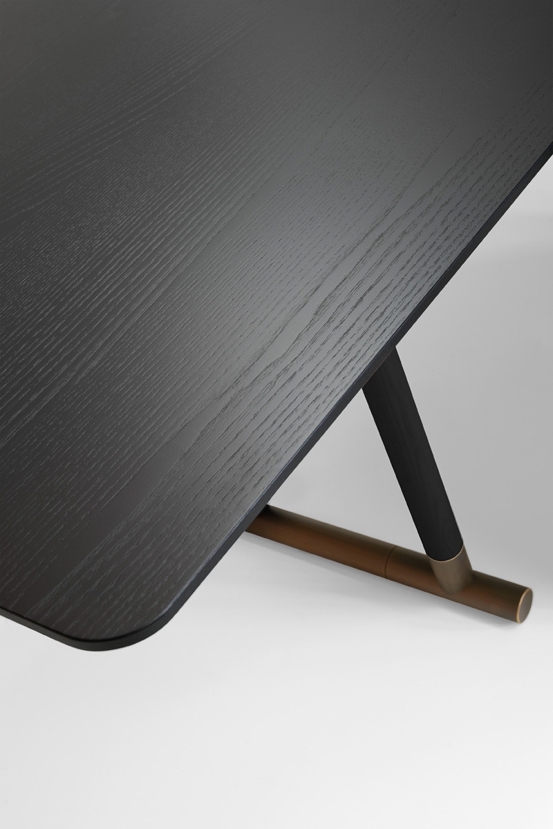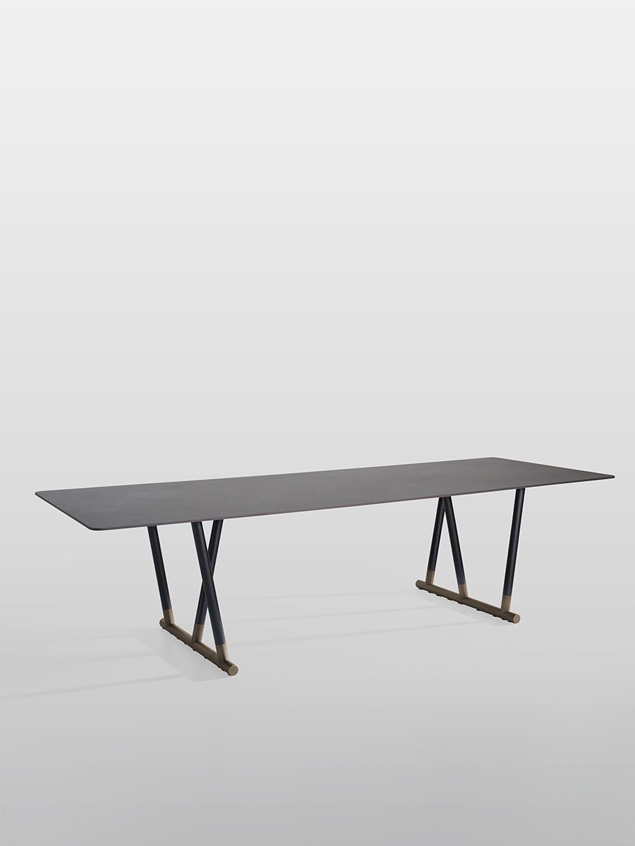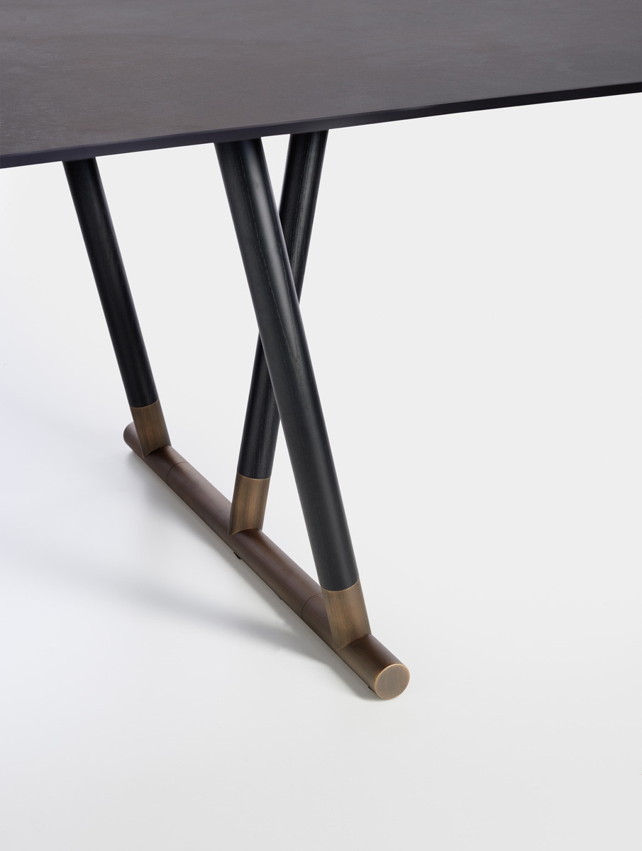 Прямоугольный стол Pipe PotoccoPipe, разработанный Favaretto & Partners для Potocco, представляет собой прямоугольный стол с основанием, состоящим из двух перевернутых козл из ясеня и металла с отделкой из полированной латуни. Столешница выполнена из ясеня, керамогранита или мрамора небольшой толщины, закруглена по углам.