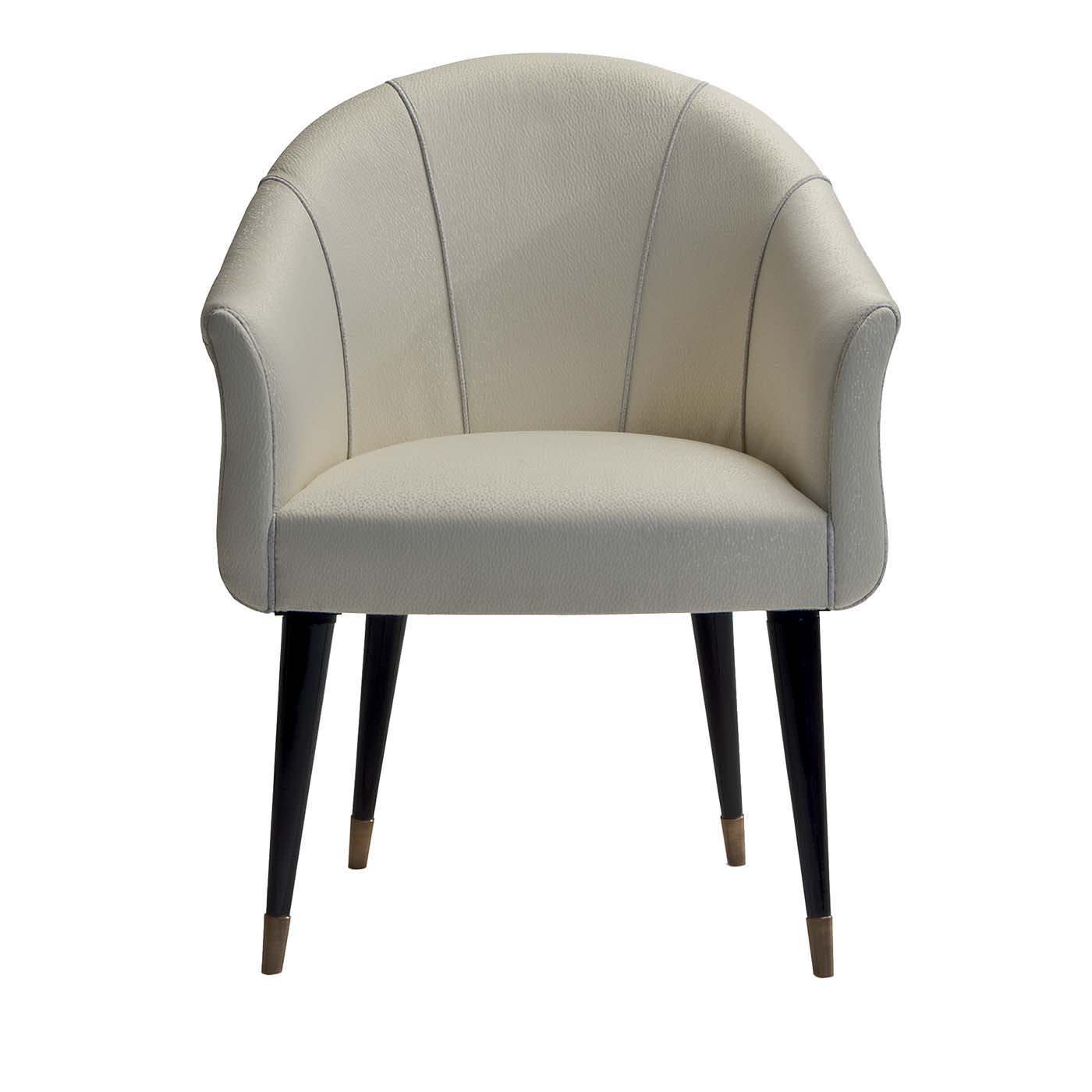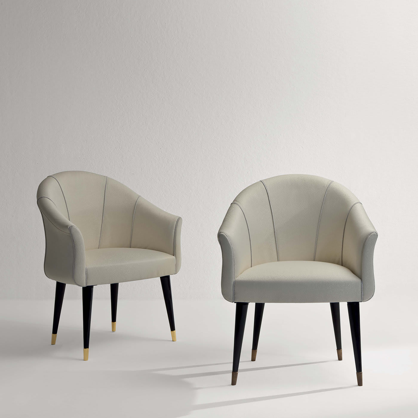 Отражая мастерство Minotti в комбинировании различных фактур для создания очаровательных предметов, это кресло-бочка отличается минималистичным, обволакивающим профилем, подчеркнутым изогнутой, закрытой спинкой и подлокотниками. Элегантный и универсальный, простой дизайн позволяет изысканной кожаной обивке ледяно-белого цвета со швами в тон занять центральное место, усиливая визуальный контраст с темными коническими ножками с бронзовыми наконечниками. Это кресло станет эффектным дополнением к обеденному столу или туалетному столику в спальне, особенно в сочетании с эффектной подушкой.