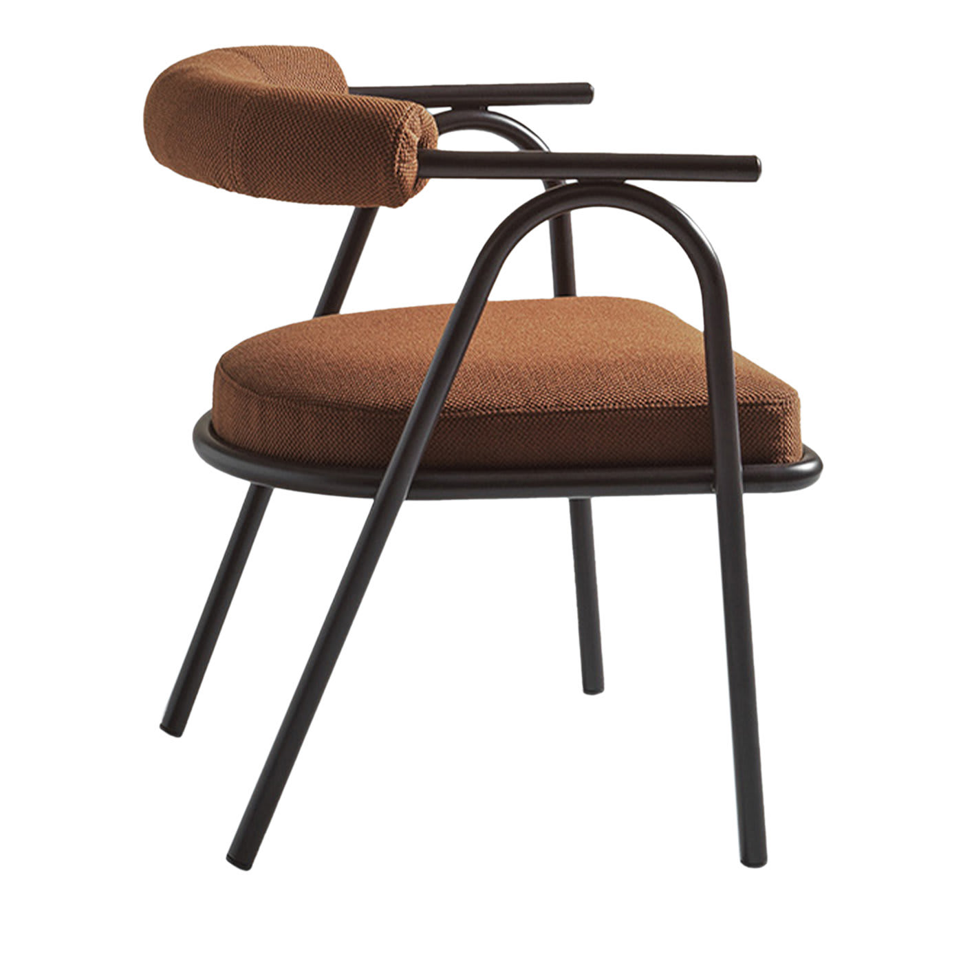 Это эксклюзивное кресло переосмысливает винтажные мотивы в современном ключе, воплощая вневременной стиль. Цилиндрический каркас из коричневой лакированной стали состоит из двух перевёрнутых V-образных элементов, служащих ножками и обрамляющих сиденье высотой 42 см. Увенчанный С-образным элементом, включающим подлокотники высотой 60 см и спинку. Цилиндрическая подушка служит мягкой опорой для спины, набита полиуретаном и обтянута фактурной тканью коричневого цвета, сочетающейся с подушкой сиденья.