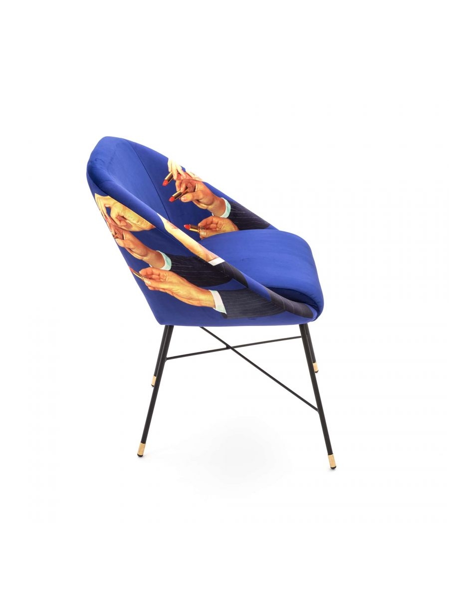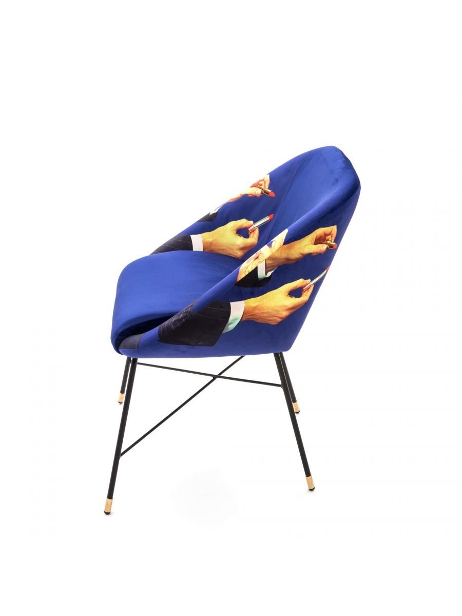 Lipsticks Seletti Chair Lipsticks, разработанные туалетной бумагой для Seletti, представляют собой стул с черными трубчатыми металлическими ножками с латунными деталями. Корпус изготовлен из фанеры с полиуретановой набивкой и полиэстеровым покрытием.