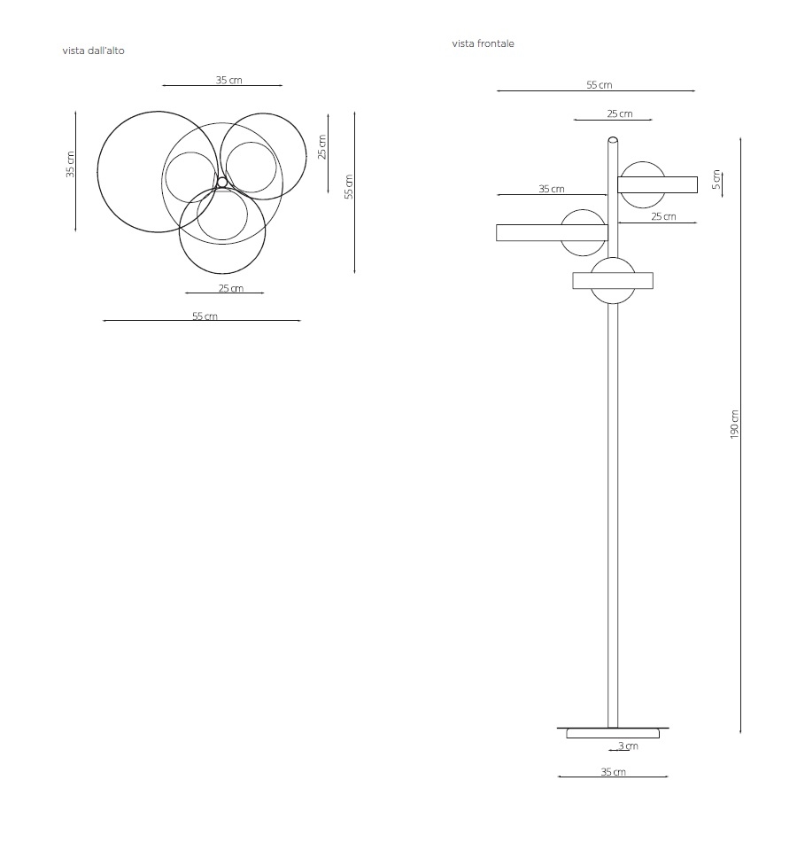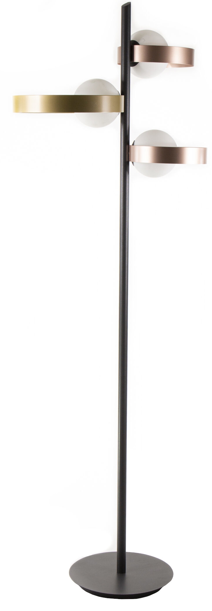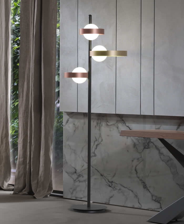 Торшер Bubble PT RiflessiBubble PT, разработанный Riflessi, представляет собой торшер, состоящий из трех окрашенных металлических колец (2 из розового золота, 1 золото) двух разных размеров. Основание с опорным стержнем графитового цвета и электрическим кабелем из черной ткани. Особенностью светильника является вращение колец из вертикального положения в горизонтальное. Источником света являются лампы из сатинового белого стекла.