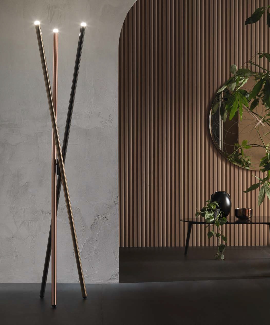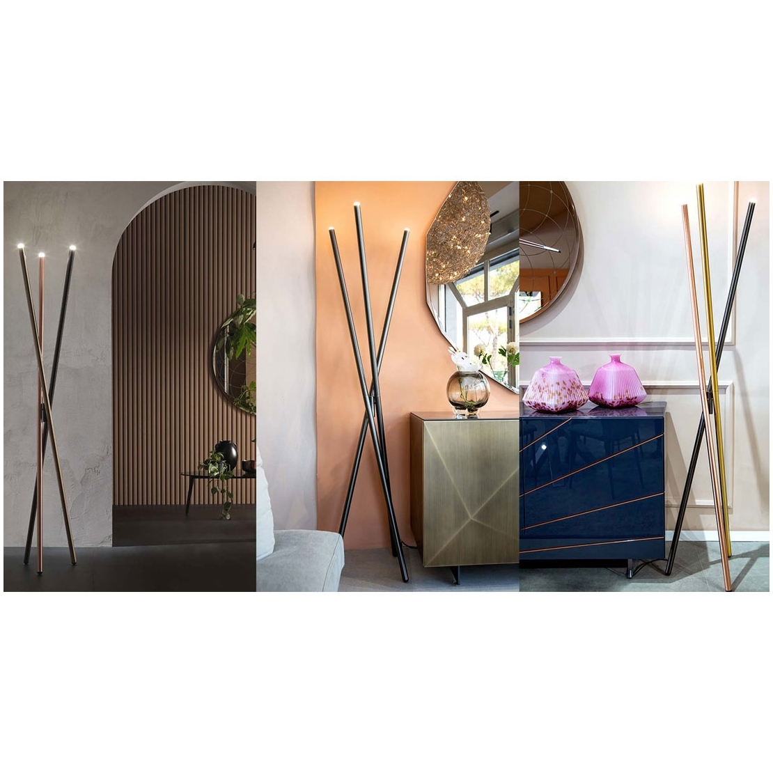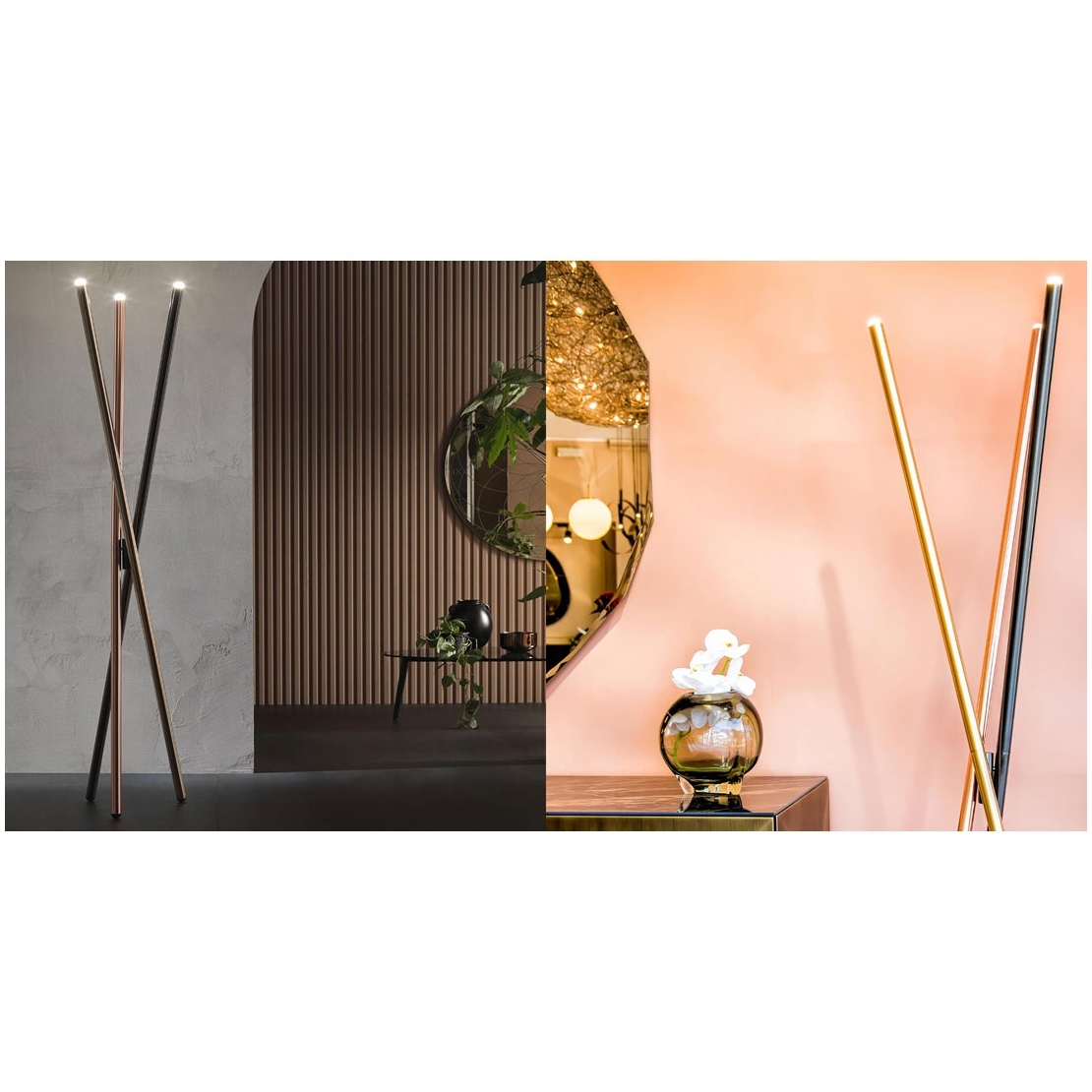 Торшер Shangai PT RiflessiShangai PT, разработанный Riflessi, представляет собой торшер, состоящий из трех металлических трубок, окрашенных гальванически сатинированной обработкой. Фонарь состоит из трех светодиодов фиксированного направленного действия. Электрический кабель в черной ткани.
