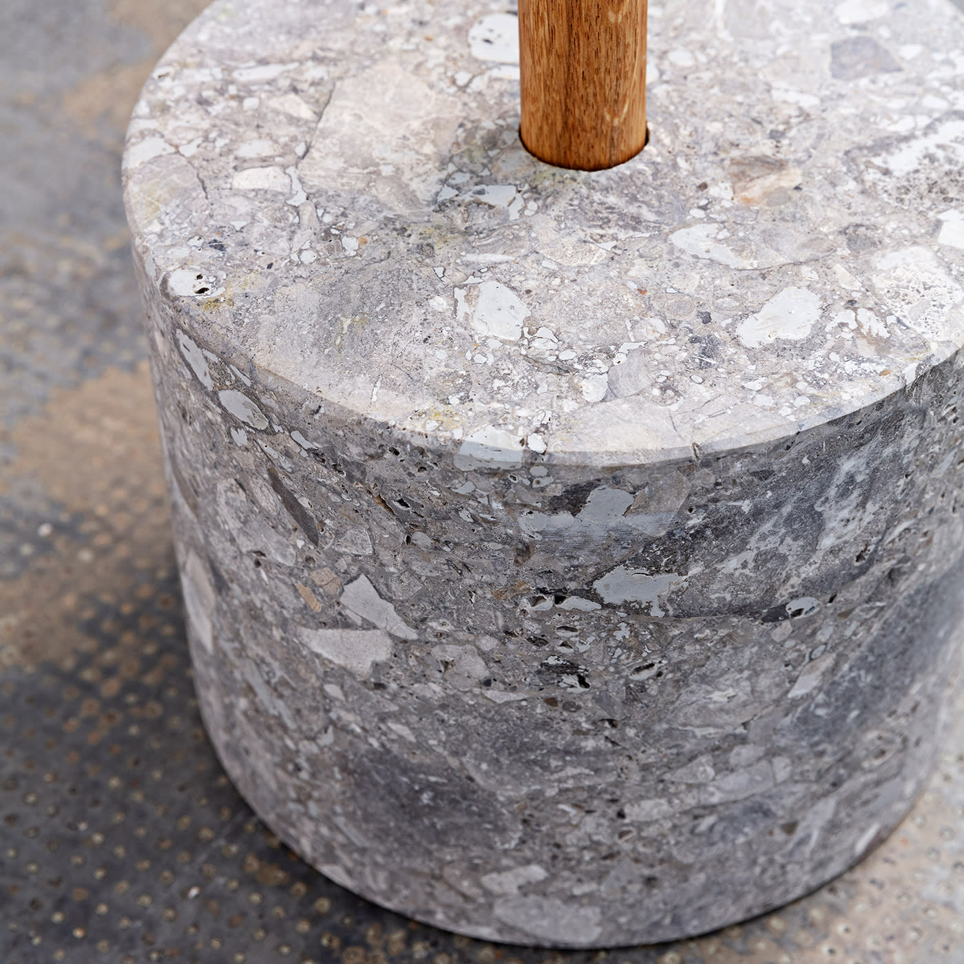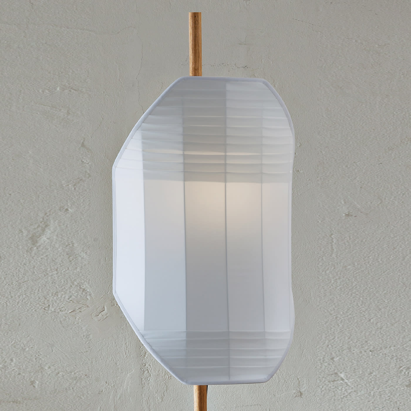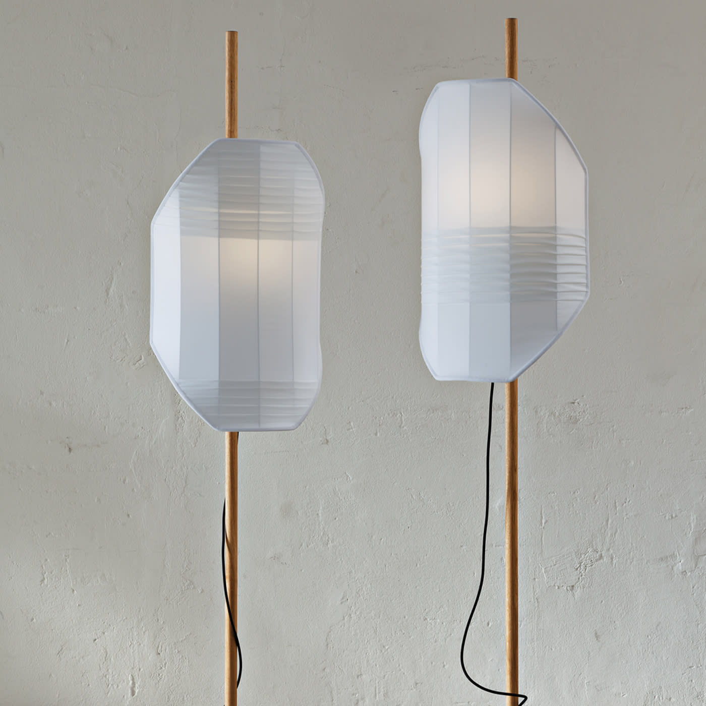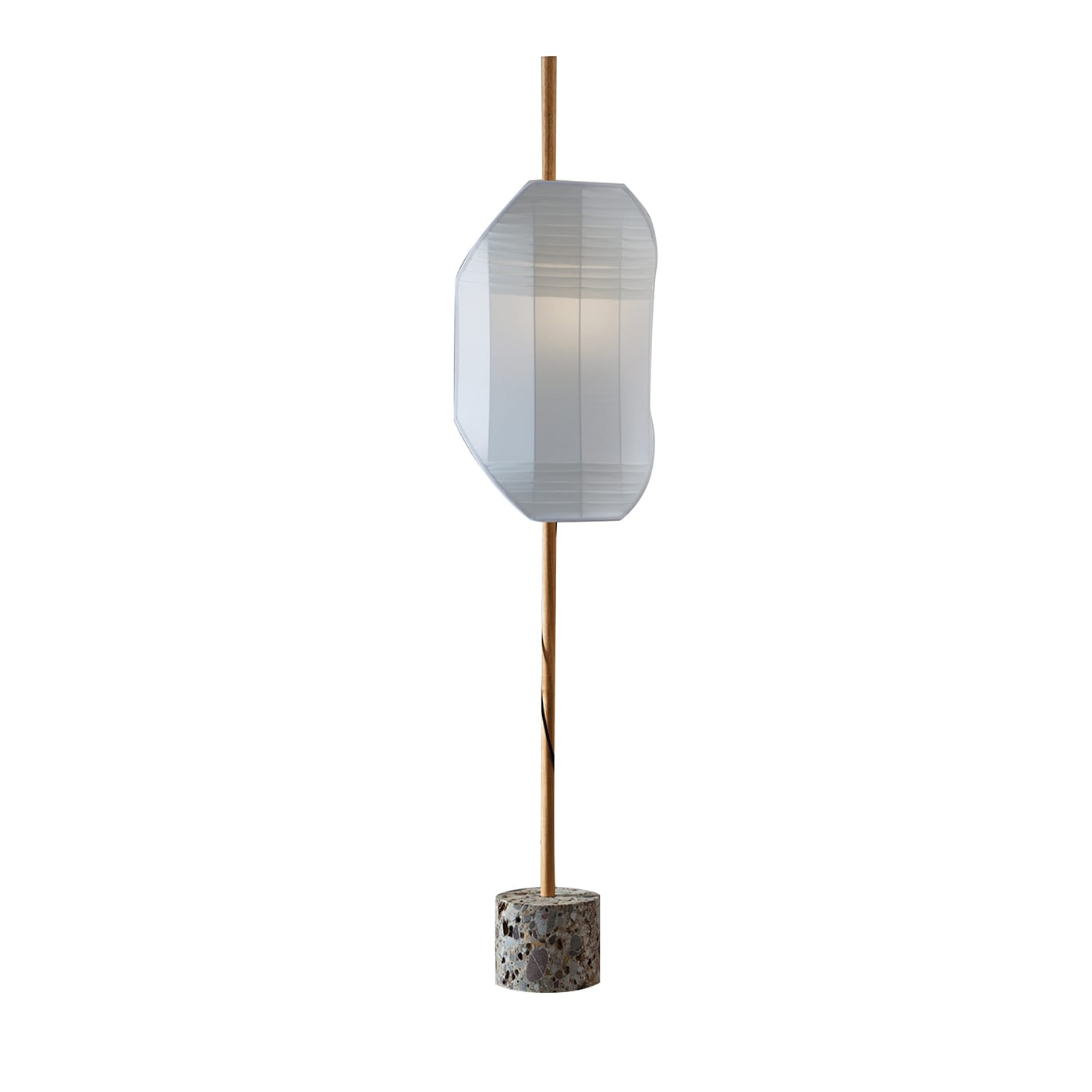 Этот светильник вдохновлён изображением флага, вбитого в камень, как жеста, отмечающего место вдали от проторенных дорог. Люминесцентный экран подвешен на дубовом шесте, вмонтированном в круглый камень «чеппо ломбардо». Основные цвета хлопковых экранов напоминают сигнальные флаги, а плиссировка создаёт изящный графический узор. Абажур выполнен из хлопковой ткани ручной сборки. Подробности можно узнать у консьержа.