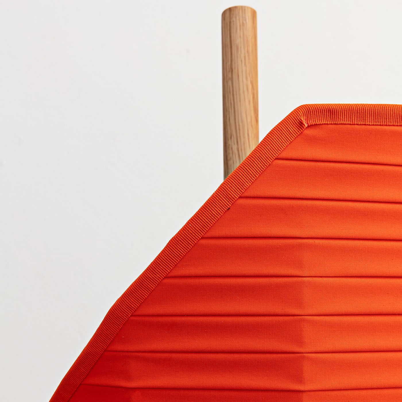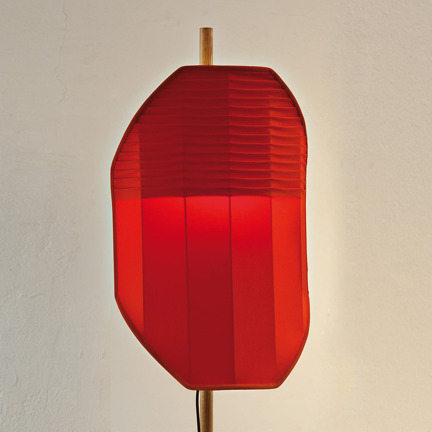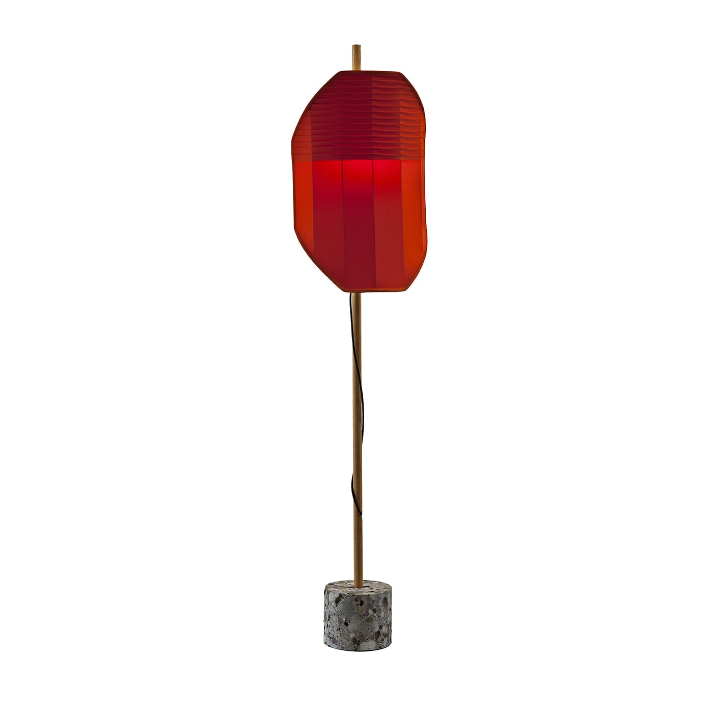 Этот светильник вдохновлён изображением флага, вбитого в камень, как жеста, отмечающего место вдали от проторенных дорог. Люминесцентный экран подвешен на дубовом шесте, вмонтированном в круглый камень «чеппо ломбардо». Основные цвета хлопковых экранов напоминают сигнальные флаги, а плиссировка создаёт изящный графический узор. Абажур выполнен из хлопковой ткани ручной сборки. Подробности можно узнать у консьержа.