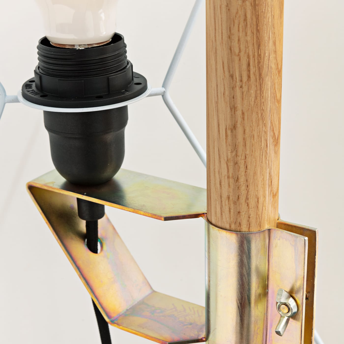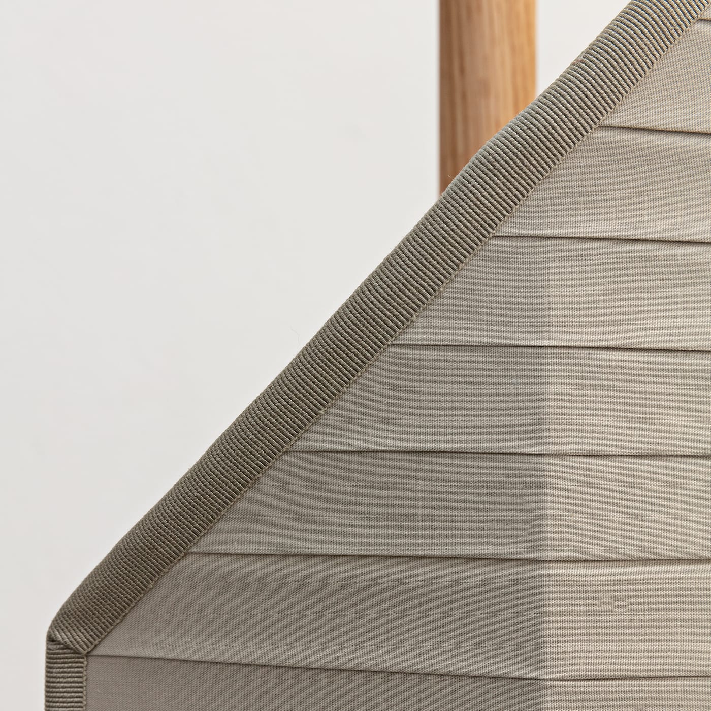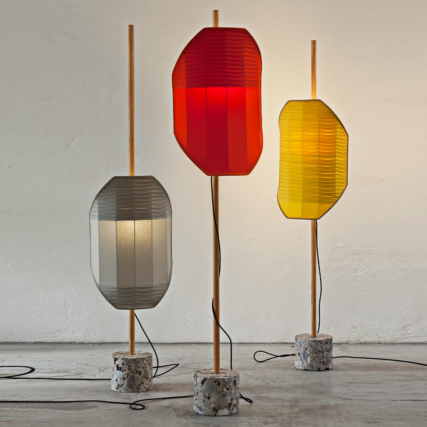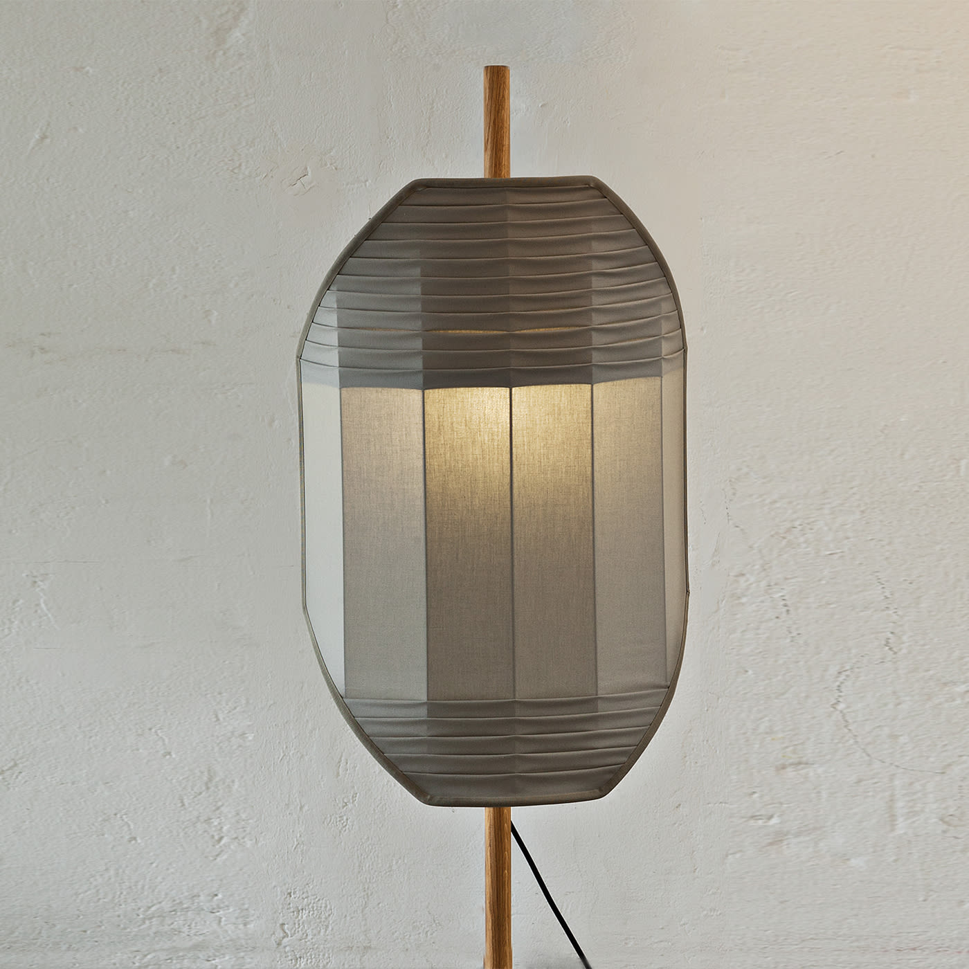 Этот светильник вдохновлён изображением флага, вбитого в камень, как жеста, отмечающего место вдали от проторенных дорог. Люминесцентный экран подвешен на дубовом шесте, вмонтированном в круглый камень «чеппо ломбардо». Основные цвета хлопковых экранов напоминают сигнальные флаги, а плиссировка создаёт изящный графический узор. Абажур выполнен из хлопковой ткани ручной сборки. Подробности можно узнать у консьержа.
