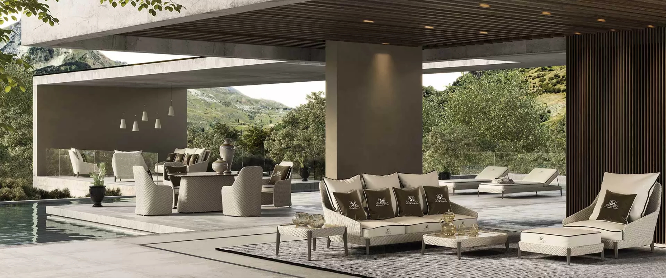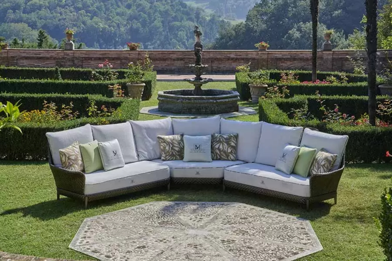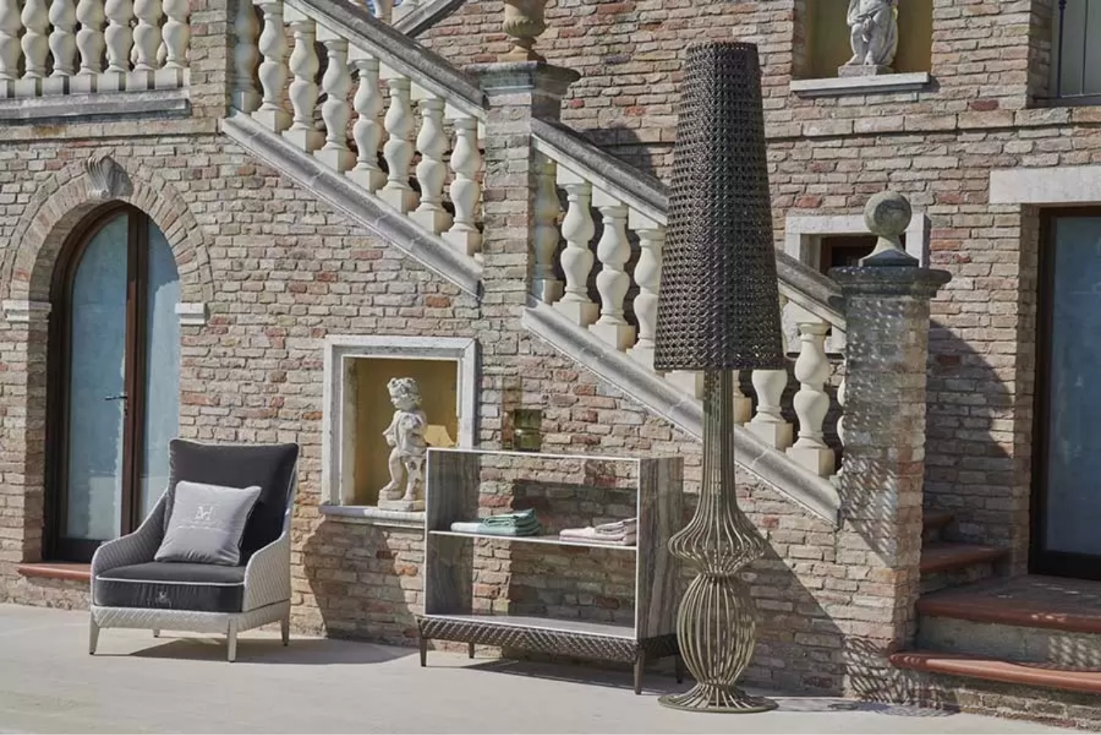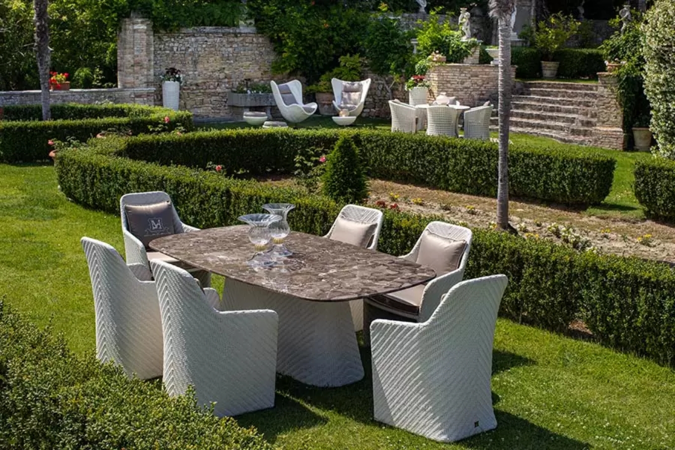 Вдохновленная рационалистическими и современными идеями, Kenzia представляет собой серию предметов с линейным, но изысканным дизайном. Верная концепции total look, сопровождающей каждое творение Samuele Mazza, линия Kenzia предлагает множество элементов и аксессуаров для комплексного оформления открытого пространства. Стиль Kenzia отличается простотой. Линии здесь базовые: прямые подлокотники соединяются со спинкой в единую конструкцию, дополненную удобной подушкой. Высокая спинка и богатые подушки создают камерную зону отдыха, где можно расслабиться и приятно провести время на открытом воздухе. Модульная конструкция допускает различные комбинации, включая Г-образную компоновку дивана. Обеденная версия Kenzia включает элегантный стол-мост с чрезвычайно утонченным исполнением из плетеного синтетического ротанга, создающего плотную фактуру и эффектную игру материала. Основание стола имеет трапециевидную форму, на которую можно устанавливать различные типы столешниц. Это динамичная, продуманная и насыщенная программа предметов для открытого воздуха с тонкими деталями, где ремесленное мастерство и ручная работа лежат в основе каждого изделия.