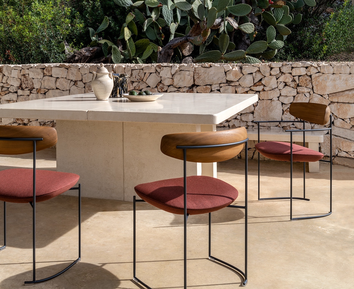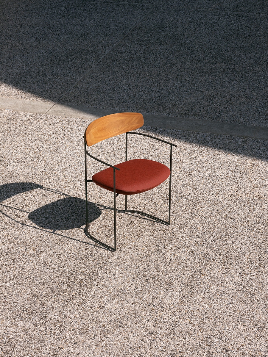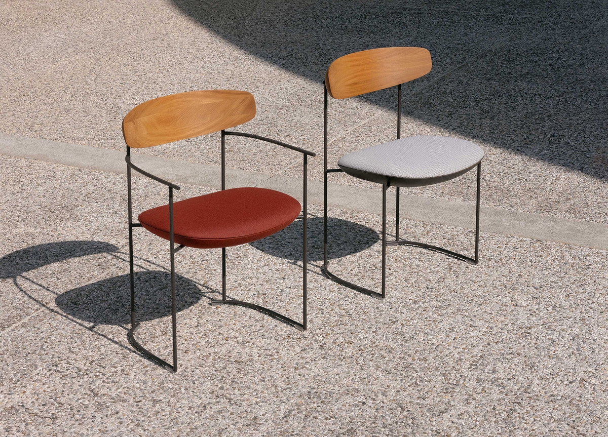 Keel Outdoor Potocco ChairKeel Outdoor, разработанный M + V для Potocco, представляет собой уличный стул с тисненой окрашенной металлической стержневой структурой, спинкой из массива Iroko и мягким сиденьем из огнестойкого вспененного полиуретана с покрытиями из различных тканей для улицы. Доступен с подлокотниками или без них.