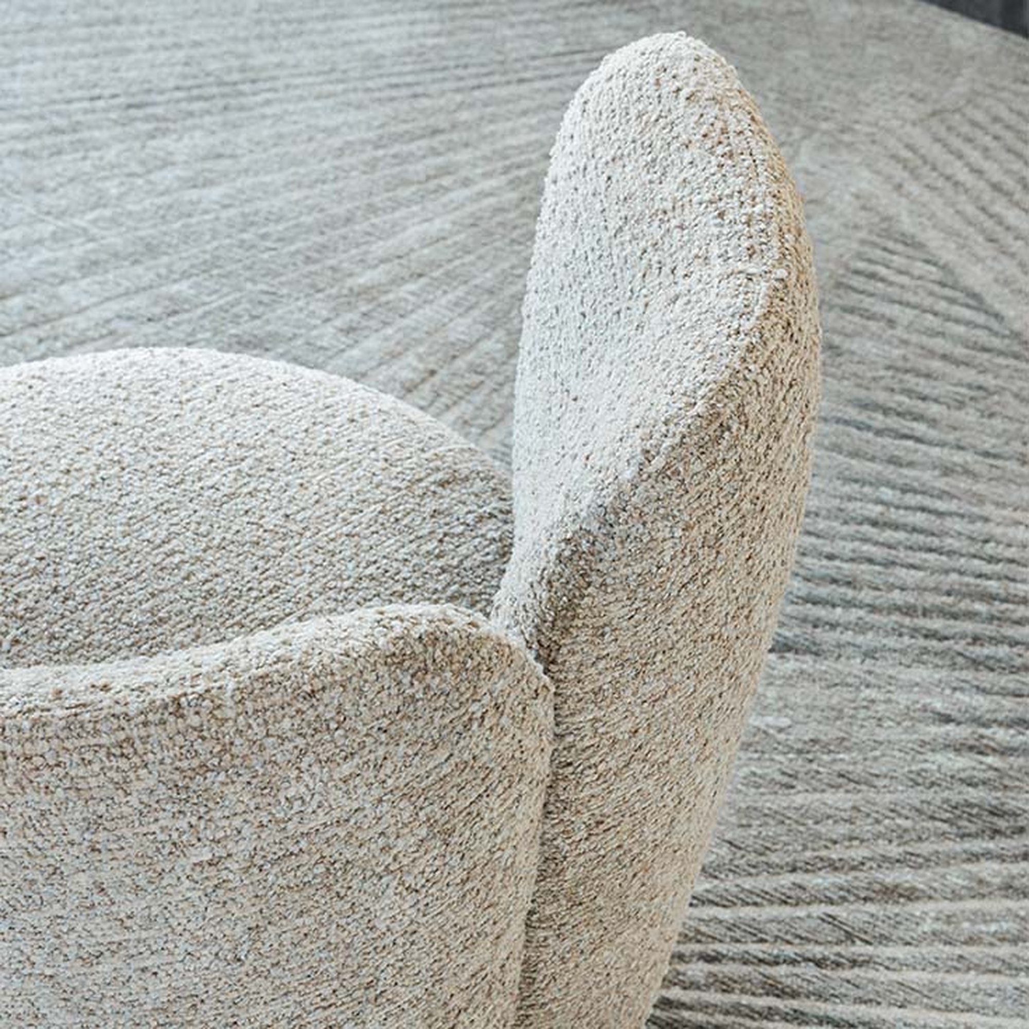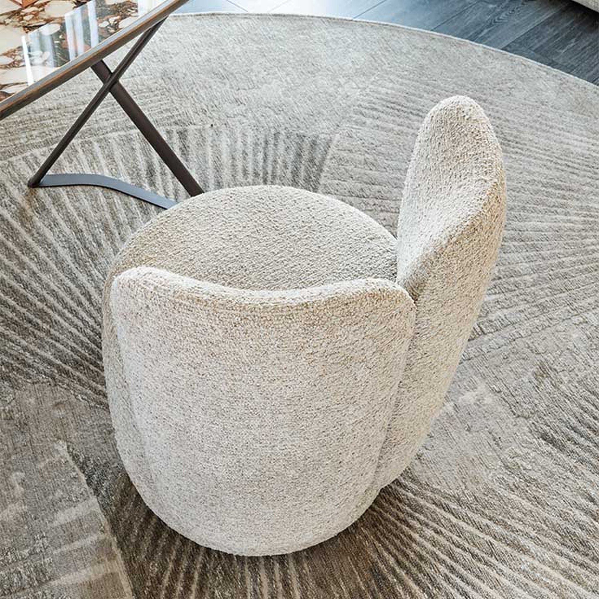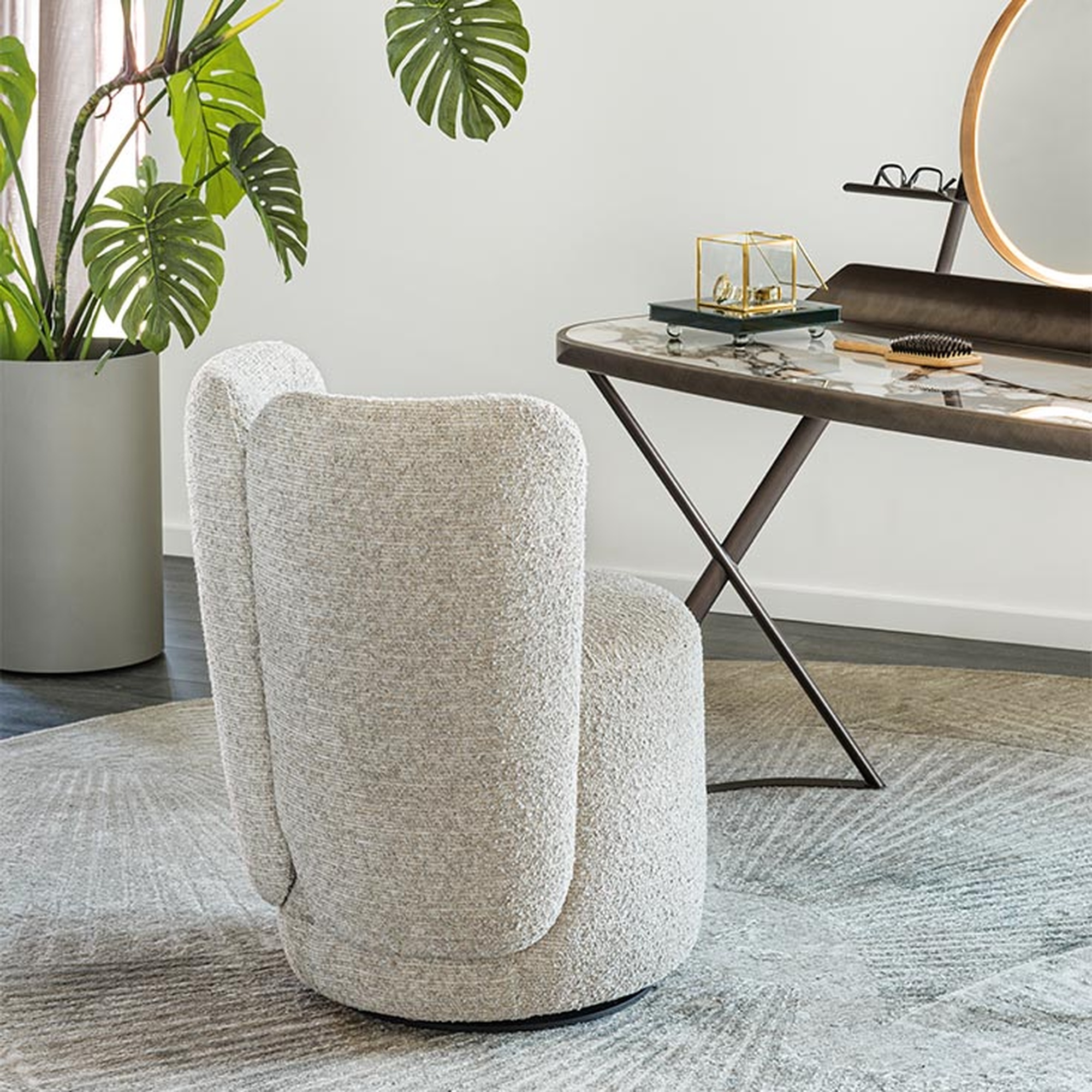 Благодаря цельному напольному основанию кресло Britney Turn эффектно смотрится как одиночный акцент у туалетного столика или в зоне ожидания. А в паре с массивным столом на скульптурной базе оно превращает обеденную группу в архитектурную доминанту. Обивка — износостойкая ткань (чехол несъёмный). Габариты: 66×61×80h.