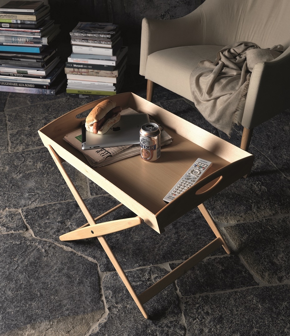 Журнальный столик Mate DePadova Mate, разработанный Ахиллом Кастильони для DePadova, представляет собой журнальный столик со складным основанием и структурой из массива натурального бука или массива ясеня угольно-серого цвета и синими хлопковыми ремнями. Столешница из березовой фанеры.
