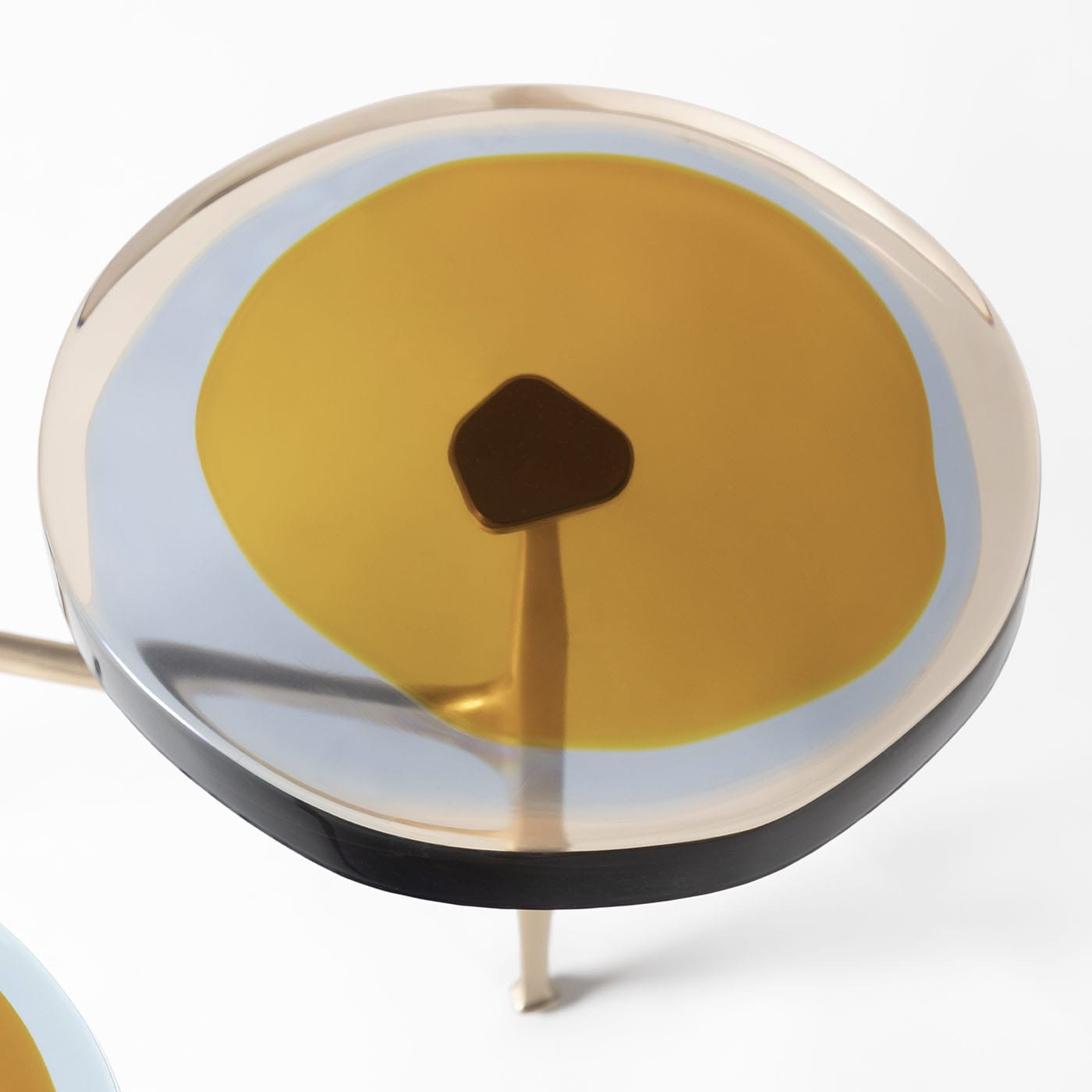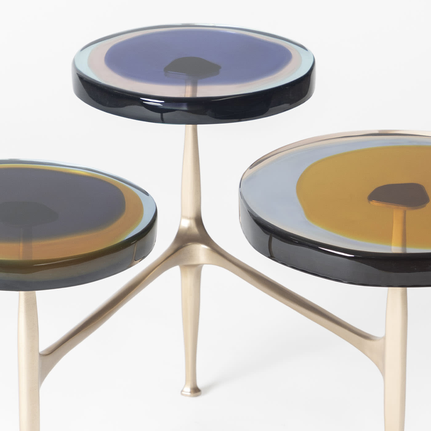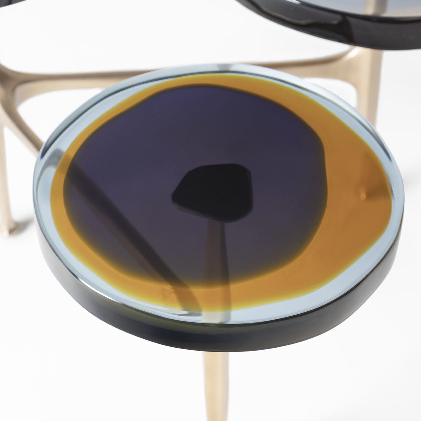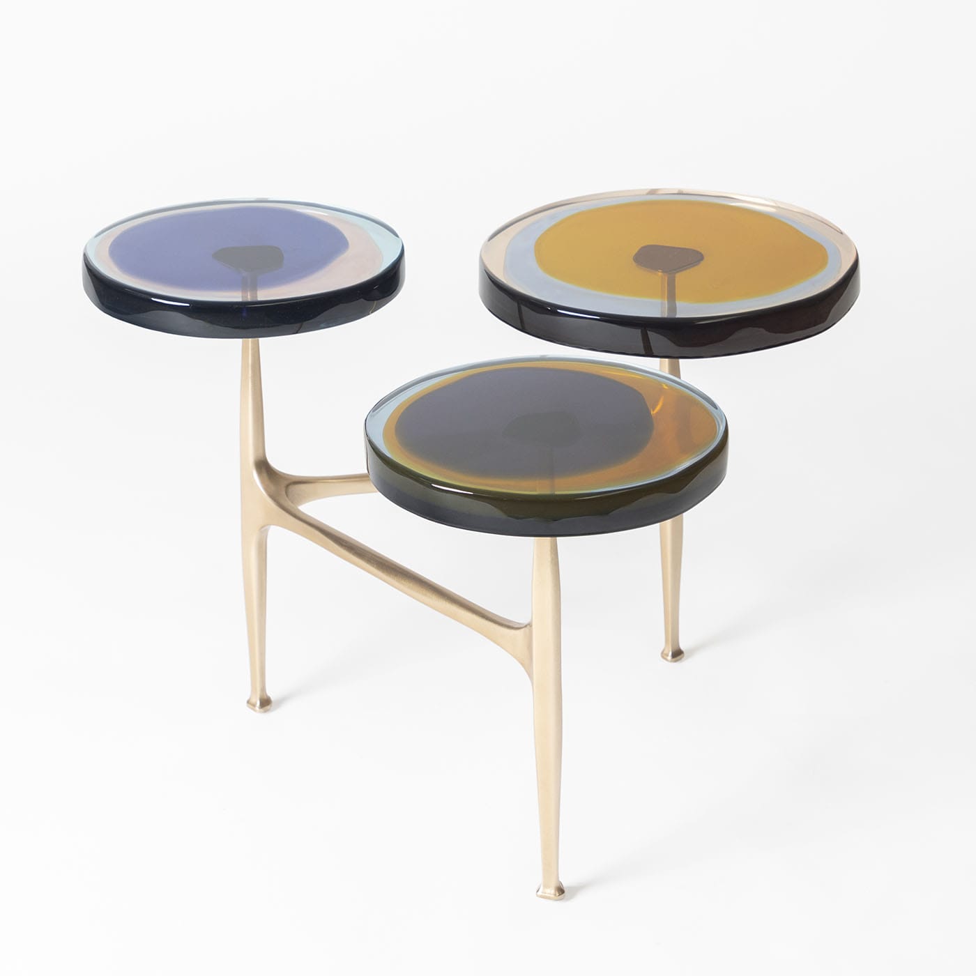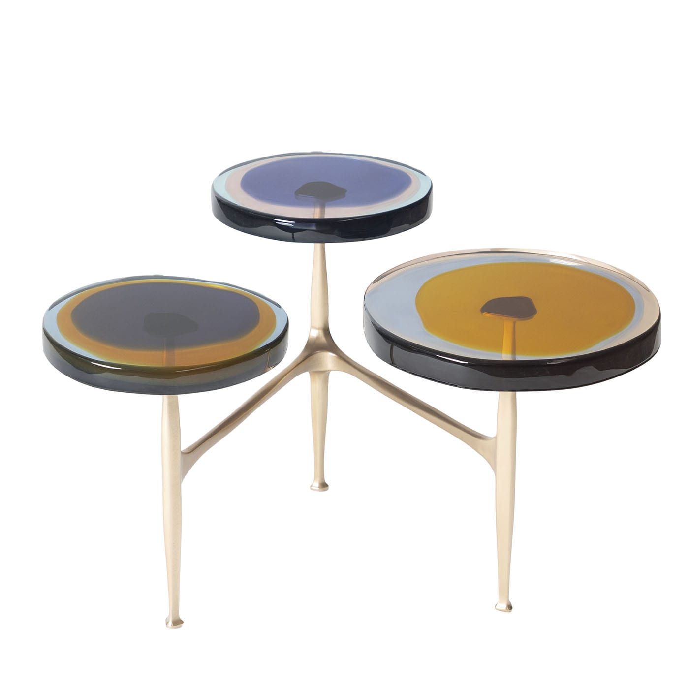 Гроздья полевых цветов вдохновили серию журнальных столиков Agatha с несколькими столешницами, отличающимися органичными формами и яркими оттенками. Неровные круглые столешницы из прозрачной эпоксидной смолы закреплены на матовой бронзовой раме. Наши мастера отливают их вручную в несколько слоёв, создавая яркие, текучие композиции. Доступны различные цвета.