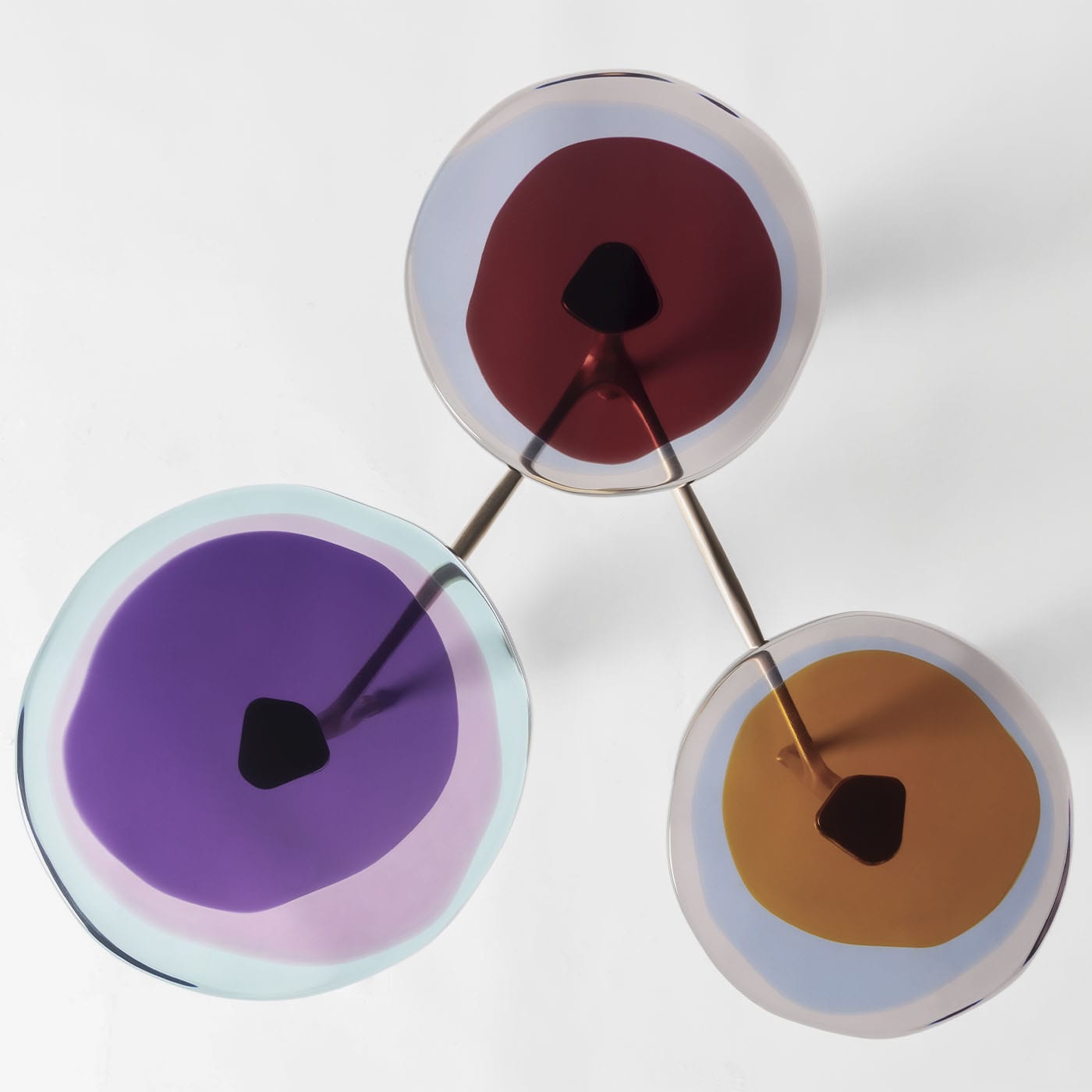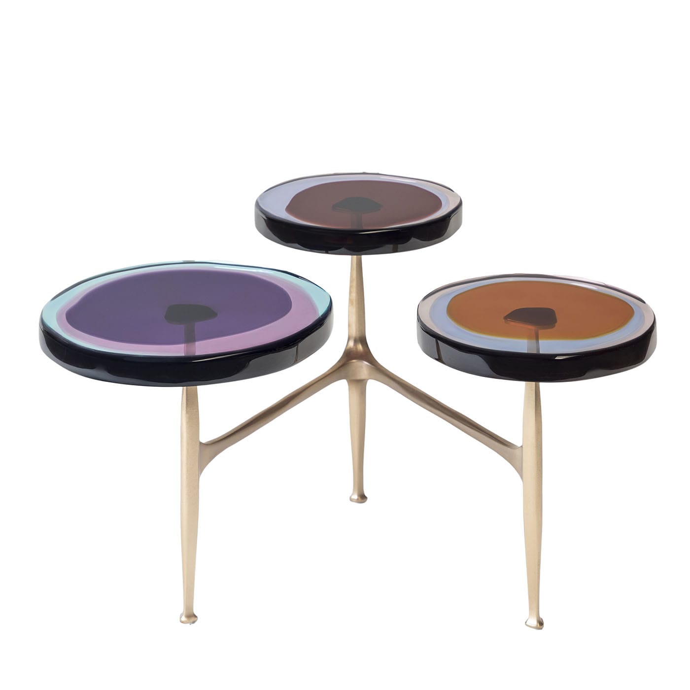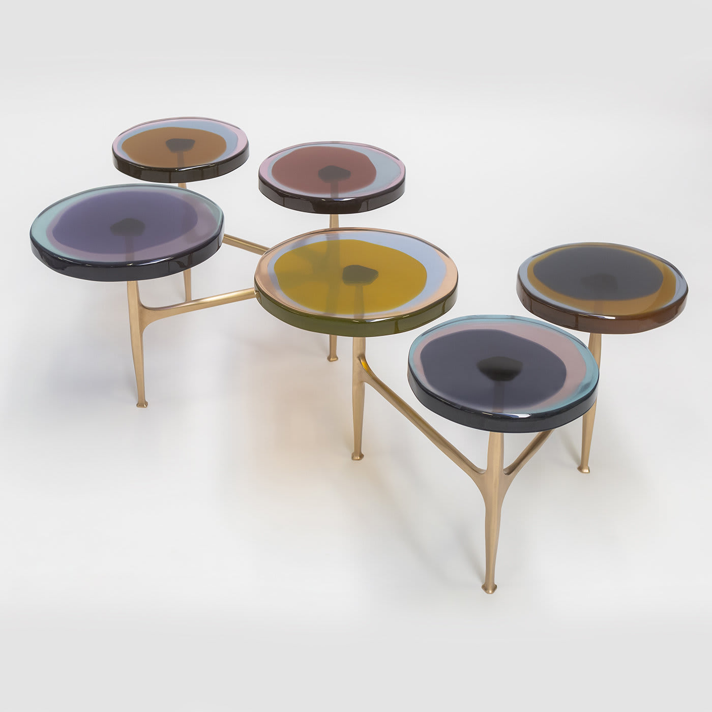Гроздья полевых цветов вдохновили серию журнальных столиков Agatha с несколькими столешницами, отличающимися органичными формами и яркими оттенками. Неровные круглые столешницы из прозрачной эпоксидной смолы закреплены на матовой бронзовой раме. Наши мастера отливают их вручную в несколько слоёв, создавая яркие, текучие композиции. Доступны различные цвета.