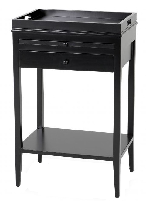 Приставной столик Broomer Eichholtz Приставной столик Broomer, разработанный Eichholtz, представляет собой приставной столик с черной отделкой, столешницей с подносом, удлинением и нижней полкой.