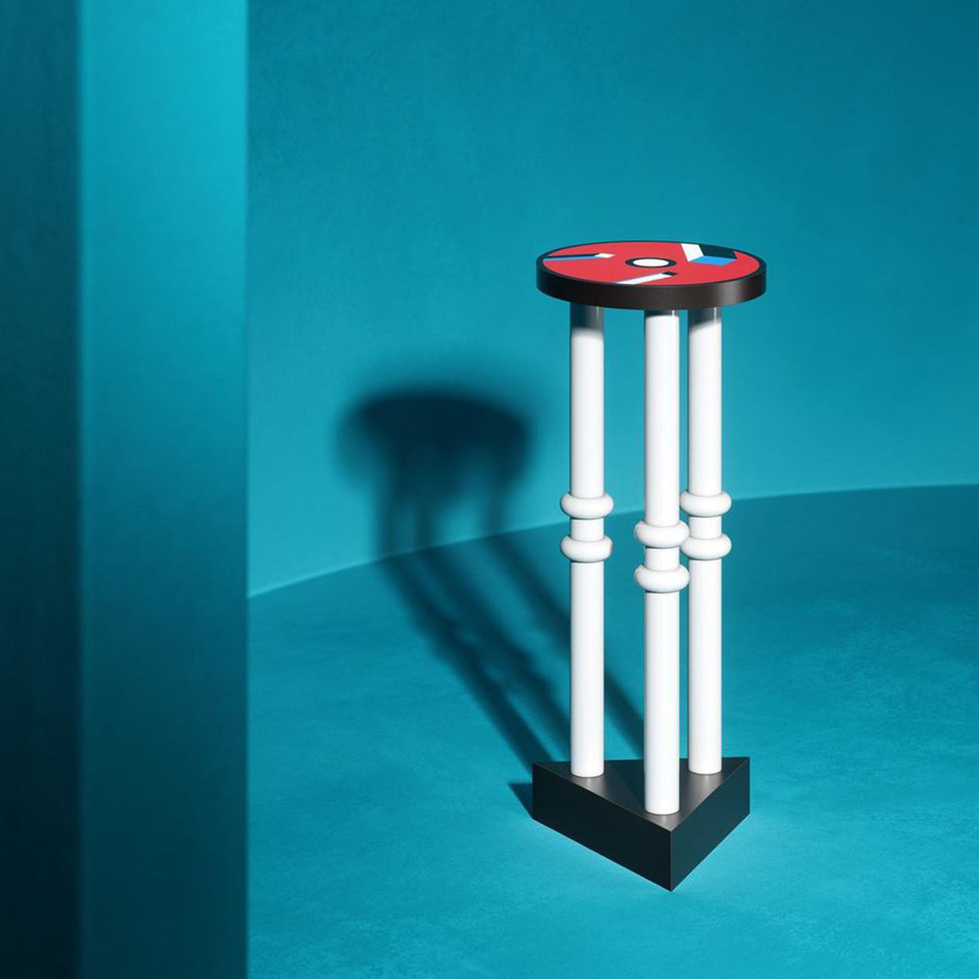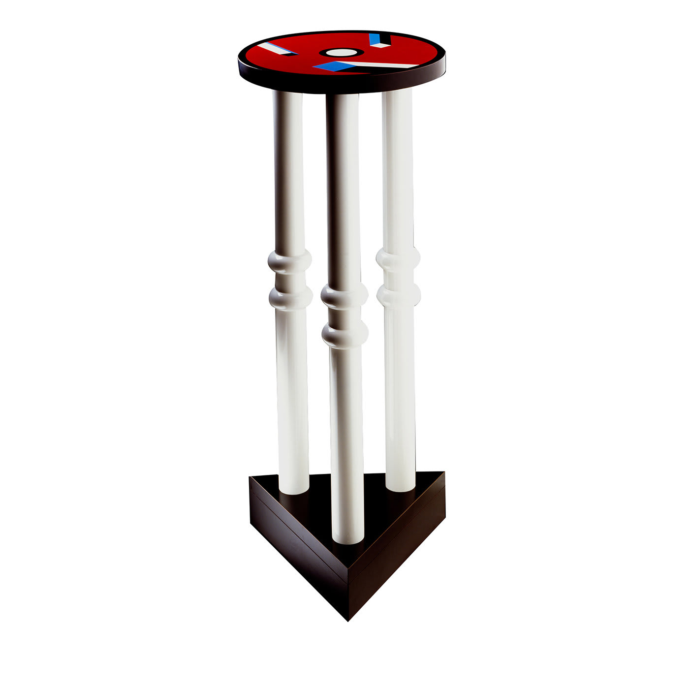 Этот потрясающий приставной столик, спроектированный Натали Дю Паскье в 1986 году и изготовленный из пластикового ламината, обладает постмодернистским стилем благодаря сочетанию геометрических форм, подчеркнутых насыщенными цветами. Треугольное чёрное основание поддерживает три белые цилиндрические ножки, каждая из которых украшена двумя кольцами, и круглую столешницу, расписанную абстрактным орнаментом. Этот столик, воплощающий смелую эклектику, станет эффектным дополнением к современному интерьеру.