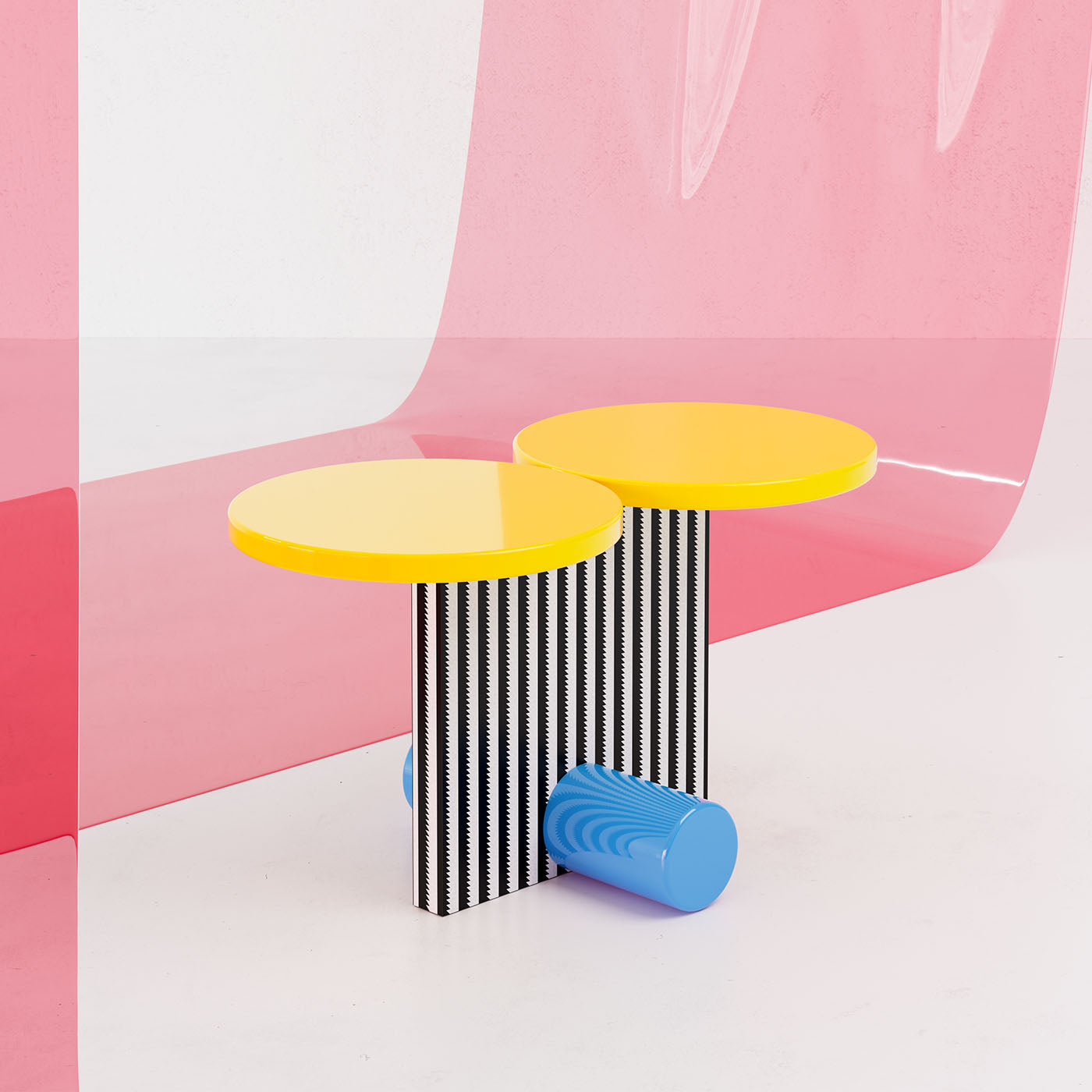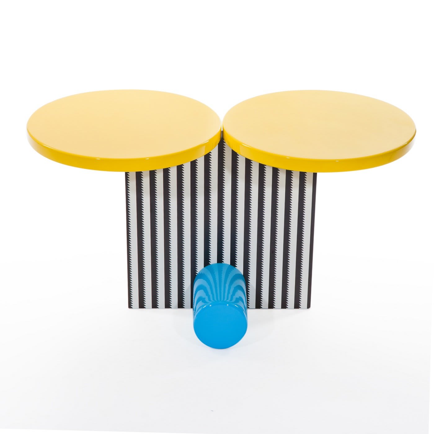 Этот предмет, разработанный Микеле Де Лукки для Мемфиса, был создан в 1984 году и отличается характерными постмодернистскими чертами эстетики этой художественной группы. Структура из пластикового ламината представляет собой вертикальный элемент, украшенный чёрно-белым узором и подчёркнутый синим цилиндром у основания, поддерживающим два жёлтых диска в верхней части, что позволяет разместить любой предмет или коллекционный предмет в современной гостиной или кабинете.