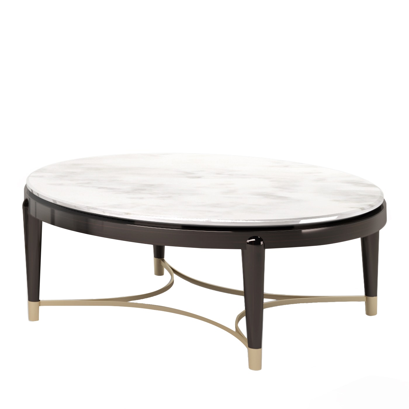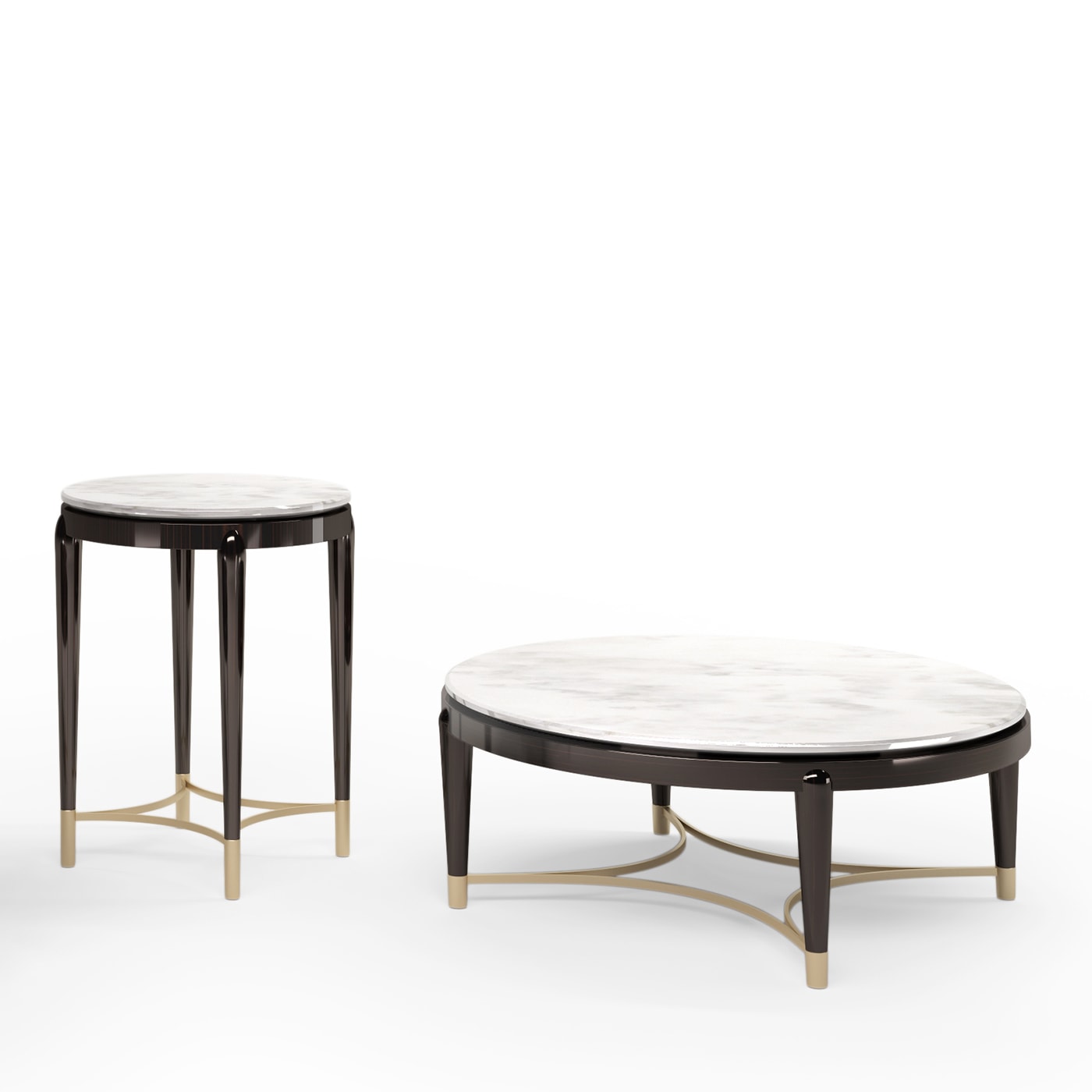 Этот шикарный журнальный столик воплощает изысканную простоту благодаря своему классическому дизайну, дополненному использованием драгоценных материалов. Элегантная круглая столешница выполнена из мрамора Калакатта Вальи с янтарными прожилками и серыми оттенками, гармонично дополняя как деревянный каркас, так и металлическое основание, которое играет вогнутыми и выпуклыми формами в чувственном стиле. Отделка дерева под черное дерево в сочетании с яркой полированной матово-золотой отделкой металла создает смелый визуальный эффект. Этот приставной столик можно сочетать с высоким столиком в современной гостиной, создавая изысканный образ.