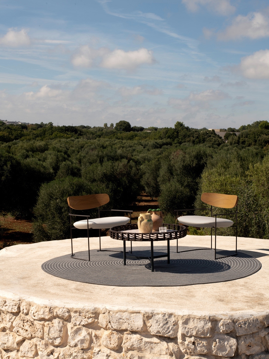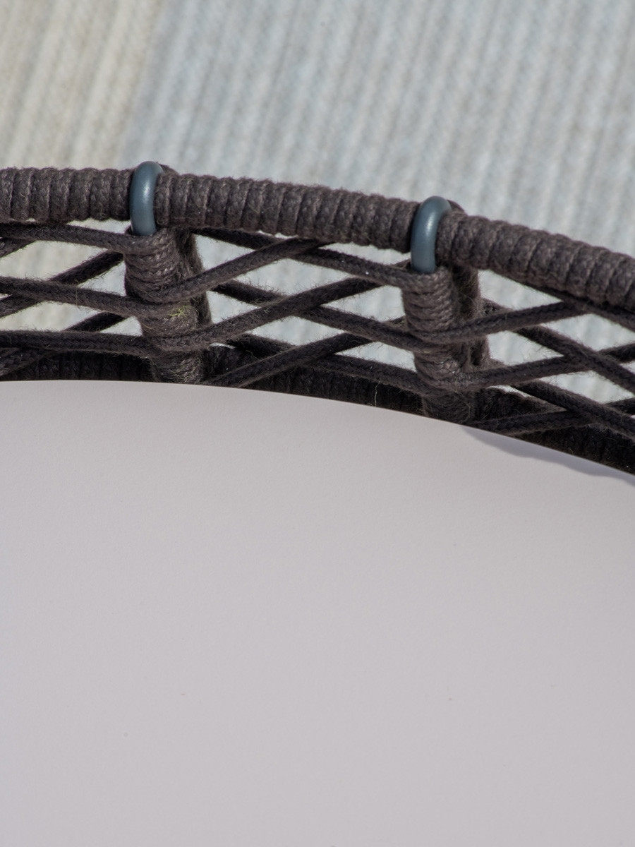 Журнальный столик Ropu Outdoor PotoccoRopu Outdoor, разработанный Кьярой Андреатти для Potocco, представляет собой уличный журнальный столик с основанием из тисненого металла, окрашенного в антрацитовый цвет, и рамой с темно-коричневым плетением шнура «Гасса». Столешница из керамогранита HPL антрацитового цвета или черного оксида.